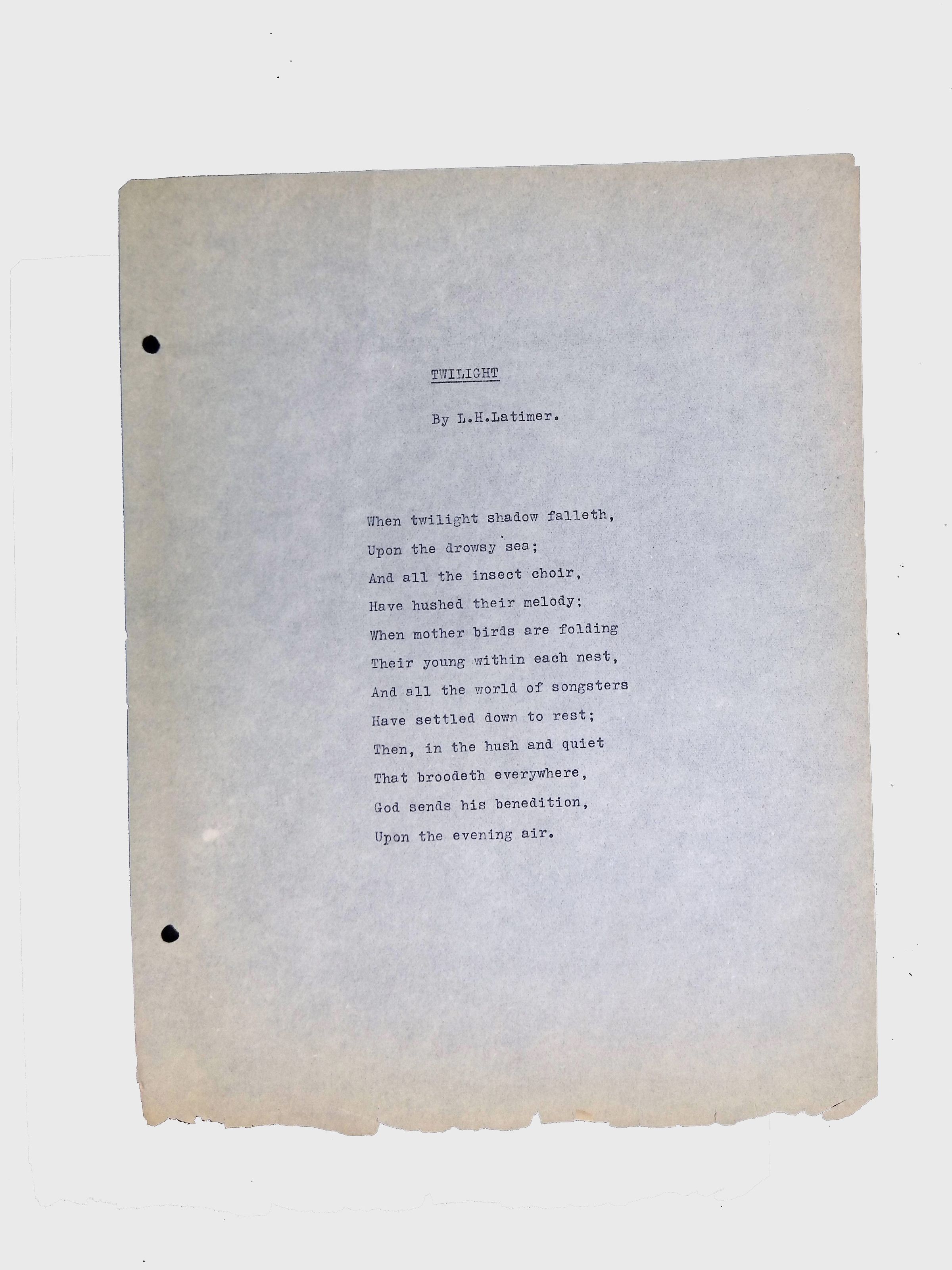 These materials provide a glimpse into Latimer’s intellectual and creative side, illustrating his thoughts on the social issues of his time. His poetry and prose offer insight into his life experiences, personal beliefs, and the broader African American experience during his lifetime.Location