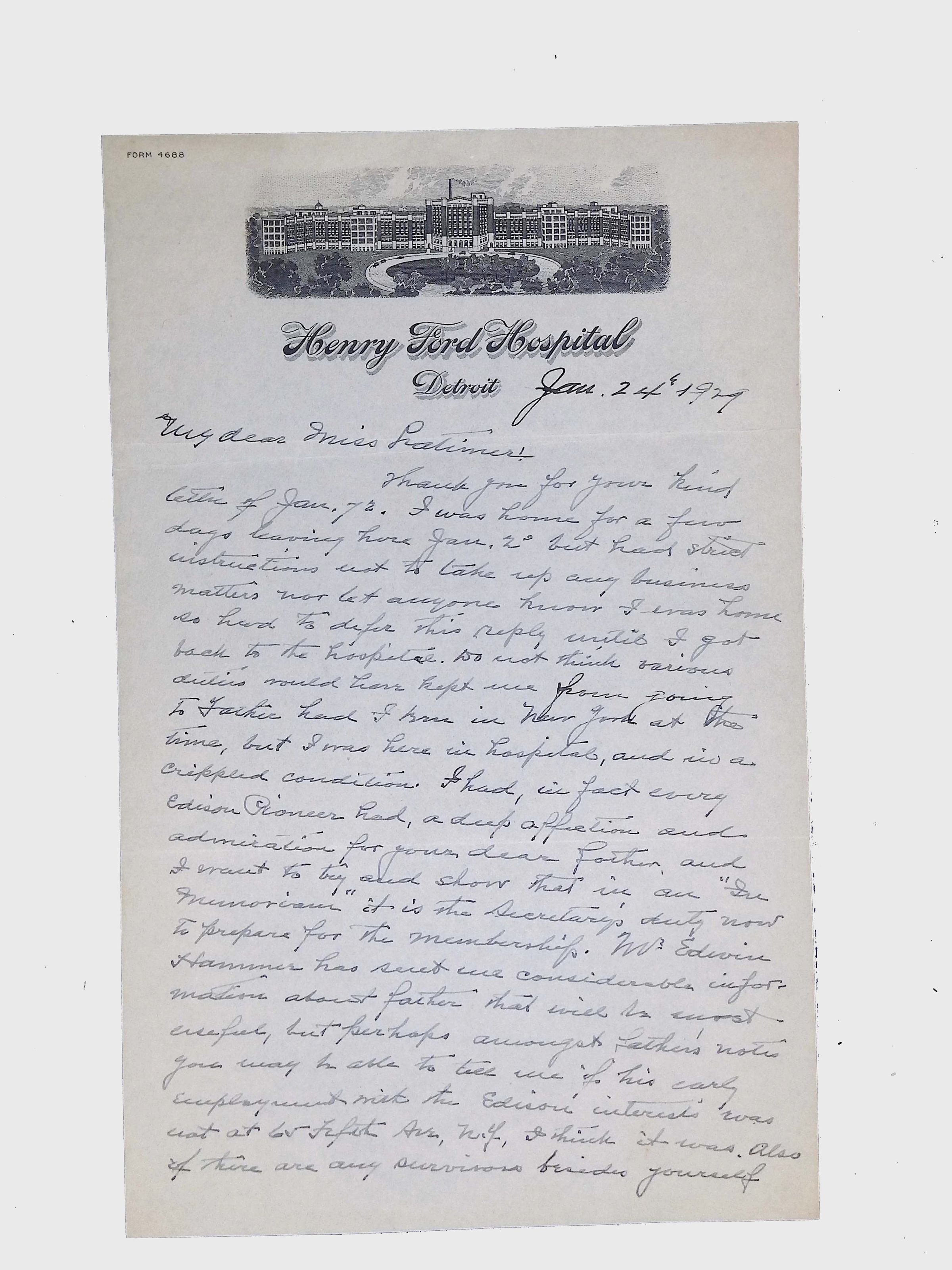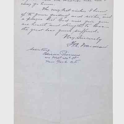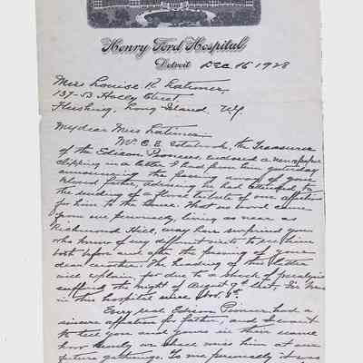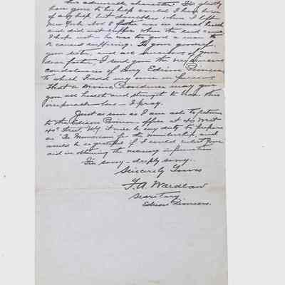 This folder contains letters by Frank A. Wardlaw, Secretary of the Edison Pioneers, to Louise Latimer in 1928-29 discussing his “In Memoriam” piece written after Lewis Latimer’s death, his condolences, and reminiscences about Latimer. It also contains correspondence from Albert Morris to Louise Latimer in 1956, with reference to “A Short Biography of Lewis Latimer” written by Morris, and other matters. Official Business Letters: Correspondence from various companies and institutions, some bearing official letterheads. Personal Letters: Handwritten letters between family members and associates. Legal and Administrative Documents: Typewritten statements, possibly related to financial or estate matters. Envelopes with Postmarks and Stamps: Some letters are preserved in their original mailed envelopes, with visible postal markings.Context