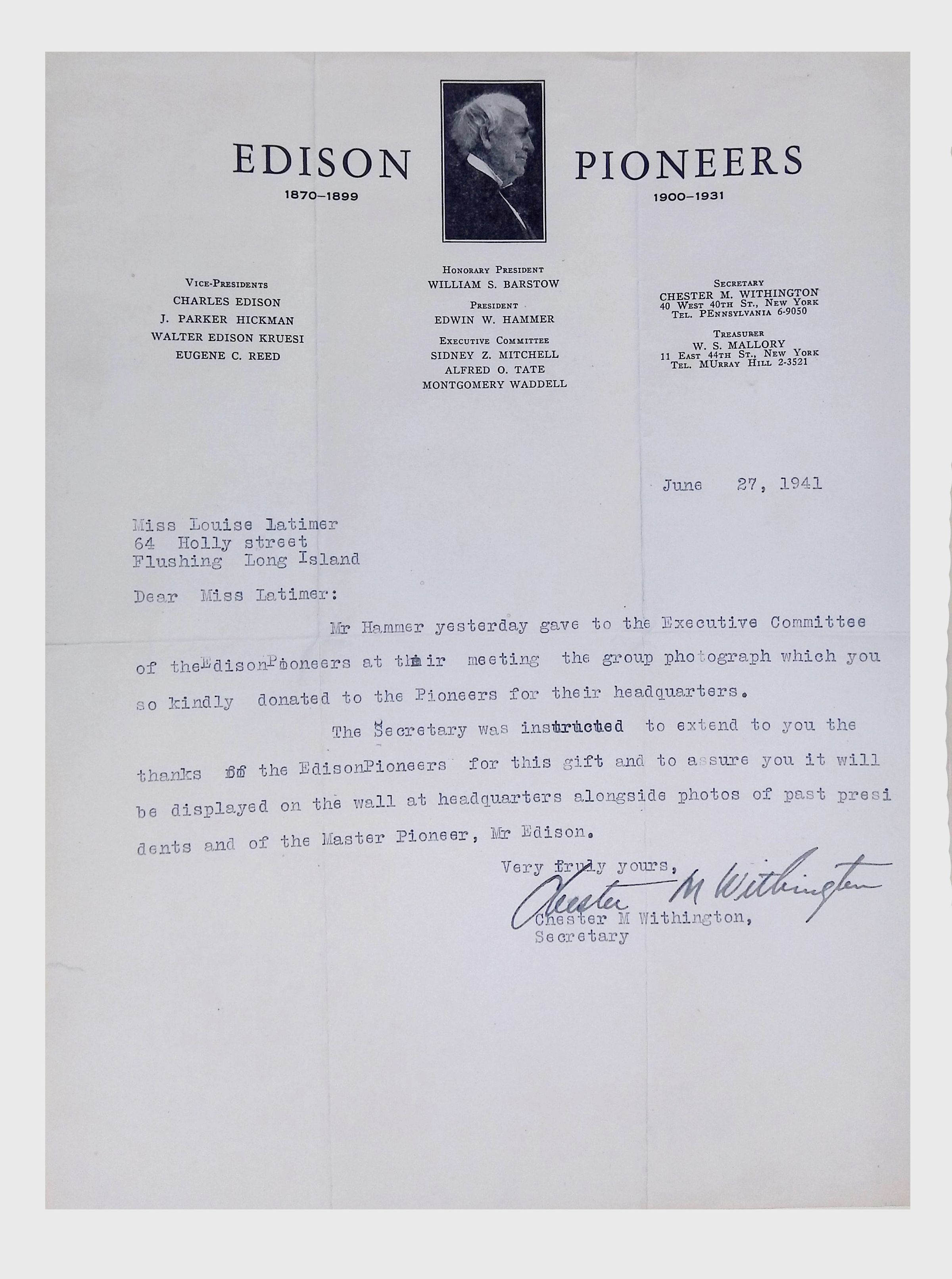 This letter, dated June 27, 1943, was sent to Louise Latimer by the Edison Pioneers, an organization honoring those who contributed to Thomas Edison's innovations. The letter acknowledges Louise Latimer's donation of a group photograph to the Edison Pioneers headquarters and expresses appreciation for her contribution to preserving historical records of the organization. Along with the group’s then-President Edwin W. Hammer, Lewis Latimer had been a founding member of the Edison Pioneers in 1918. The group consisted of early employees of Thomas Edison, along with Edison himself. Edwin Hammer had also been an employer of Lewis Latimer, from circa 1911 to circa 1924.Collection