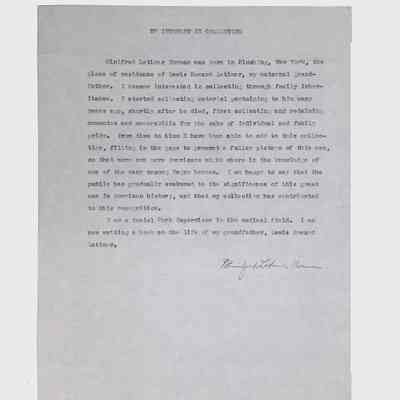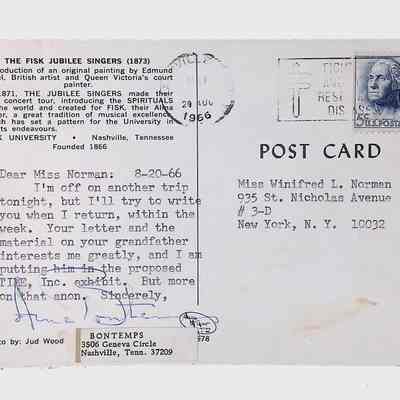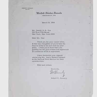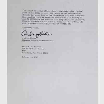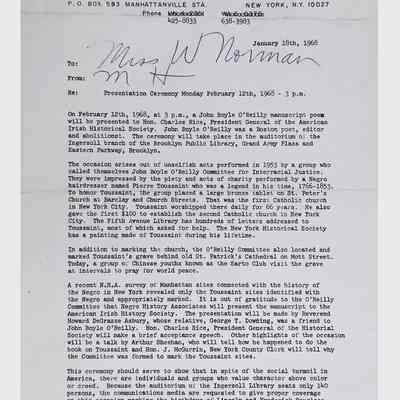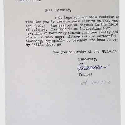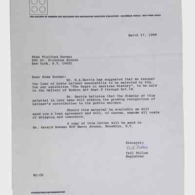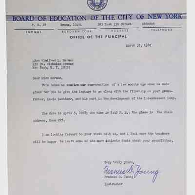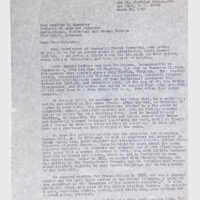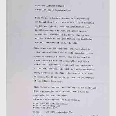 This folder contains correspondence, most or all of it belonging to Lewis Latimer’s granddaughter Winifred Norman, who worked tirelessly to recognize and honor Latimer’s achievements. Notable correspondents include the Harlem writer Arna Bontemps and Senator Robert F. Kennedy. Other letters document the creation of a sculptural bust of Lewis Latimer and other historical Black figures, and the recollections of George A. Latimer, Lewis Latimer’s nephew (although this should be used with caution since the writer erroneously states that his own father, Lewis’s brother George Latimer, Jr., was born in London).Context