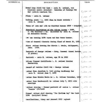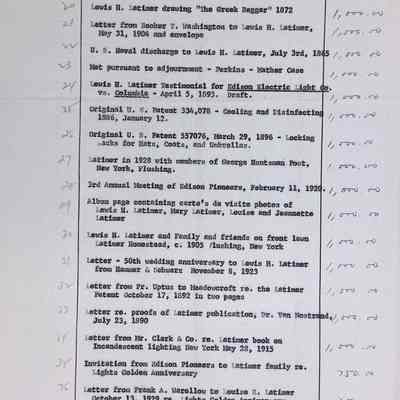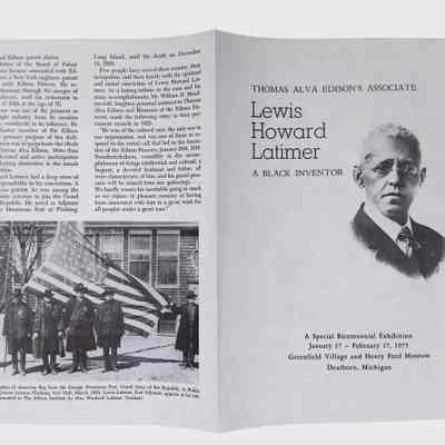 Notably, the folder includes a typed inventory (with stated monetary values) of items associated with Lewis Latimer and evidently loaned for a special exhibition, “Thomas Alva Edison’s Associate Lewis Howard Latimer: A Black Inventor,” displayed in 1975 at Greenfield Village and Henry Ford Museum in Dearborn, Michigan. Also included is a brochure for that exhibition.Context