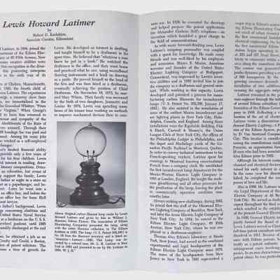 This folder contains biographical booklets, and archival documentation related to Lewis Howard Latimer. The materials include transcripts of speeches or discussions, printed publications detailing Latimer’s contributions, and historical references to his work in electrical engineering and innovation.