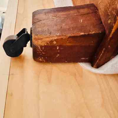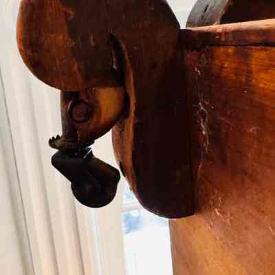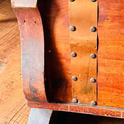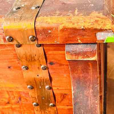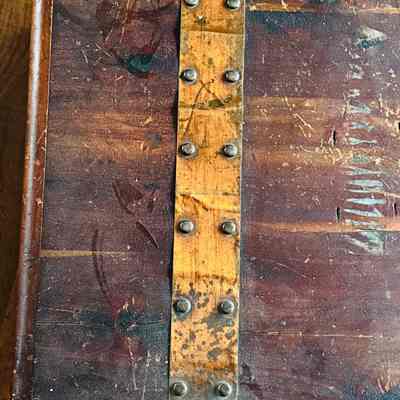A detailed view of a wooden chest with brass embellishments and hinges. The chest displays signs of wear, showcasing its historical value. The interior reveals its functional design with supporting brass hinges.Context
