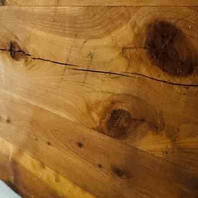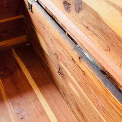 Cedar-lined wood chest with decorative brass strap with hinge cover and locking mechanism.