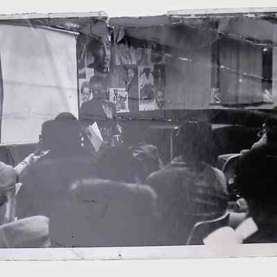 The folder includes multiple black-and-white photographs showing an indoor gathering. One image captures a person holding up a document, possibly reading or presenting it to an audience. Another image shows a seated crowd listening attentively. The backs of some photographs contain handwritten inscriptions, such as “Henry St. School,” suggesting a possible connection to an educational institution or community event. These images serve as historical records of a significant gathering related to Latimer’s impact or broader historical discussions.Photograph Details