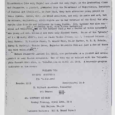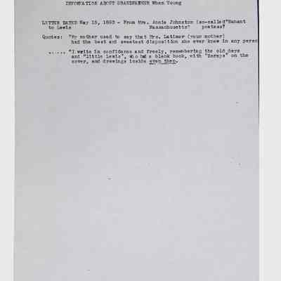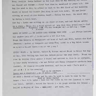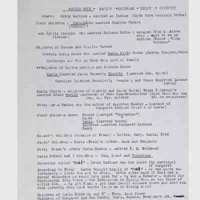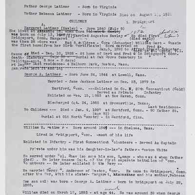The folder includes important typescripts of interviews about the Latimer family, inherited family documents, and a Latimer family tree, all researched and compiled by Winifred Norman. Some of these documents are unique in the historical and biographical details they provide about Lewis Latimer’s career and family life.Context