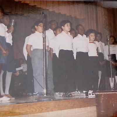 These images depict a community event and a student performance, likely associated with the Lewis H. Latimer community or a related cultural or educational organization. The first image shows a gathering of older and younger individuals in a social setting, possibly a meeting or celebration. The second image features a group of children dressed in white shirts and dark bottoms performing on a stage, suggesting a school or community program.Collection