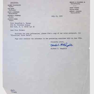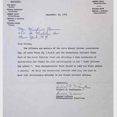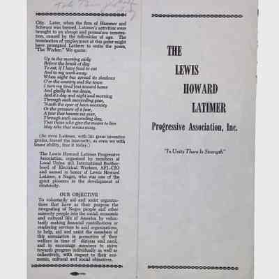 Documents sent to and/or collected by Winifred Norman, Lewis Latimer’s granddaughter, relating to the Lewis Howard Latimer Progressive Association, Inc., of Local Union No. 3., I.B.E.W. (International Brotherhood of Electrical Workers). Invitations and Announcements: Formal invitations to events commemorating Latimer, including ceremonies and historical recognitions. Correspondence: Letters between institutions and individuals discussing Latimer’s legacy and contributions. Programs and Event Brochures: Materials detailing events such as dedications of buildings, plaques, and other memorials in Latimer’s name. Newspaper Clippings: Articles covering public events, speeches, and historical reflections on Latimer’s life and work.Context