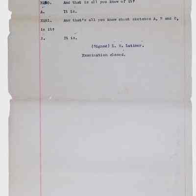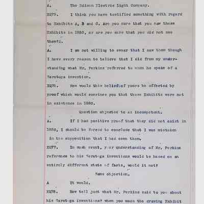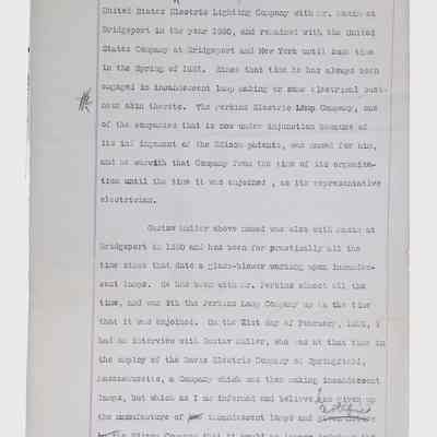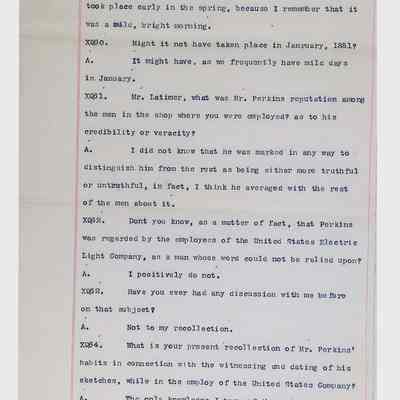 This collection consists of typed and handwritten pages, likely transcripts, depositions, or technical records related to Lewis Latimer’s work in engineering and patent law. These documents may pertain to legal cases, technical patents, or professional correspondence involving Latimer's contributions to electrical engineering and innovation. Specifically, they illustrate Latimer’s professional work as an expert witness in patent lawsuits, and the challenges facing inventors (particularly an African American and at the time relatively unknown inventor such as Latimer) in trying to persuade businesspeople to put inventions into production.Collection