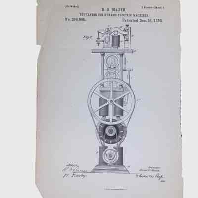 A patent granted to Hiram S. Maxim on December 26, 1882, for a regulator designed to improve the performance of dynamo-electric machines. Lewis Latimer was an employee of Hiram Maxim’s during the early 1880s, and it is possible that he was involved in helping to develop or illustrate this prototype.Collection