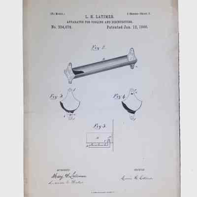 This is a patent document filed by Lewis H. Latimer for an Apparatus for Cooling and Disinfecting, patented on January 12, 1886, under Patent No. 334,078. The illustration on the document shows: A framed mesh or screen apparatus, possibly designed to filter, cool, or disinfect air. Pipes or attachments at the bottom, which could indicate a water-based or airflow mechanism. Technical labels detailing the components of the device.Context