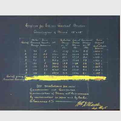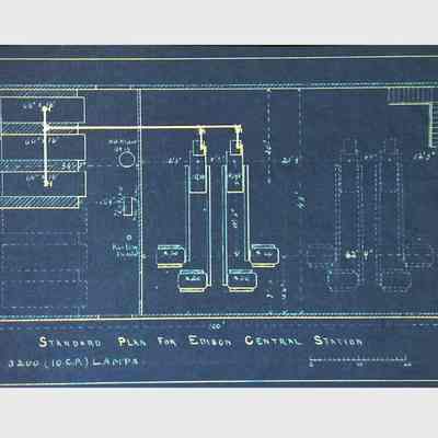 Blueprints and a photostat relating to the “Edison Central Station,” probably referring to Edison’s commercial power plant built on Pearl Street in New York City in 1882. One of the blueprints bears the date “Feb. 1889,” while another blueprint refers to Armington & Sims, the firm whose coal-fired steam engines powered the Pearl Street plant’s six dynamos. Index pages with handwritten or typed labels, possibly cataloging the documents. Blueprint tables and calculations detailing machine capacities, dimensions, and operational parameters. Schematics of electrical systems, illustrating configurations for electrical circuits and mechanical components. Handwritten or printed tables listing data, possibly performance metrics for electrical machinery. Large-format engineering diagrams, some rolled or folded, indicating oversized technical schematics used in industrial settings.Context
