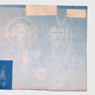 The blueprint paper exhibits wear, tears, and fading, indicating its age and historical significance.Context