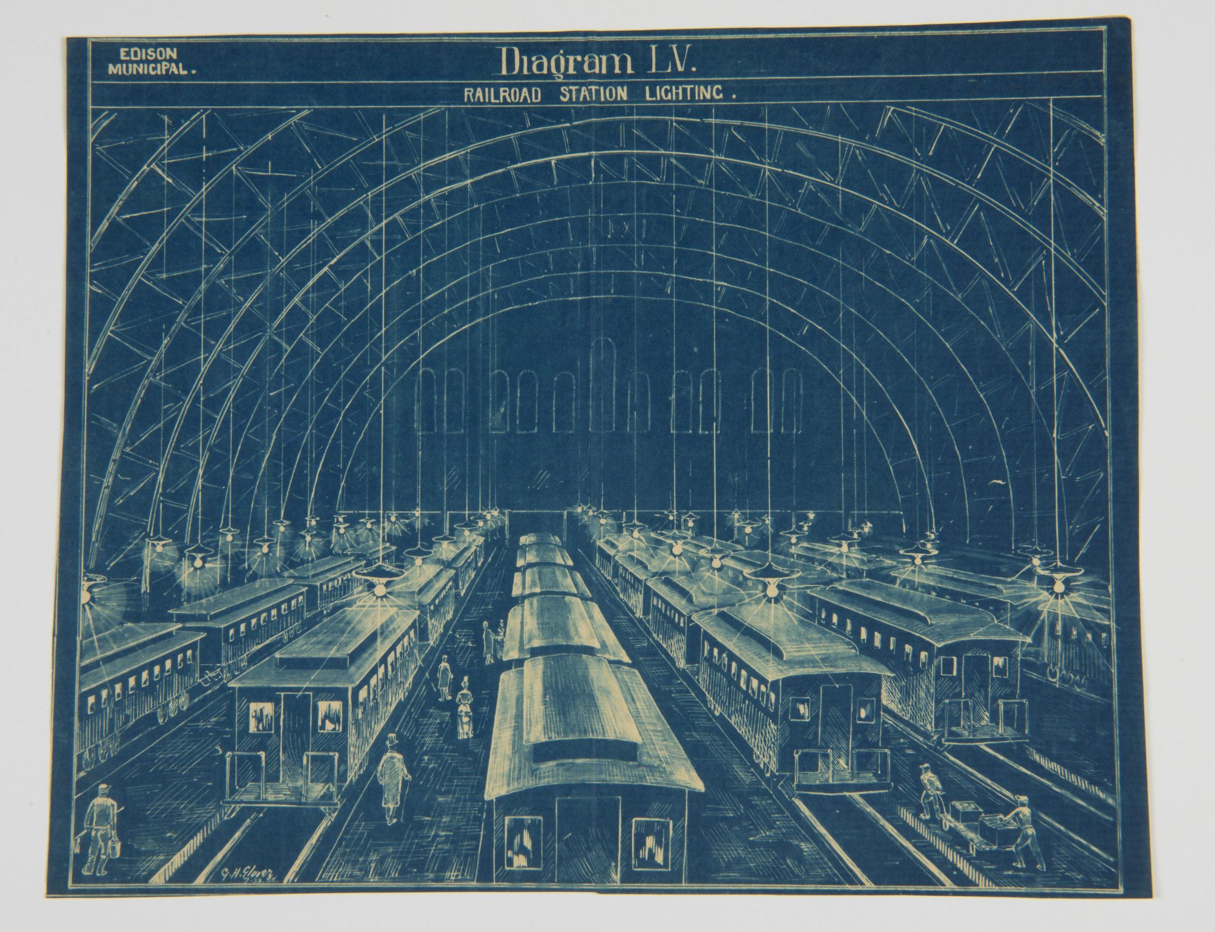 This drawing is part of the Edison Municipal Lighting Series, designed to promote the benefits of electric lighting in large-scale public infrastructure projects. Lewis H. Latimer played a critical role in developing, patenting, and implementing electric lighting systems, including those used in railroad stations, wharves, and municipal buildings. The 1880s marked a major shift from gas to electric lighting, and railroad stations were among the first major public spaces to adopt this innovation. The image reflects how electric light revolutionized urban transportation hubs, extending operational hours and enhancing security.Collection