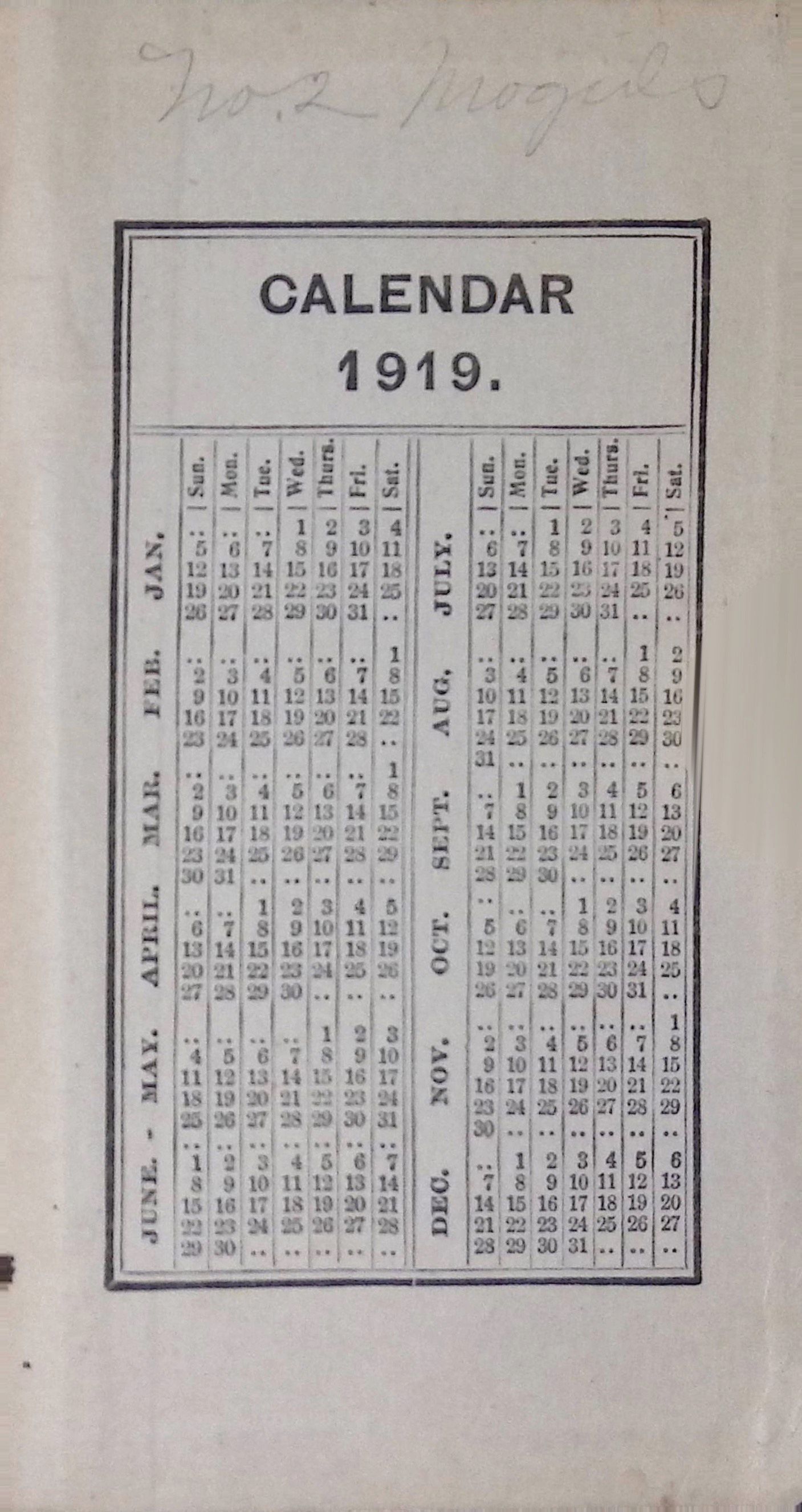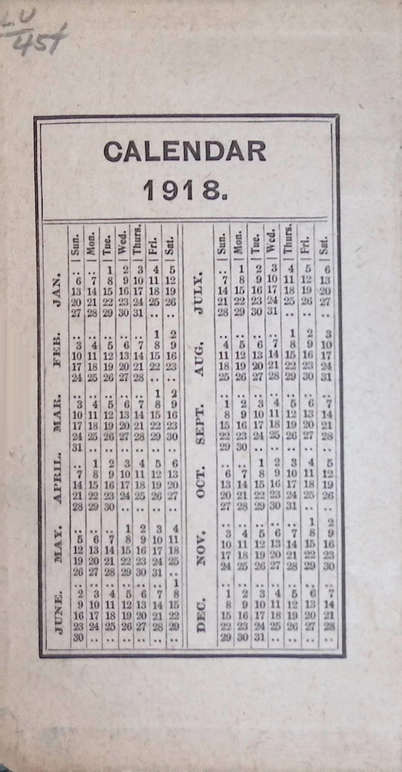 A calendar reference page, indicating it may have been intended for daily use.