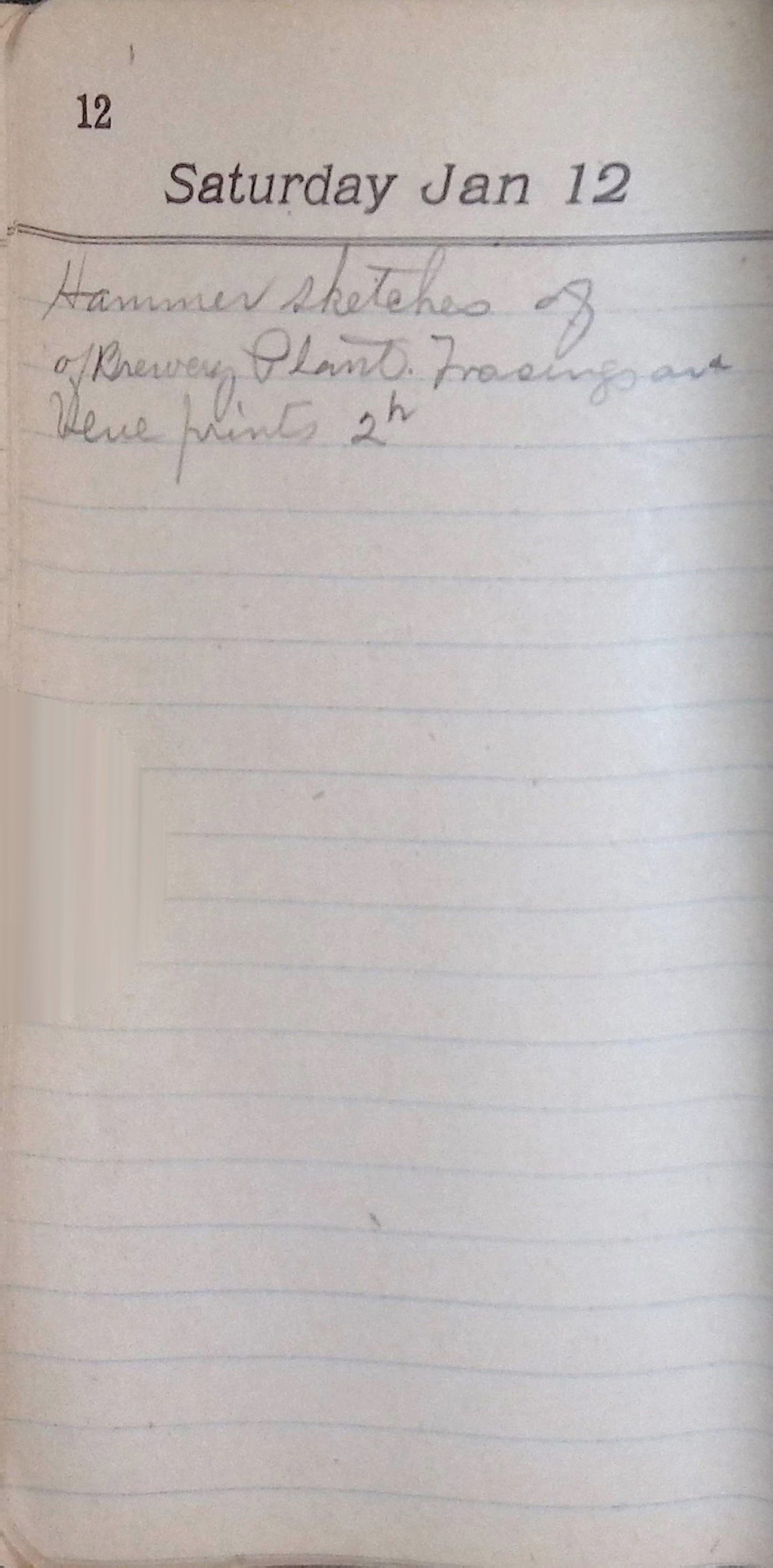 This folder contains a single bound book, possibly a personal diary or notebook, with sporadic handwritten entries among many blank pages. The structure suggests that the book was not used consistently but instead opened at random for occasional notes or reflections. In it Latimer jotted down brief information, probably indicating the details and time spent on various freelance projects that he worked on for income during the latter years of his career.