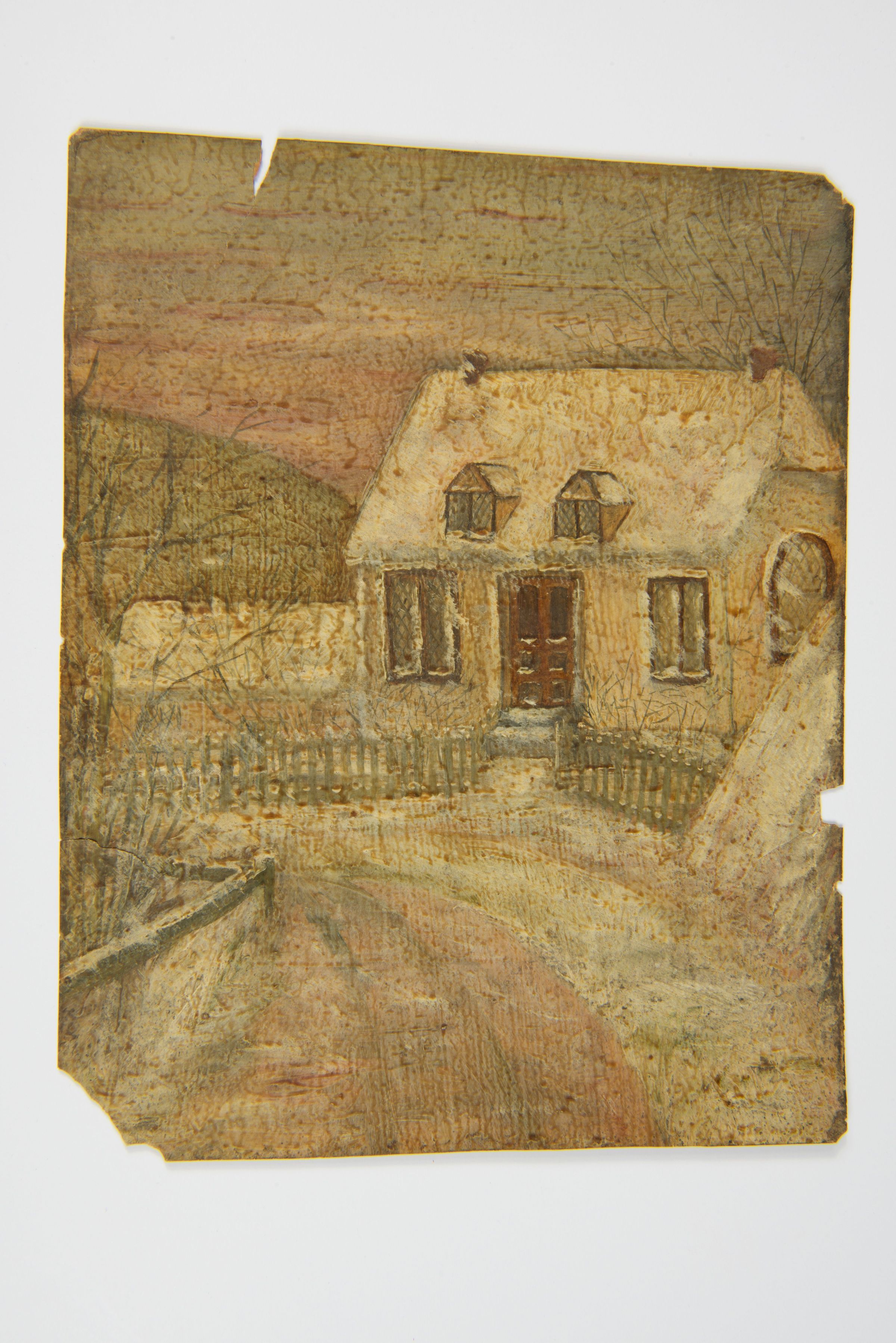 This is a small, aged painting or illustration depicting a snow-covered house with a pitched roof, dormer windows, and a central front door. A winding dirt path leads up to the entrance, passing by a wooden fence and barren trees, suggesting a late autumn or winter setting. The background features rolling hills and a pinkish sky, possibly at dusk or dawn. The medium appears to be oil or watercolor on a textured surface, possibly wood or canvas board. The piece has visible cracks, discoloration, and missing corners, indicating its age and fragility.Context