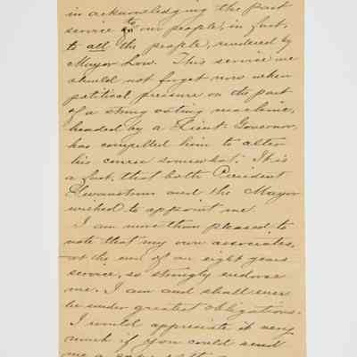 Page 2: -ment in acknowledging the past service to our people, in fact, to all the people, rendered by Mayor Low. This service we should not forget now when political pressure on the part of a strong voting machine, headed by a Lieut. Governor, has compelled him to alter his course somewhat. It is a fact that both President Swanstrom and the Mayor wished to appoint me. I am nevertheless pleased to note that my own associates, at the end of an eight years service, so strongly endorse me. I am and shall ever be under greatest obligations. I would appreciate it very much if you could send me a copy of the communication to the Mayor, which