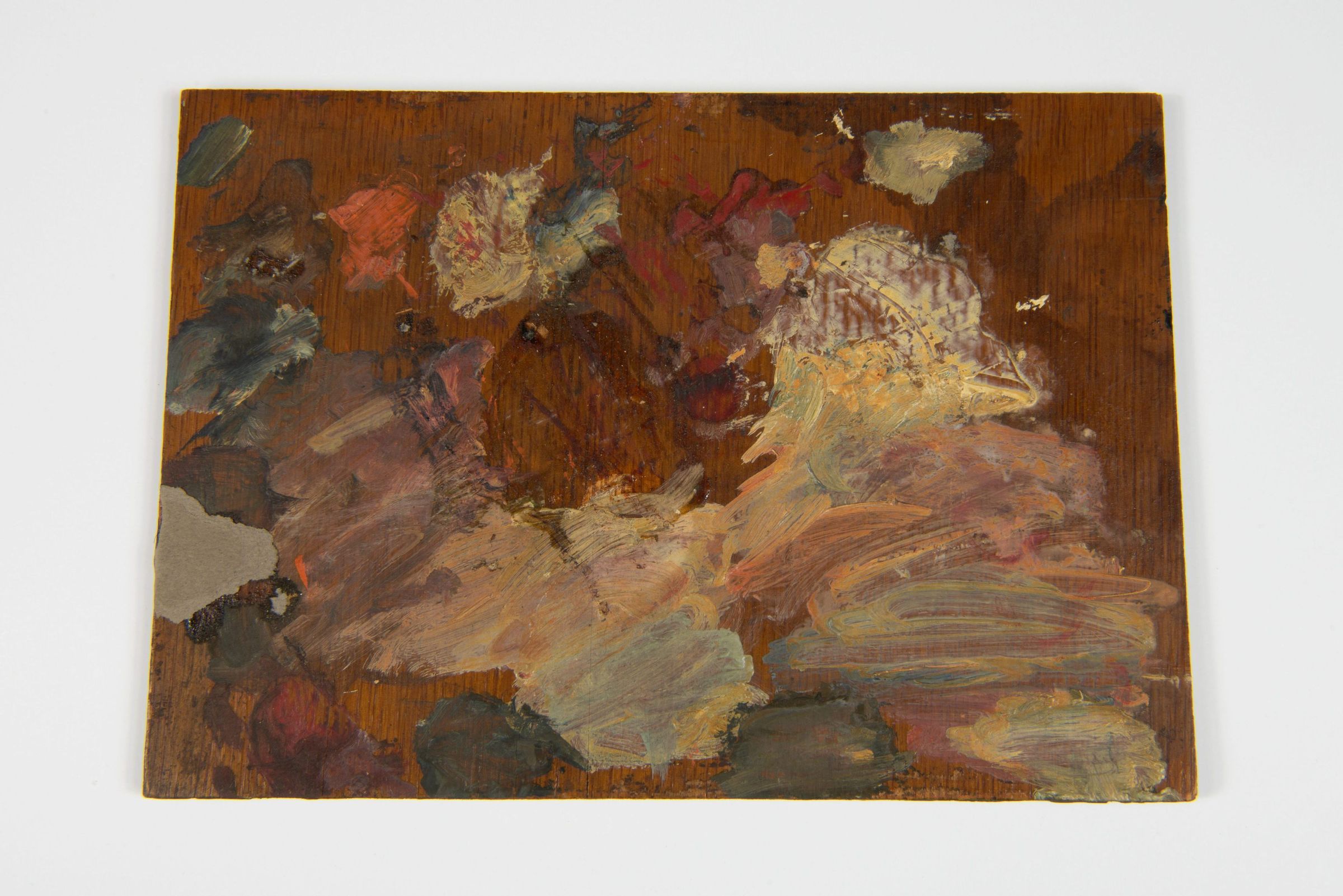 This image appears to be a painted wooden panel with various abstract brushstrokes in earthy and muted tones, including shades of brown, beige, ochre, black, and red.Collection