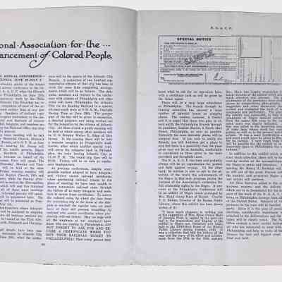 This folder contains a preserved issue of The Crisis, the official magazine of the NAACP, originally founded by W.E.B. Du Bois in 1910. The magazine played a critical role in advocating for civil rights, highlighting Black achievements, and addressing racial injustices. This issue is from the 1920s and includes articles, editorials, photographs, and advertisements relevant to the period.Collection