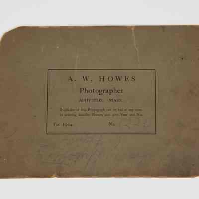 This photograph, taken by A.W. Howes in 1904, depicts a family home with children standing in the yard, capturing a slice of domestic life. The house has a front porch with a covered entrance, typical of the period's architectural style. The children, dressed in period attire, are posed naturally, adding a sense of warmth and nostalgia to the image. The back of the photograph bears the photographer’s stamp from Ashfield, Massachusetts, with instructions for ordering duplicates.Photograph Details
