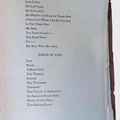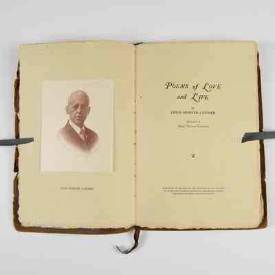 This book, titled Poems of Love and Life, is a collection of poetry by Lewis Howard Latimer. The book is dedicated to his wife, Mary Wilson Latimer, and features a portrait of the author on the inside cover. This edition was published by friends and admirers on the occasion of Latimer's seventy-seventh birthday in 1925. The book appears to be bound in brown suede with the title embossed on the cover. Keywords: Lewis Howard Latimer, Poems of Love and Life, Mary Wilson Latimer, African American poetry, vintage poetry collection, historical publication, 1925 edition, birthday dedicationContext