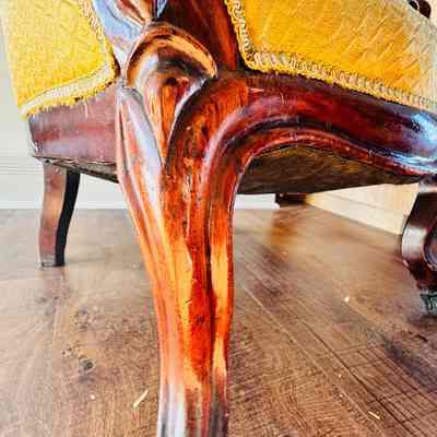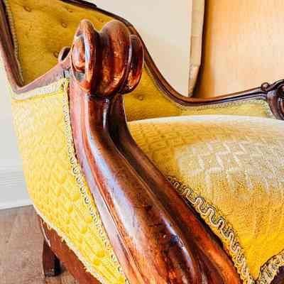 A Victorian-style armchair, originally from the home of Lewis Latimer, featuring intricate wood carving and mustard-gold upholstery. This chair is a fine example of 19th-century craftsmanship and provides a glimpse into the personal furnishings of the renowned inventor.Context