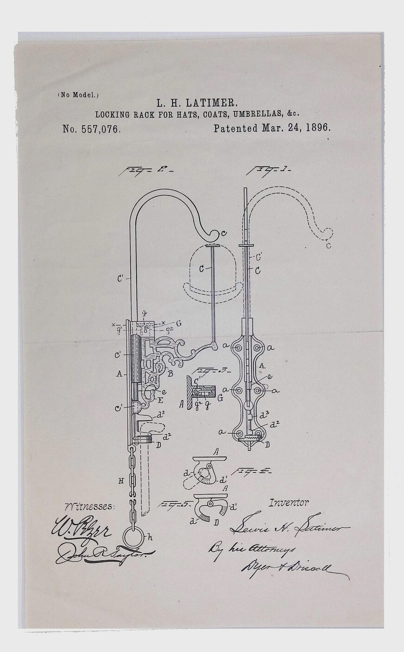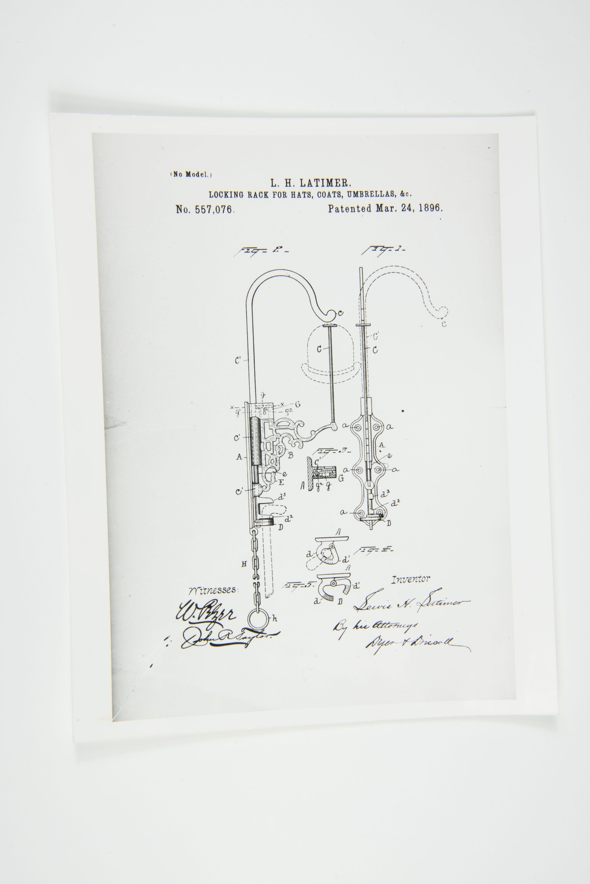 This is a technical patent drawing for a locking rack designed to hold hats, coats, and umbrellas, patented by Lewis H. Latimer on March 24, 1896, under Patent No. 557,076. The diagram showcases mechanical components that allow for the secure locking and release of items placed on the rack. Latimer’s design is a functional innovation in storage solutions, combining a locking mechanism with a coat rack. The diagram includes detailed labeled components, structural support, and mechanical locking features, ensuring that items can be securely held in place. The drawing is signed by Latimer as the inventor, along with witness signatures and legal authorization by his attorney.Context