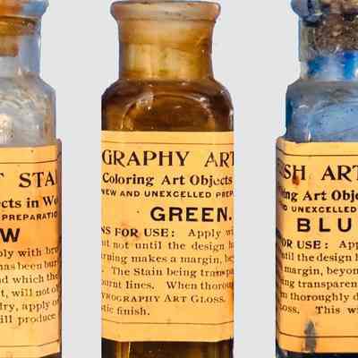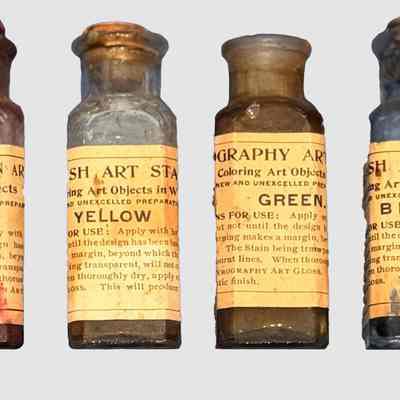 These antique bottles, contain vibrant art stains used for coloring wooden and art objects, belonged to Lewis H. Latimer, and/or to his daughter, Louise Latimer. The labels provide detailed instructions: "Apply with brush but not until the design has been burnt in." The stains are noted for their transparency, allowing them to avoid obscuring fine details such as burnt lines. Each bottle promises an "unequaled artistic finish" when paired with a gloss application. The collection demonstrates the meticulous approach to art and craftsmanship in the early 20th century.Context