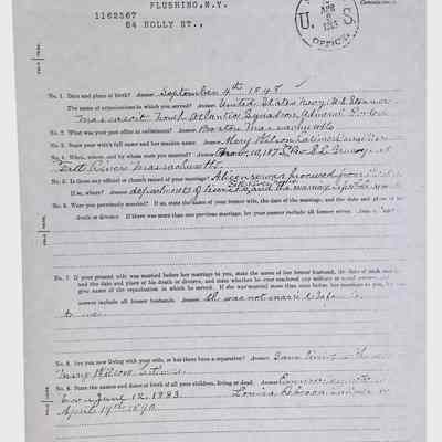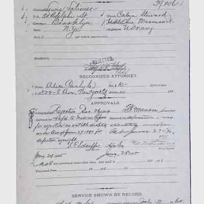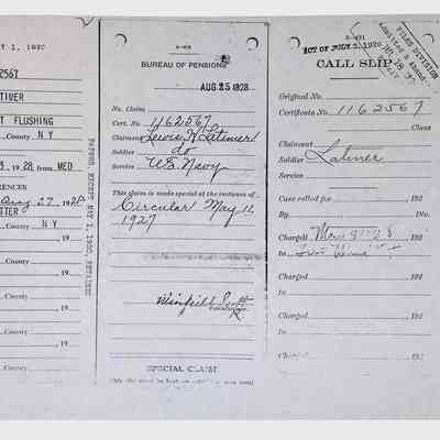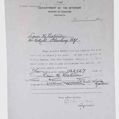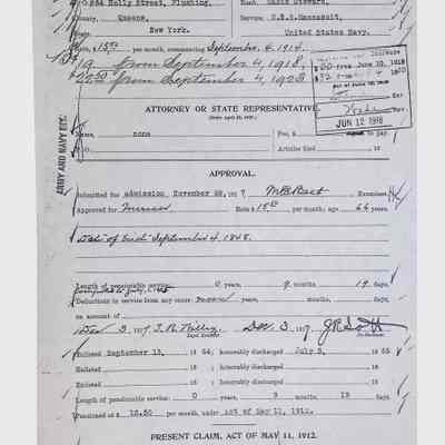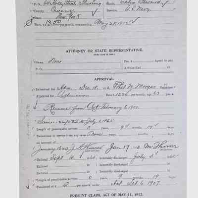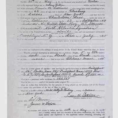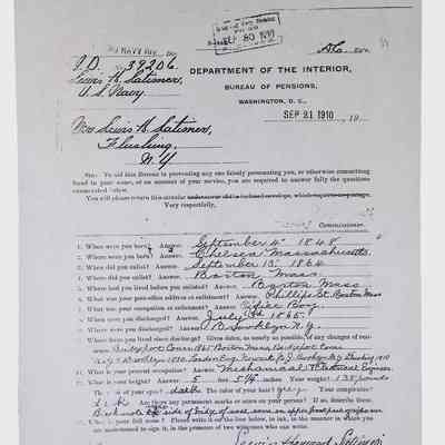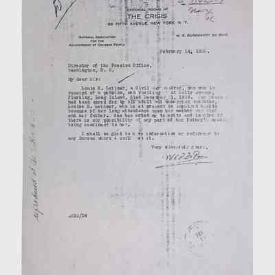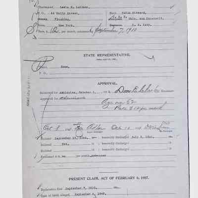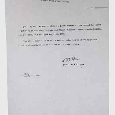 This folder contains photocopies of financial documents and pension records spanning from 1894 to 1932, providing insight into Lewis H. Latimer’s financial standing, retirement benefits, and potential legal or administrative interactions regarding his entitlement to a military pension as a Civil War veteran. The documents are all photocopies made at the National Archive from originals, probably by Winifred Norman during her research on her grandfather Lewis Latimer’s life. The materials include official forms, handwritten financial notes, and typed correspondence, likely related to Latimer’s employment history and benefits. The documents are notable for providing details on Lewis Letimer’s health in later life, his Civil War experiences, and his service as a battalion quartermaster in the Massachusetts State Militia in 1871-1872. and they include correspondence from W. E. B. DuBois advocating (unsuccessfully) that Lewis’s pension payments be continued to Louise Latimer after her father’s death.