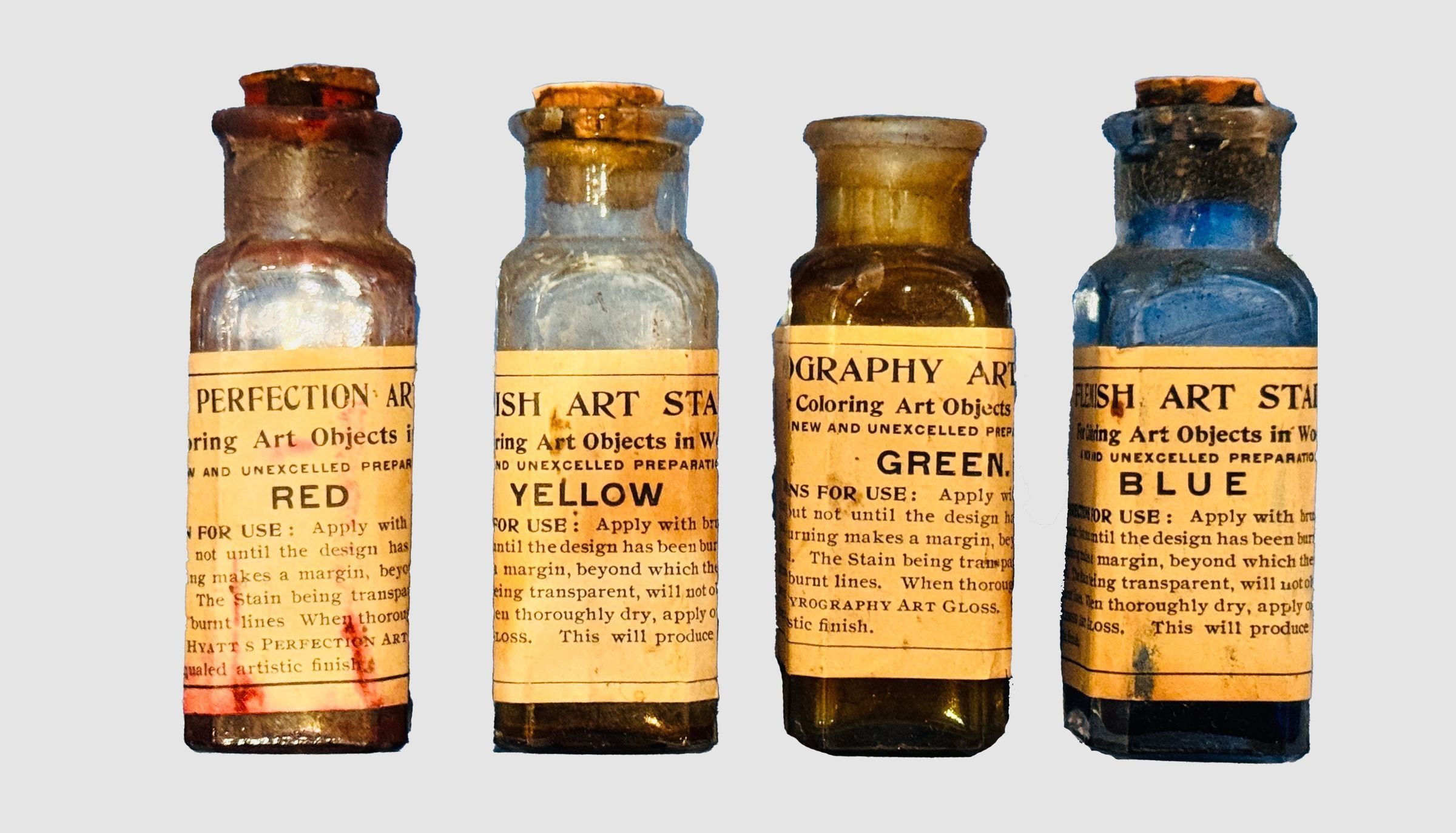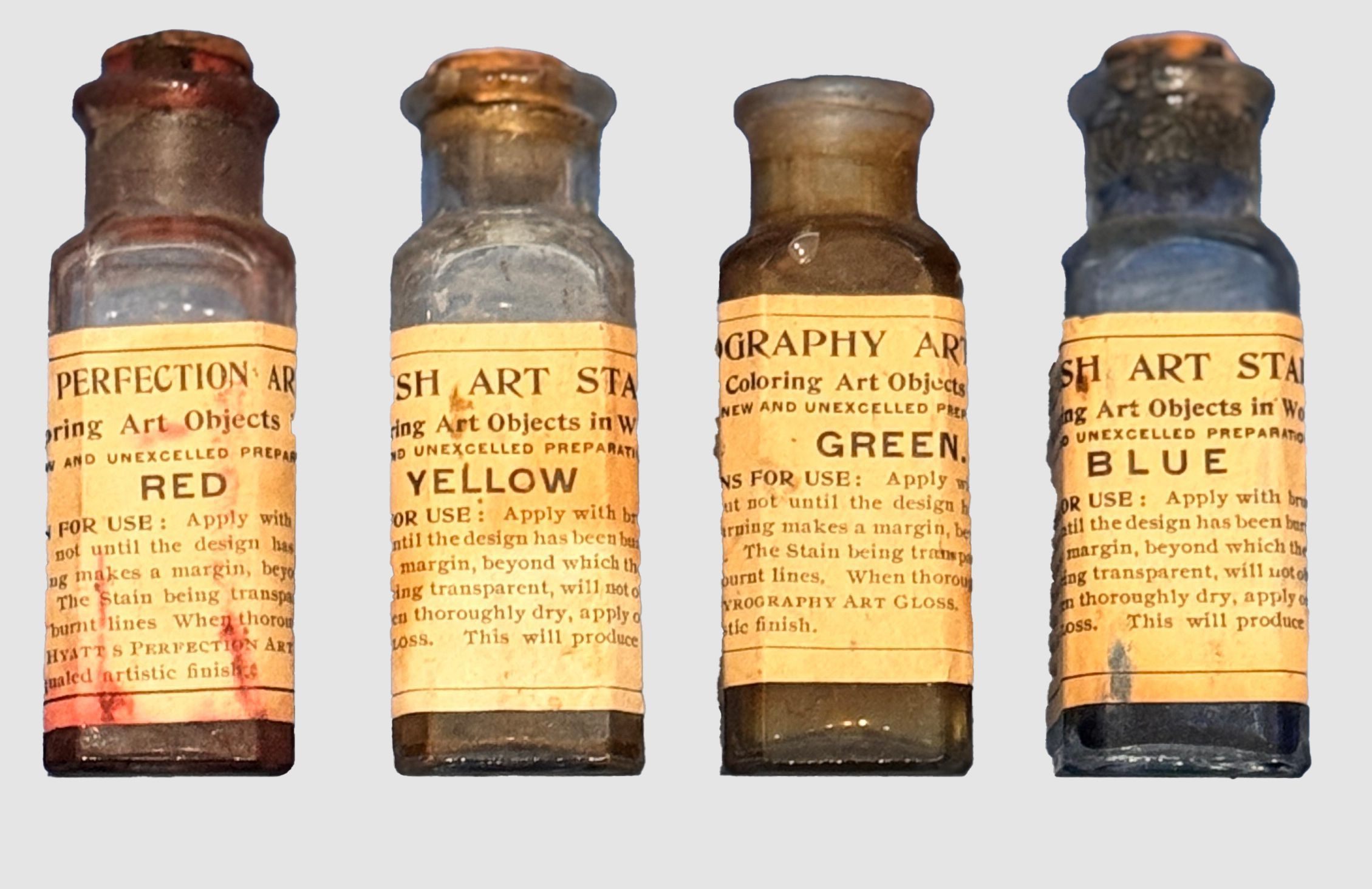 A set of four vintage Perfection Art Stain bottles in red, yellow, green, and blue.Collection