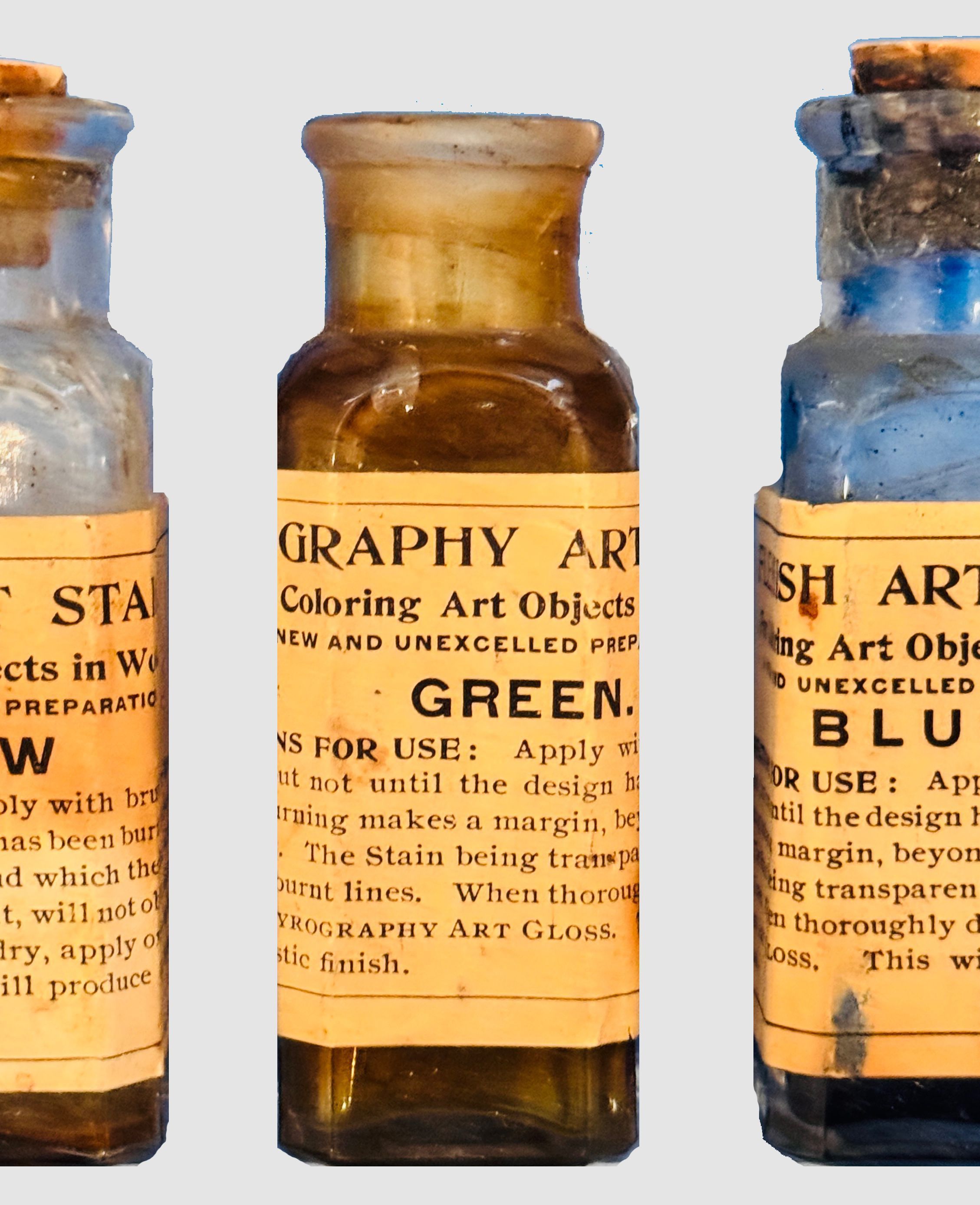 These antique bottles, contain vibrant art stains used for coloring wooden and art objects, belonged to Lewis H. Latimer, and/or to his daughter, Louise Latimer. The labels provide detailed instructions: "Apply with brush but not until the design has been burnt in." The stains are noted for their transparency, allowing them to avoid obscuring fine details such as burnt lines. Each bottle promises an "unequaled artistic finish" when paired with a gloss application. The collection demonstrates the meticulous approach to art and craftsmanship in the early 20th century.Context