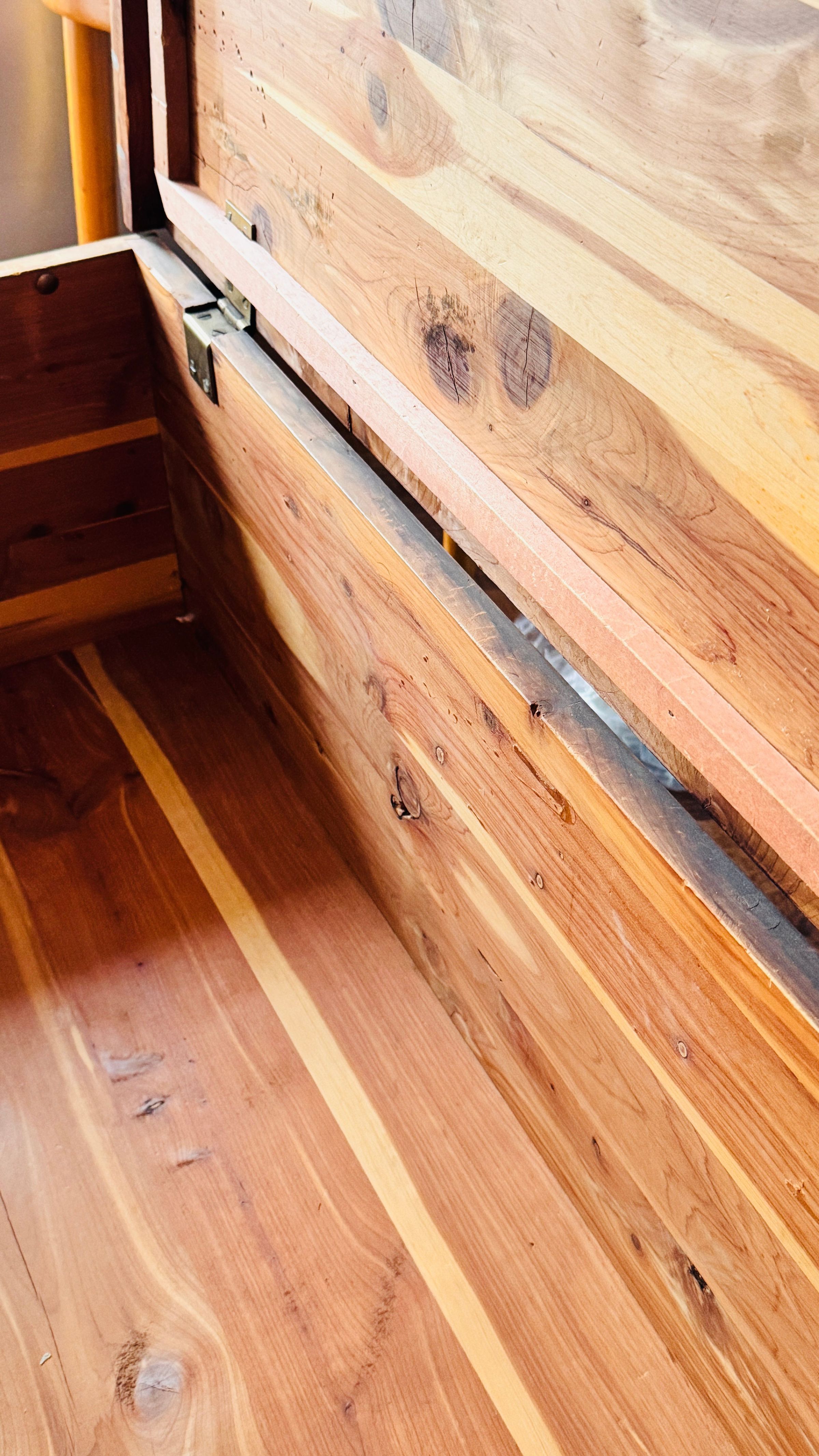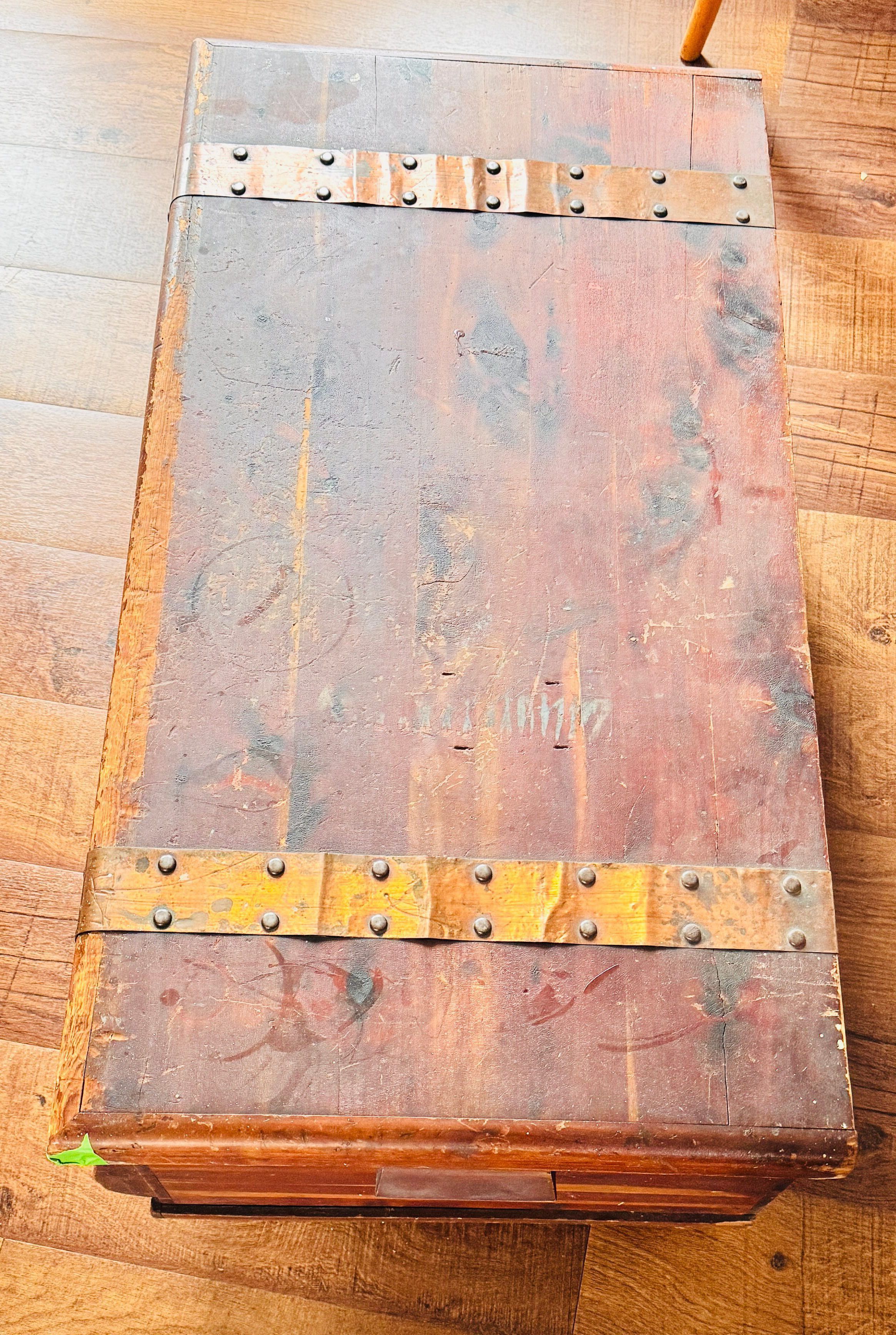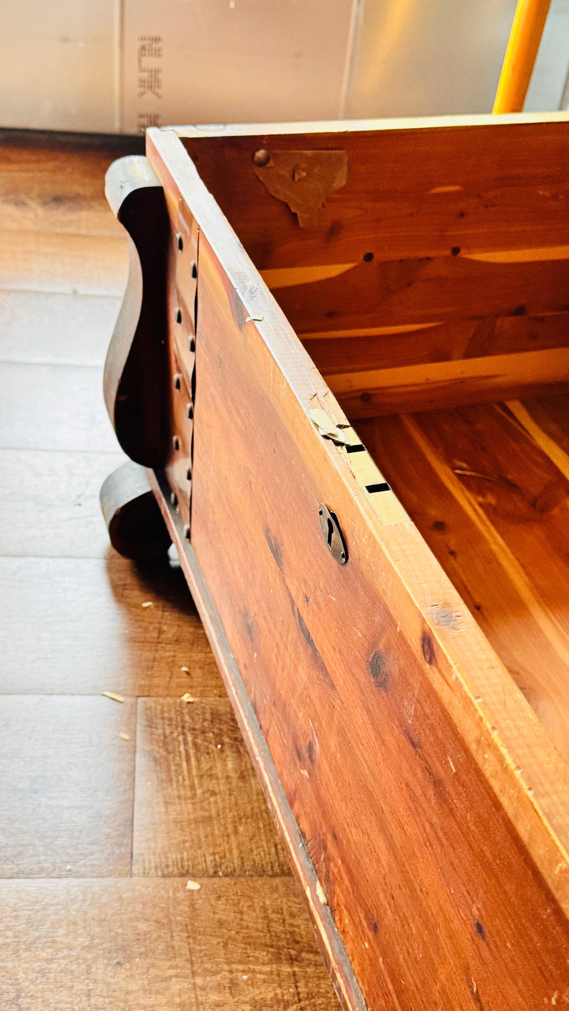 Cedar-lined wood chest with decorative brass strap with hinge cover and locking mechanism.