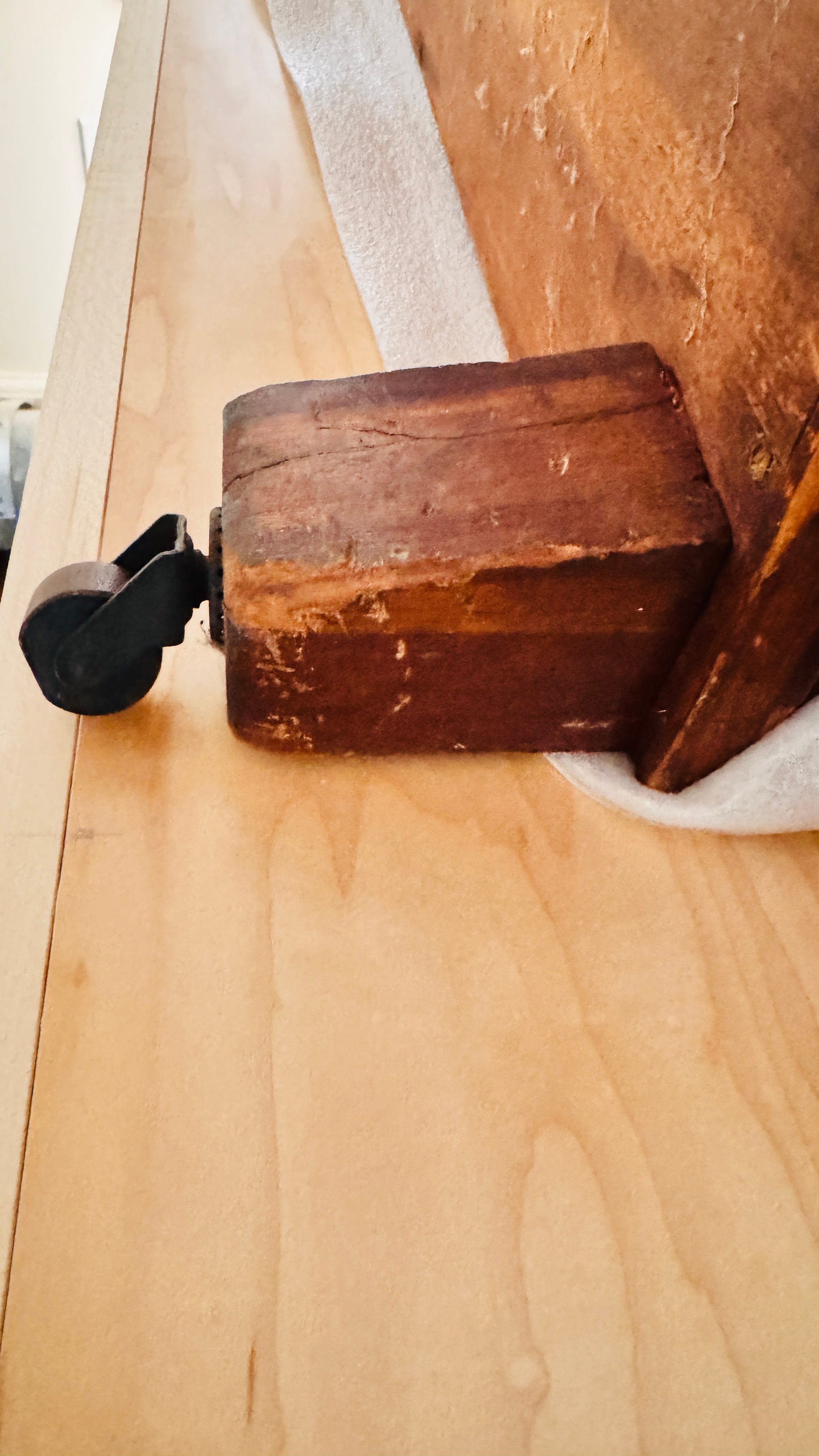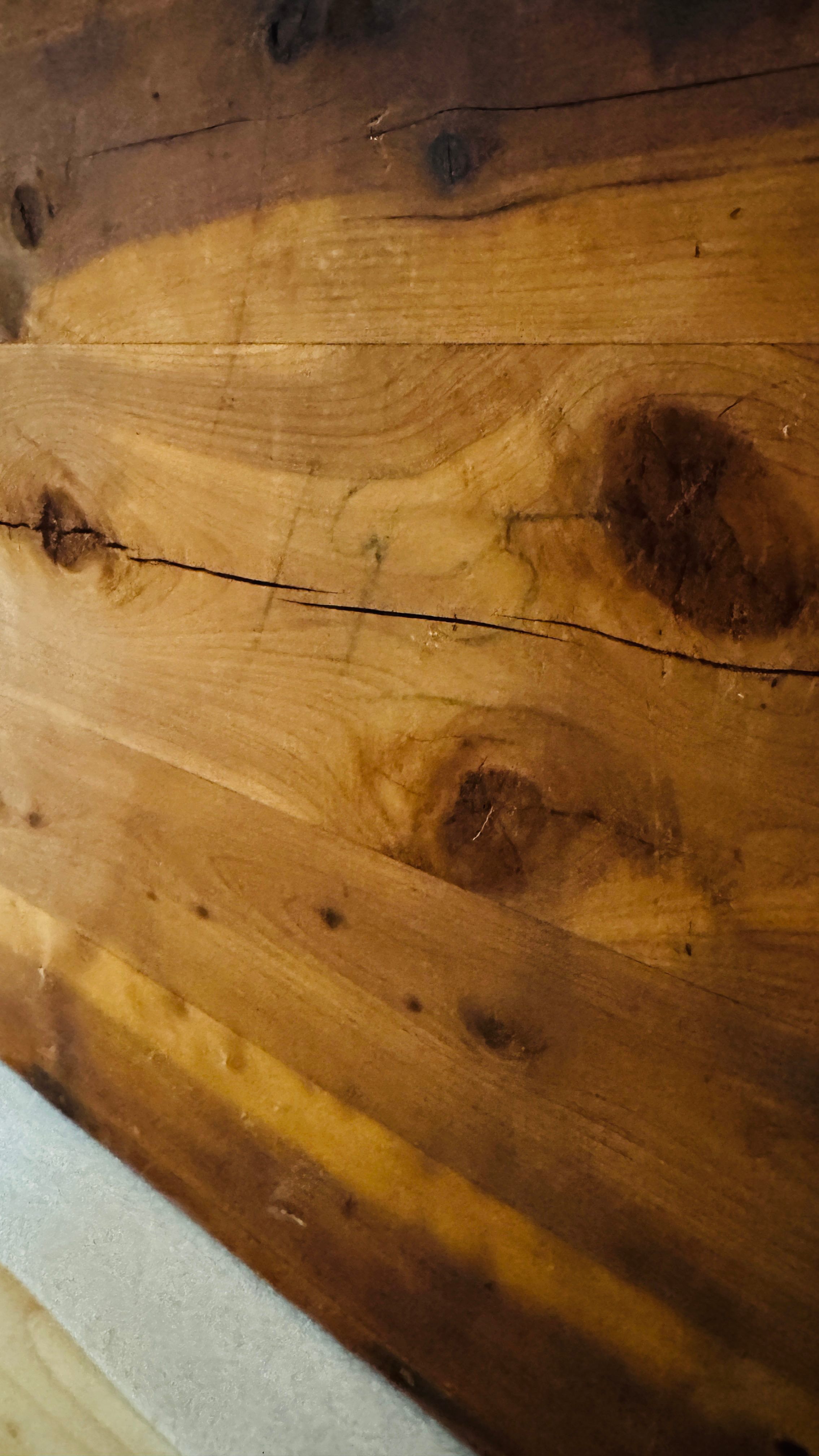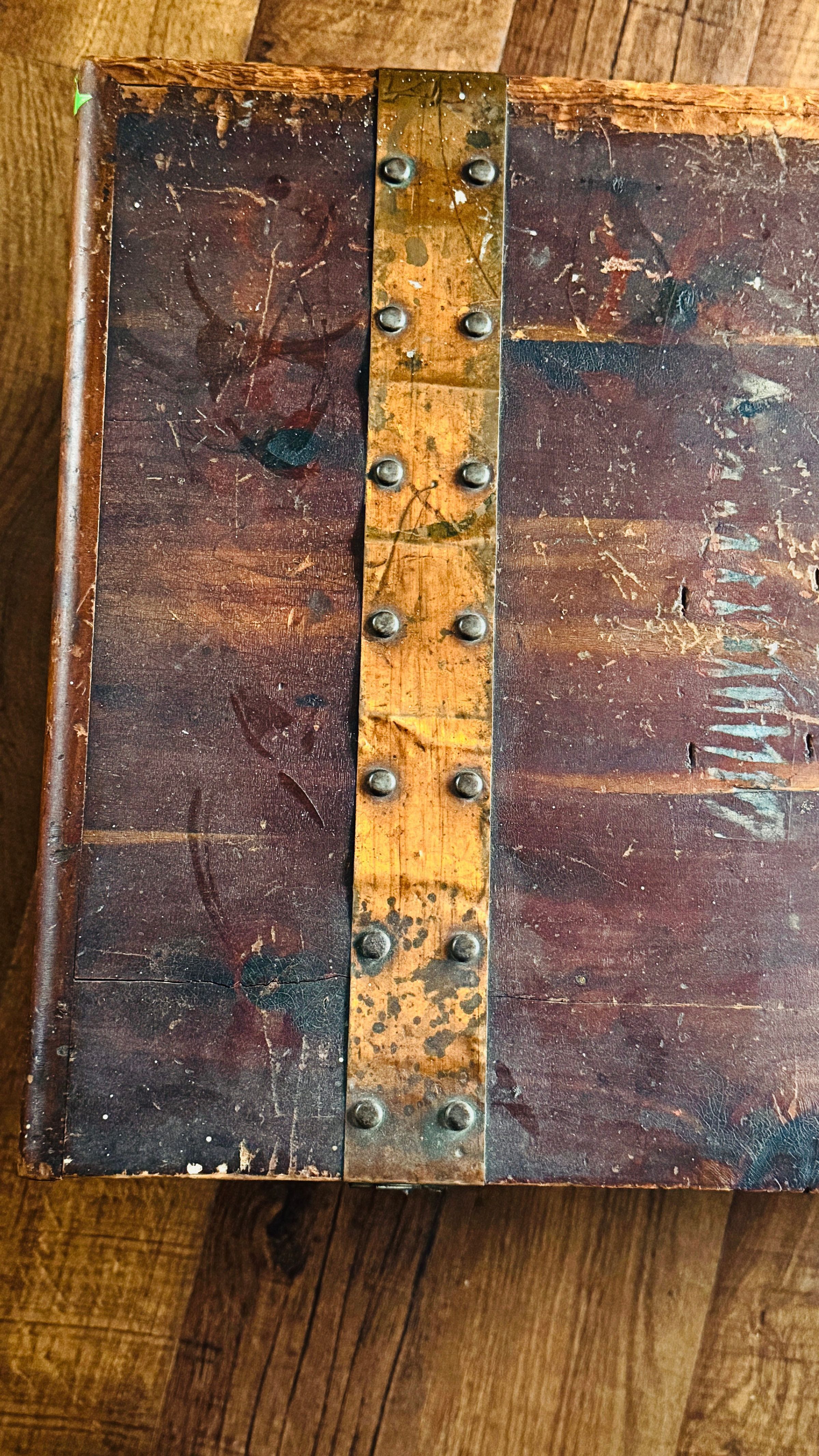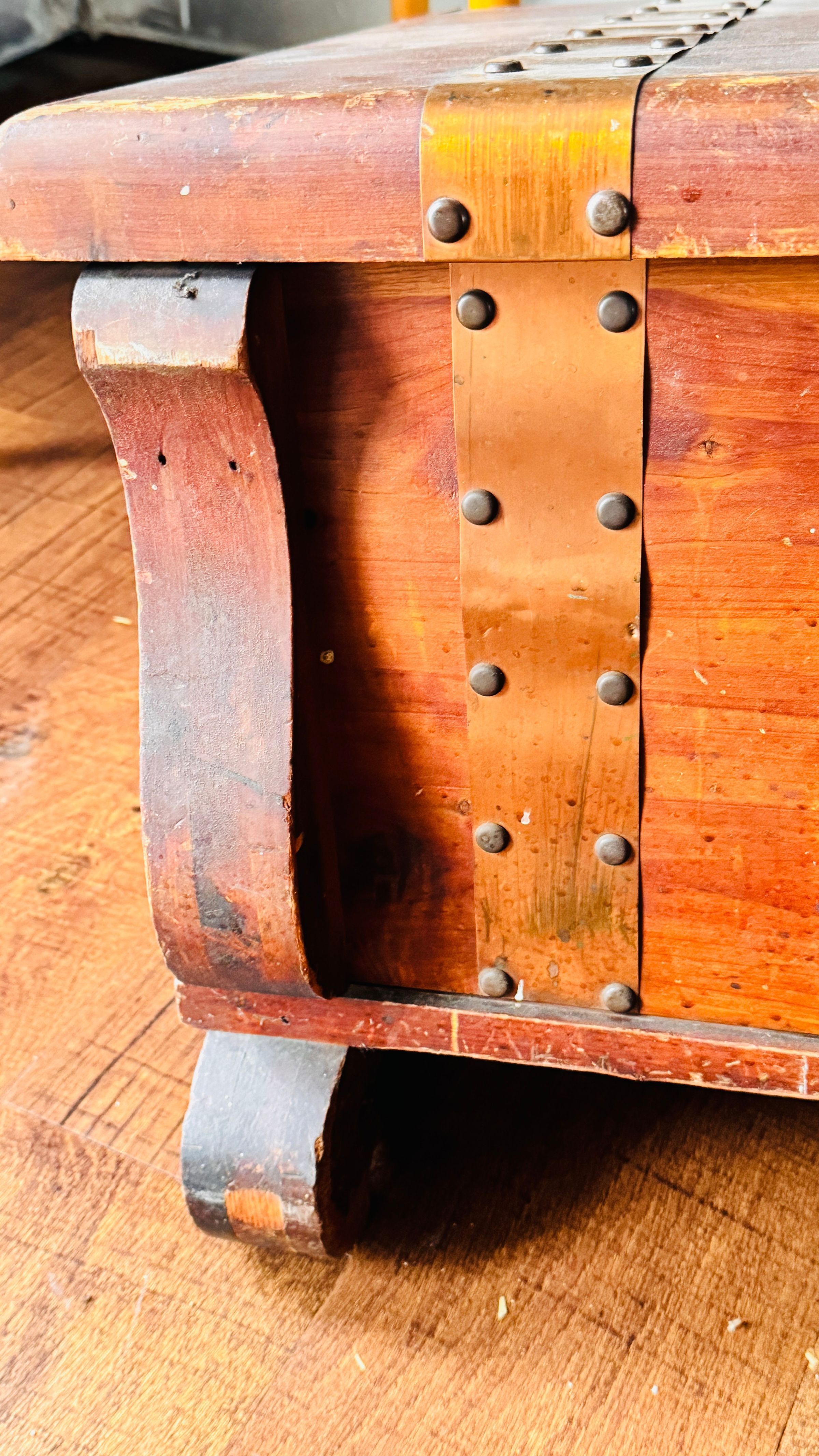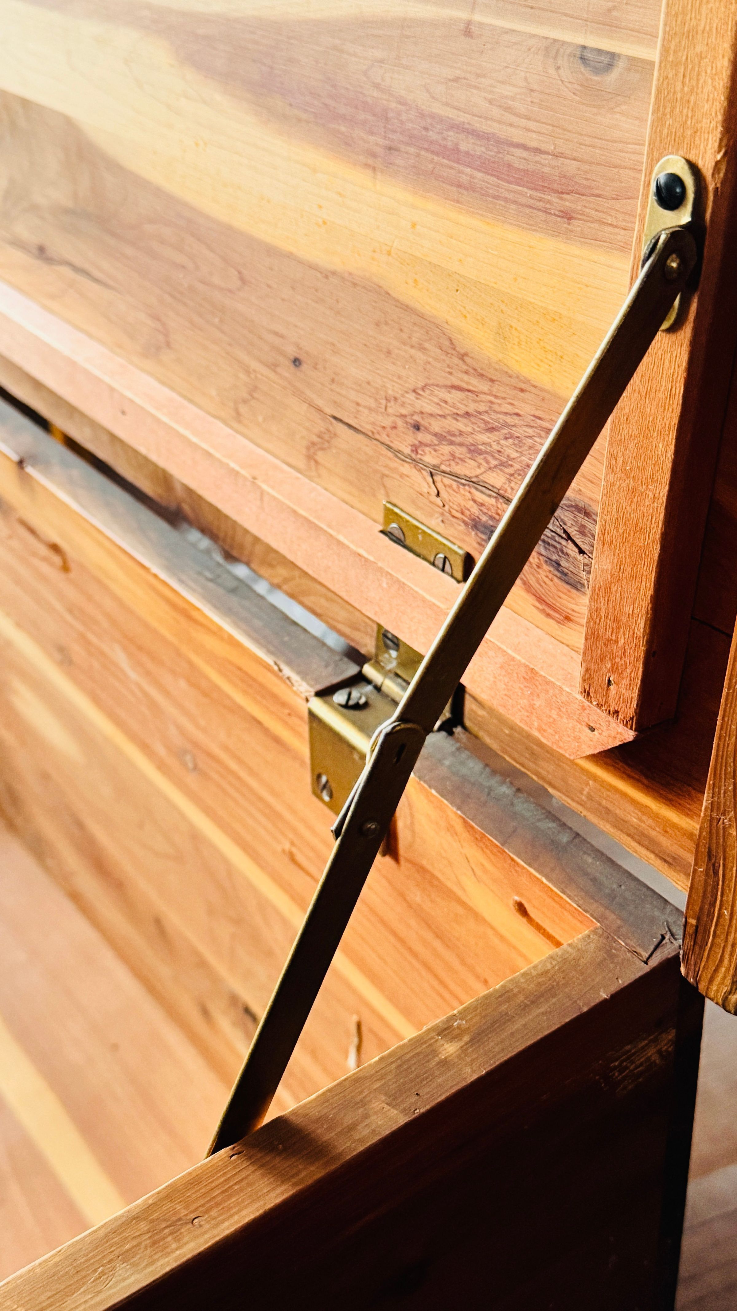 A detailed view of a wooden chest with brass embellishments and hinges. The chest displays signs of wear, showcasing its historical value. The interior reveals its functional design with supporting brass hinges.Context