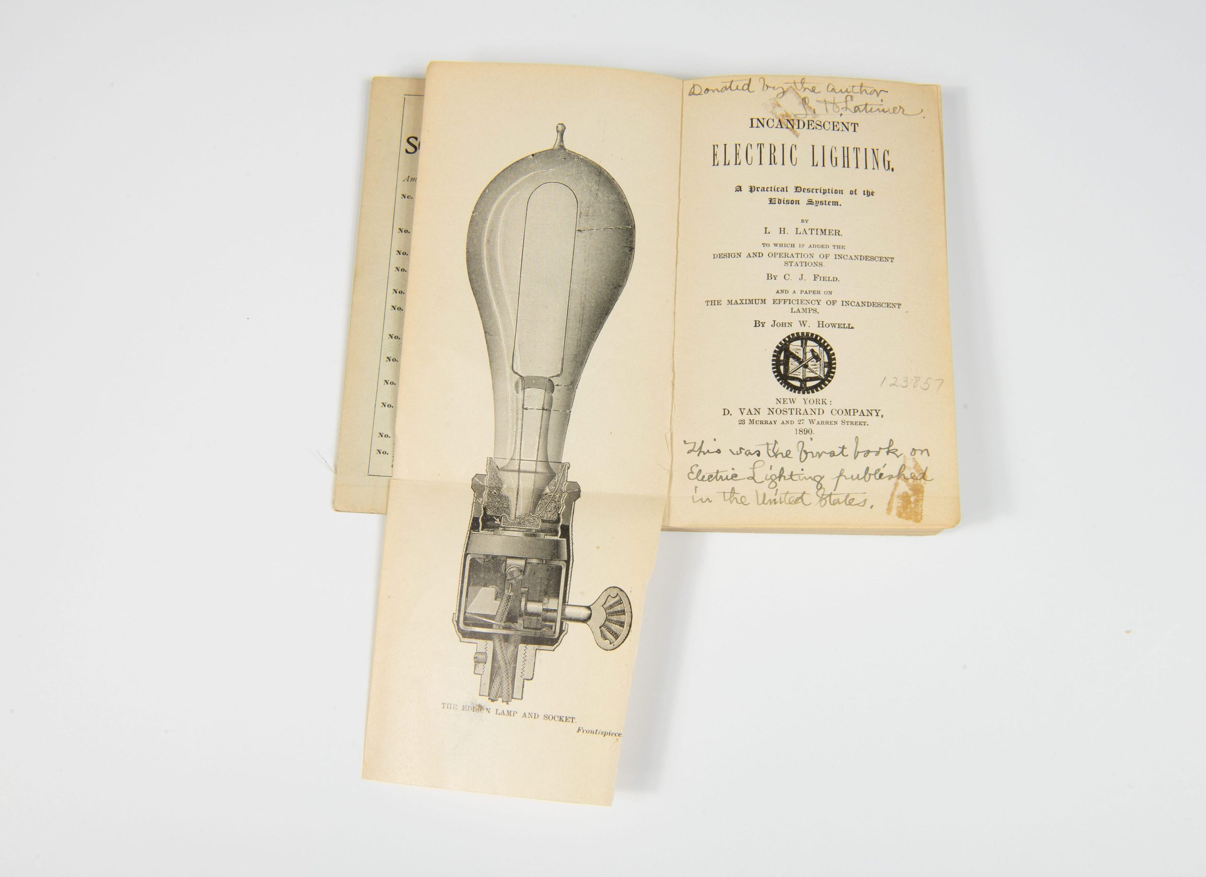“Donated by the author Lewis H. Latimer” (handwritten note). "This was the first book on Electric Lighting published in the United States."Dimensions