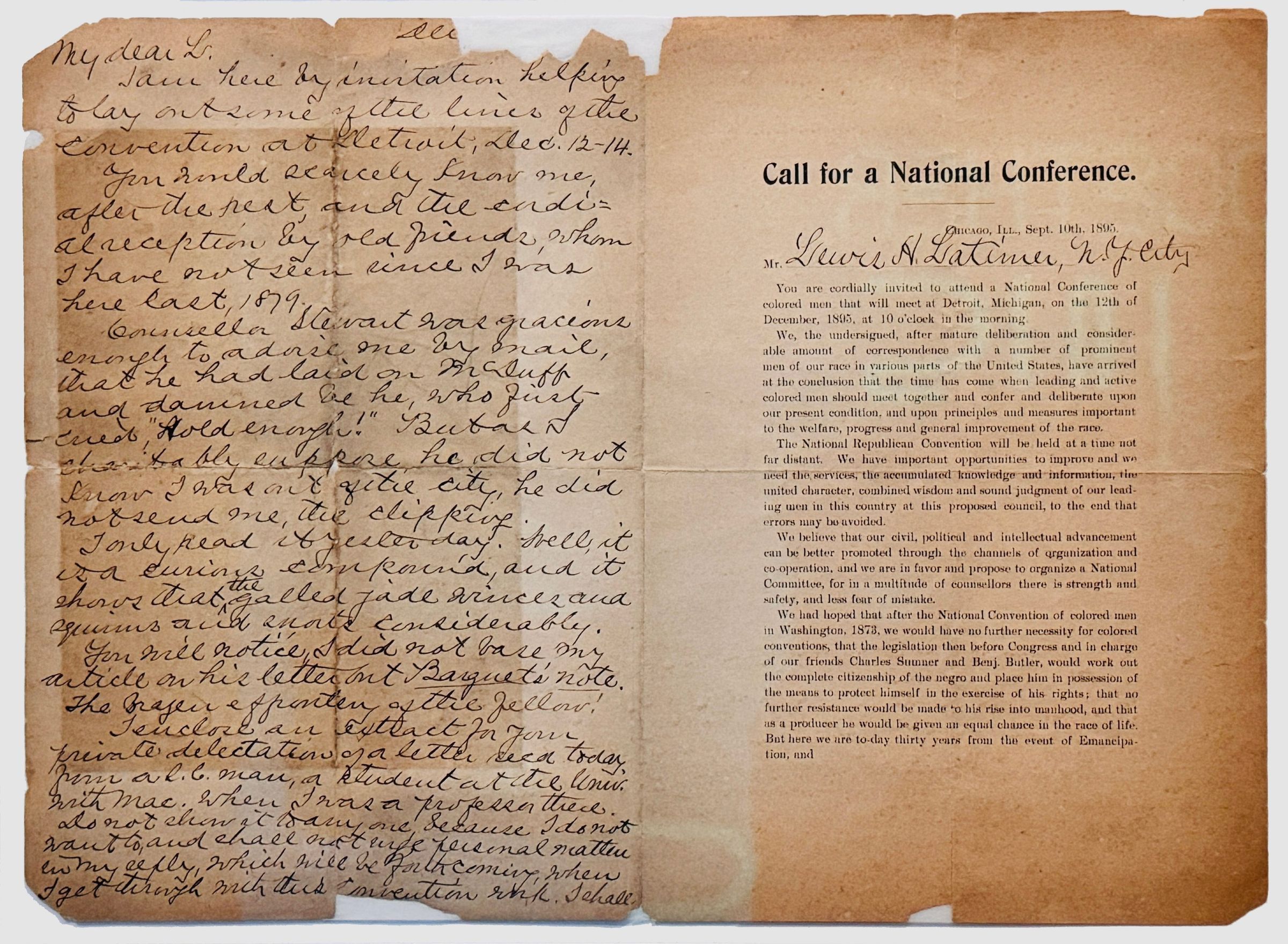This historical document consists of a printed invitation titled "Call for a National Conference" dated September 10, 1895, and a handwritten letter referencing the same event. The printed invitation, addressed to Lewis H. Latimer, invites him to a National Conference of Colored Men, scheduled for December 12, 1895, in Detroit, Michigan. The conference aimed to unite Black leaders and intellectuals to discuss political, economic, and social progress for African Americans, advocating for equal citizenship, representation, and rights.