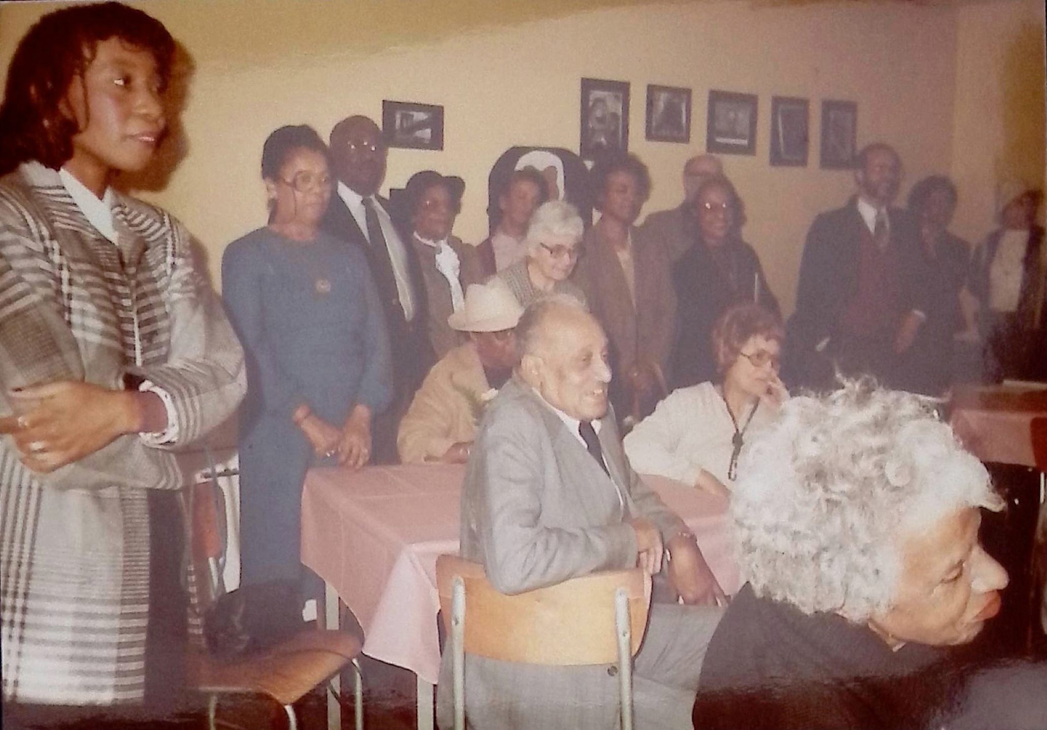 The first image captures a moment at a community gathering, with attendees dressed in formal and semi-formal attire, seated at tables covered with pink tablecloths. The setting appears to be a community hall, with framed photos on the walls. Expressions range from engaged listening to quiet conversations.