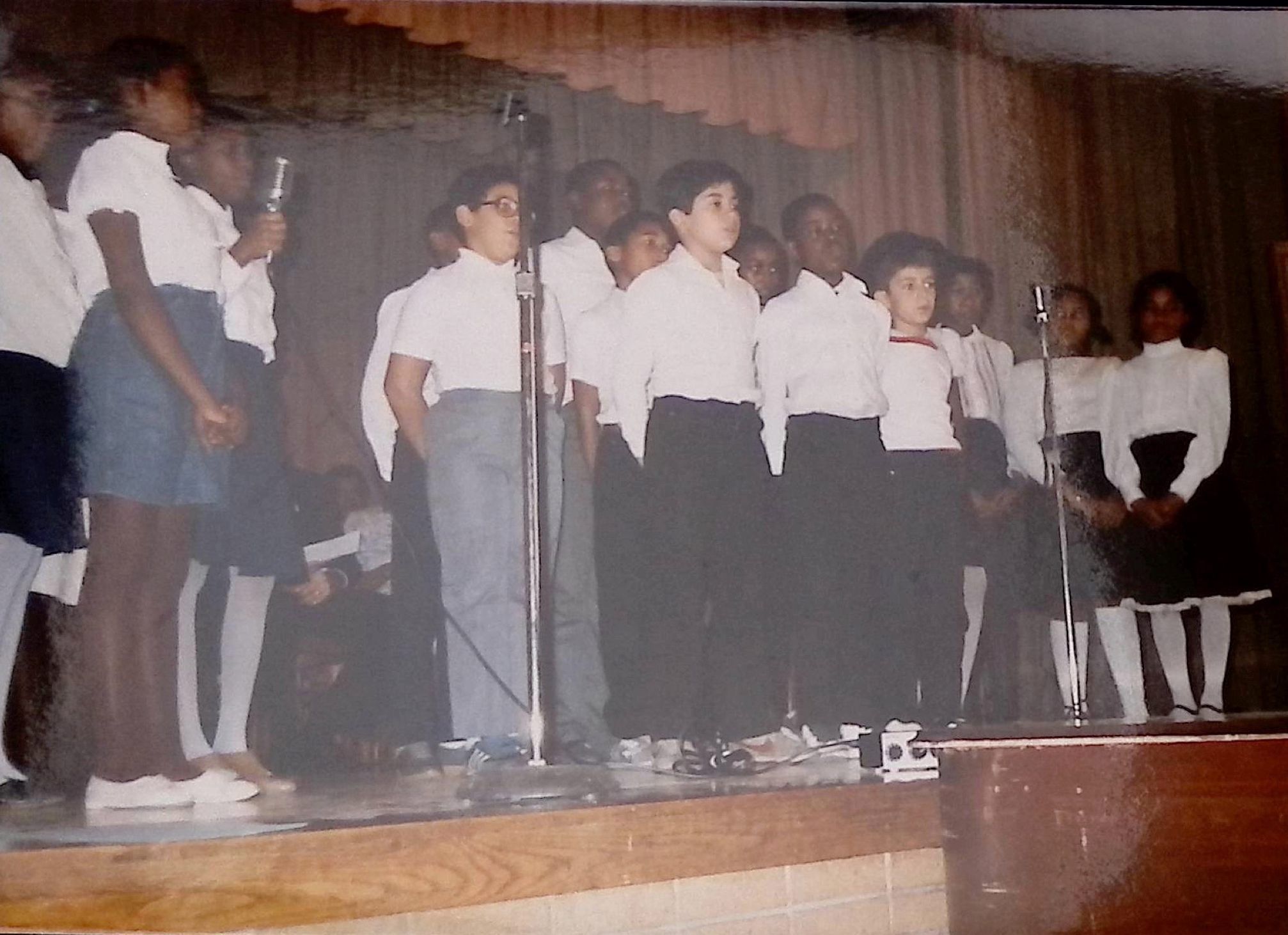 These images depict a community event and a student performance, likely associated with the Lewis H. Latimer community or a related cultural or educational organization. The first image shows a gathering of older and younger individuals in a social setting, possibly a meeting or celebration. The second image features a group of children dressed in white shirts and dark bottoms performing on a stage, suggesting a school or community program.Collection