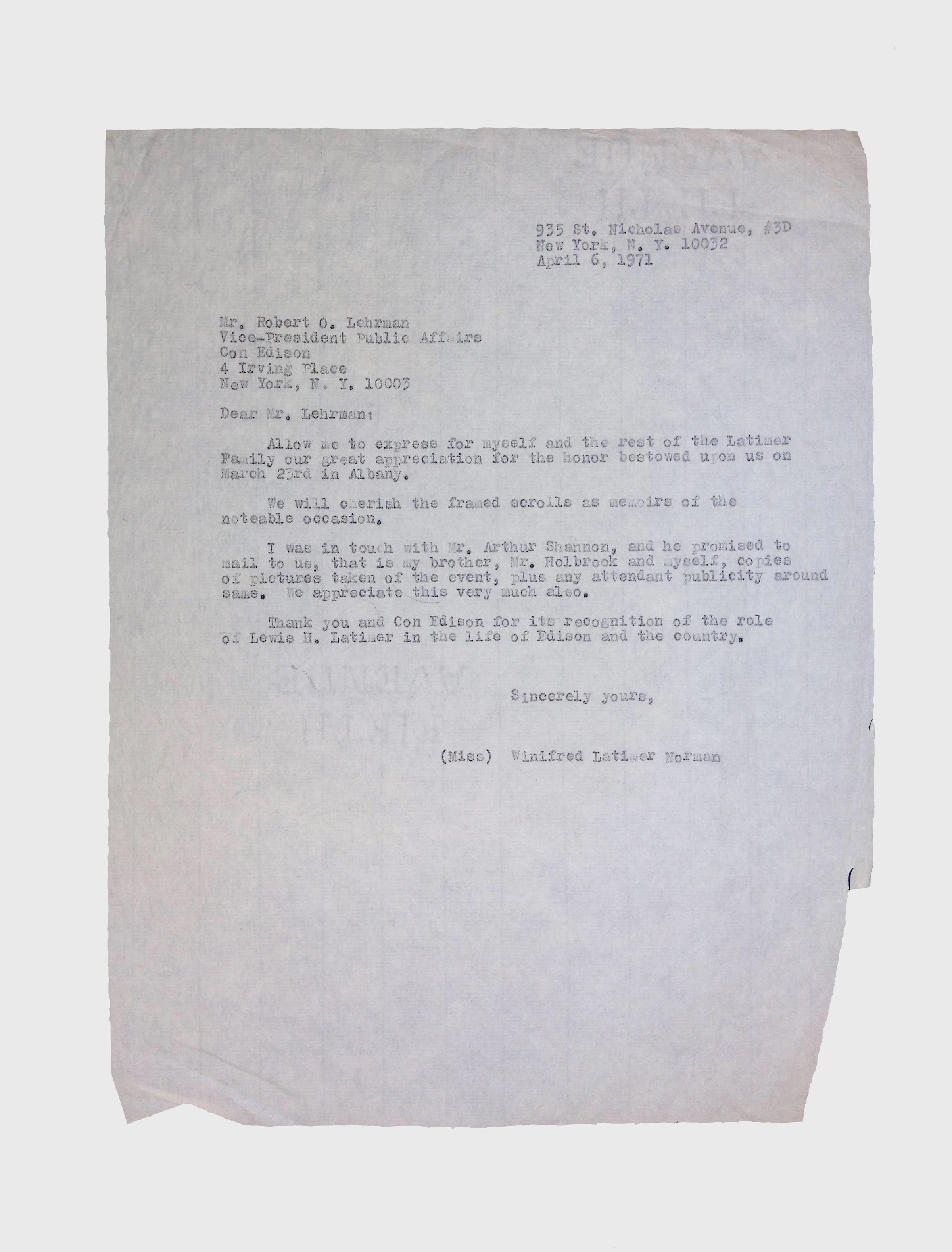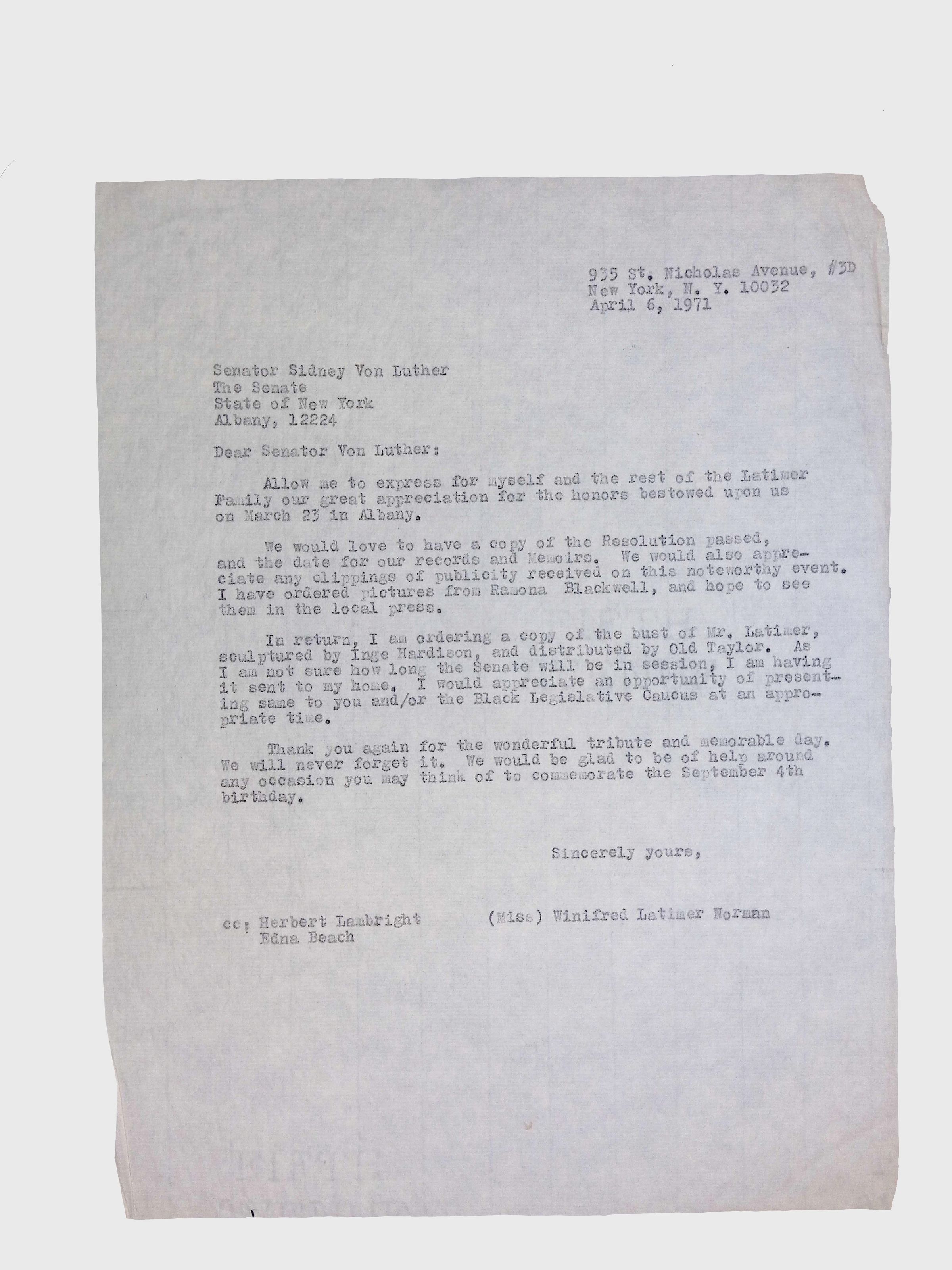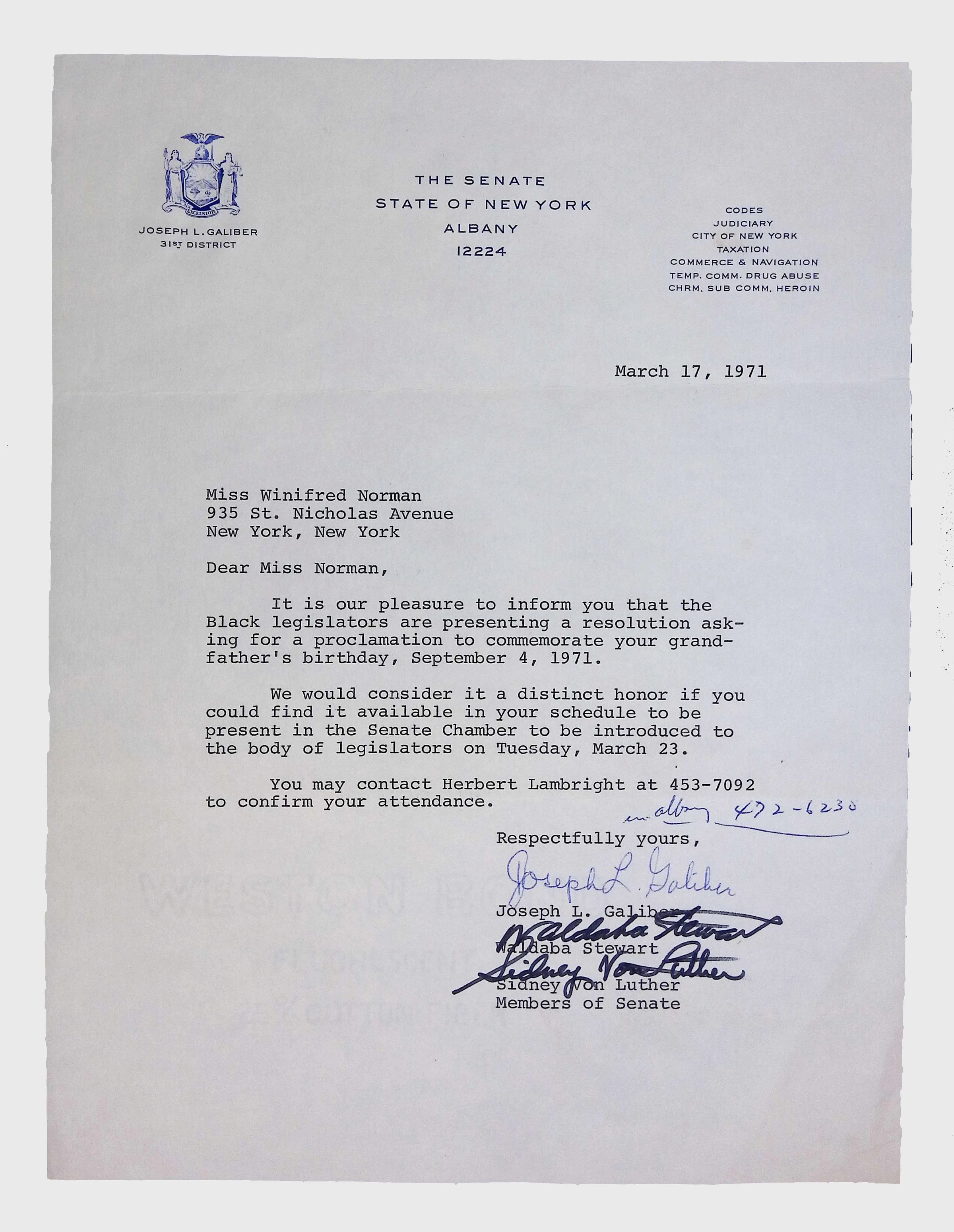 This collection includes formal correspondence, official letters, and related documents, concerning the efforts of Latimer family members, especially Winifred Norman, to have a resolution passed in the New York State Senate honoring Lewis H. Latimer’s birthday (September 4).Context