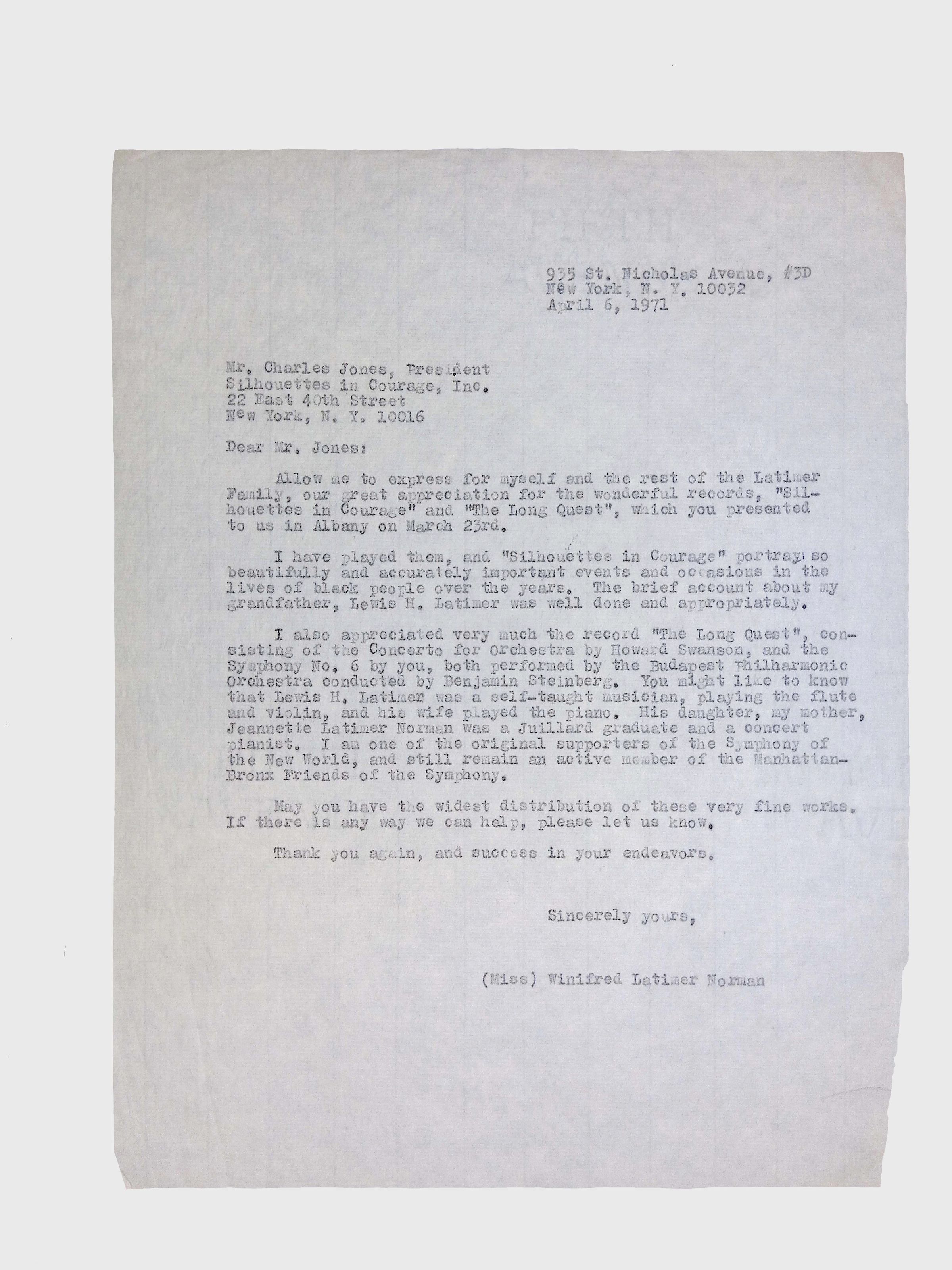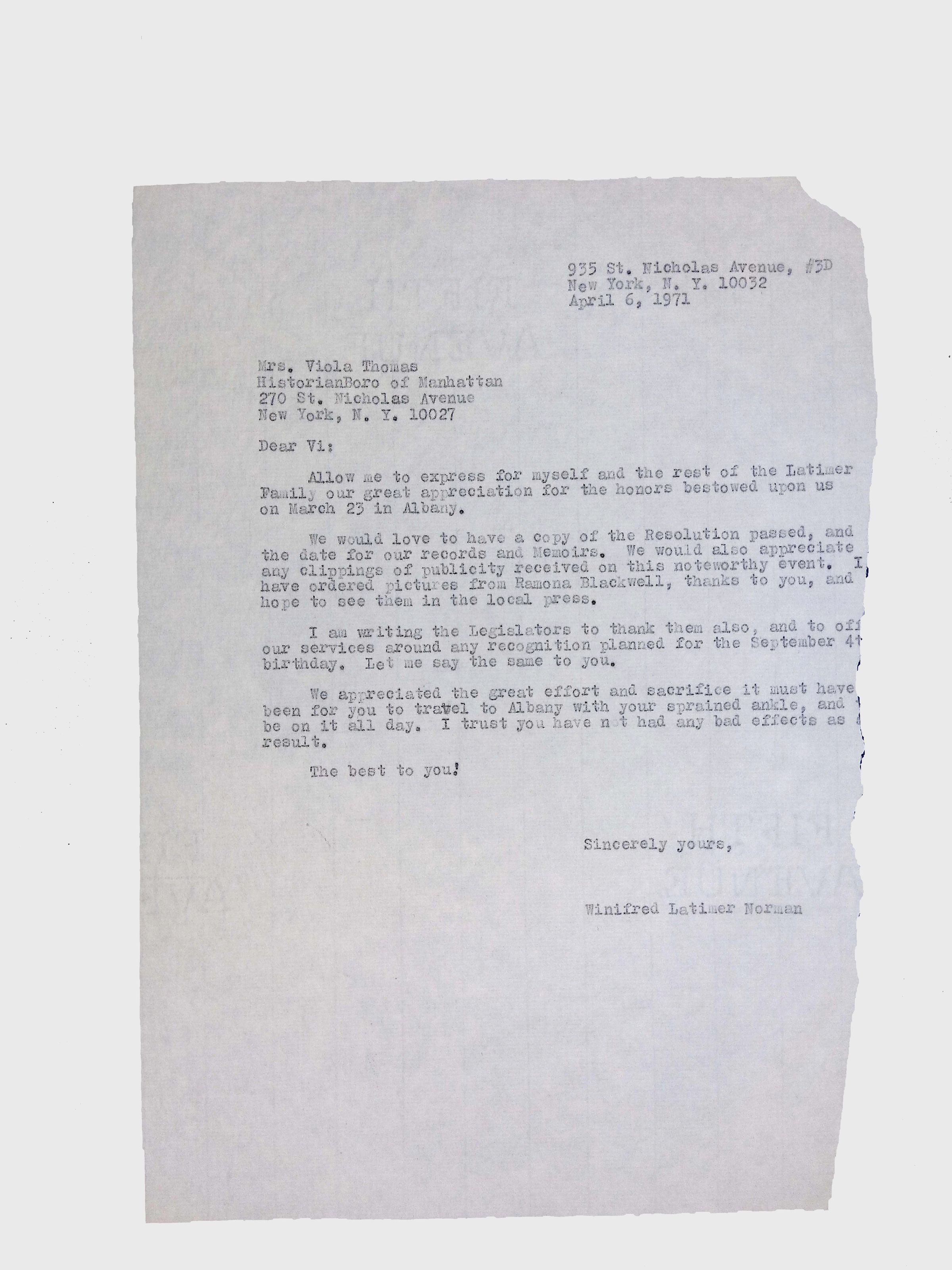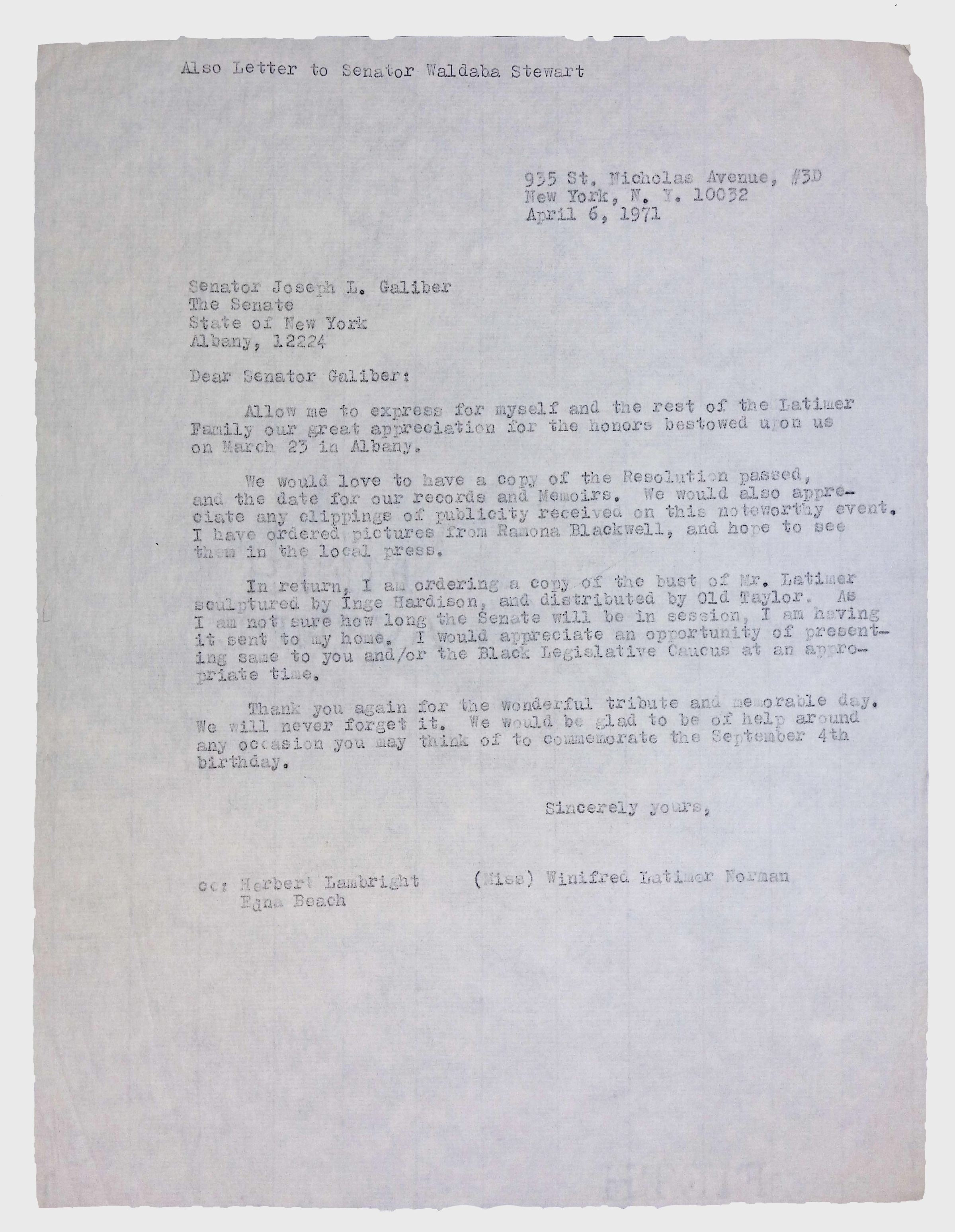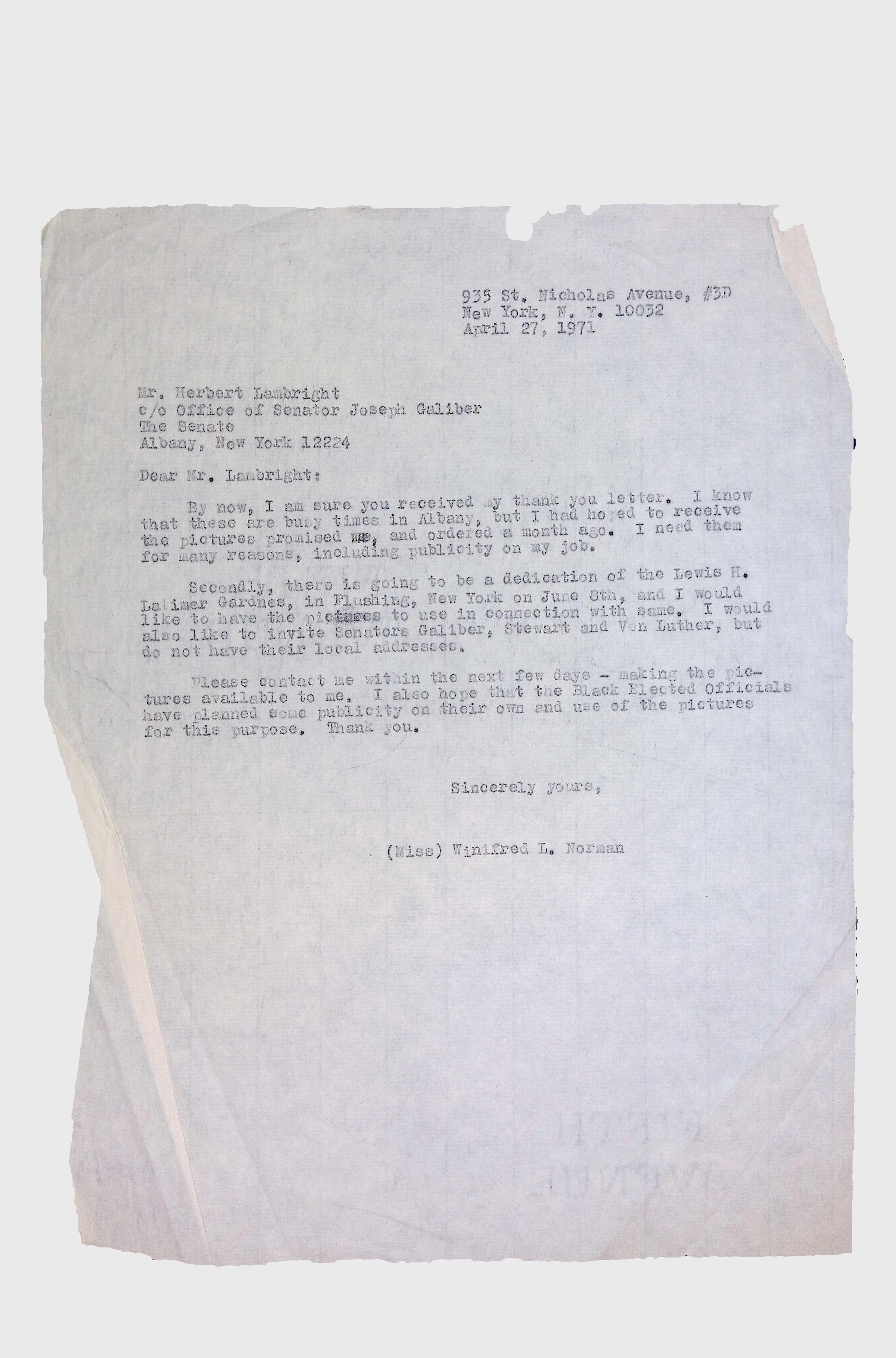 This collection includes formal correspondence, official letters, and related documents, concerning the efforts of Latimer family members, especially Winifred Norman, to have a resolution passed in the New York State Senate honoring Lewis H. Latimer’s birthday (September 4).Context