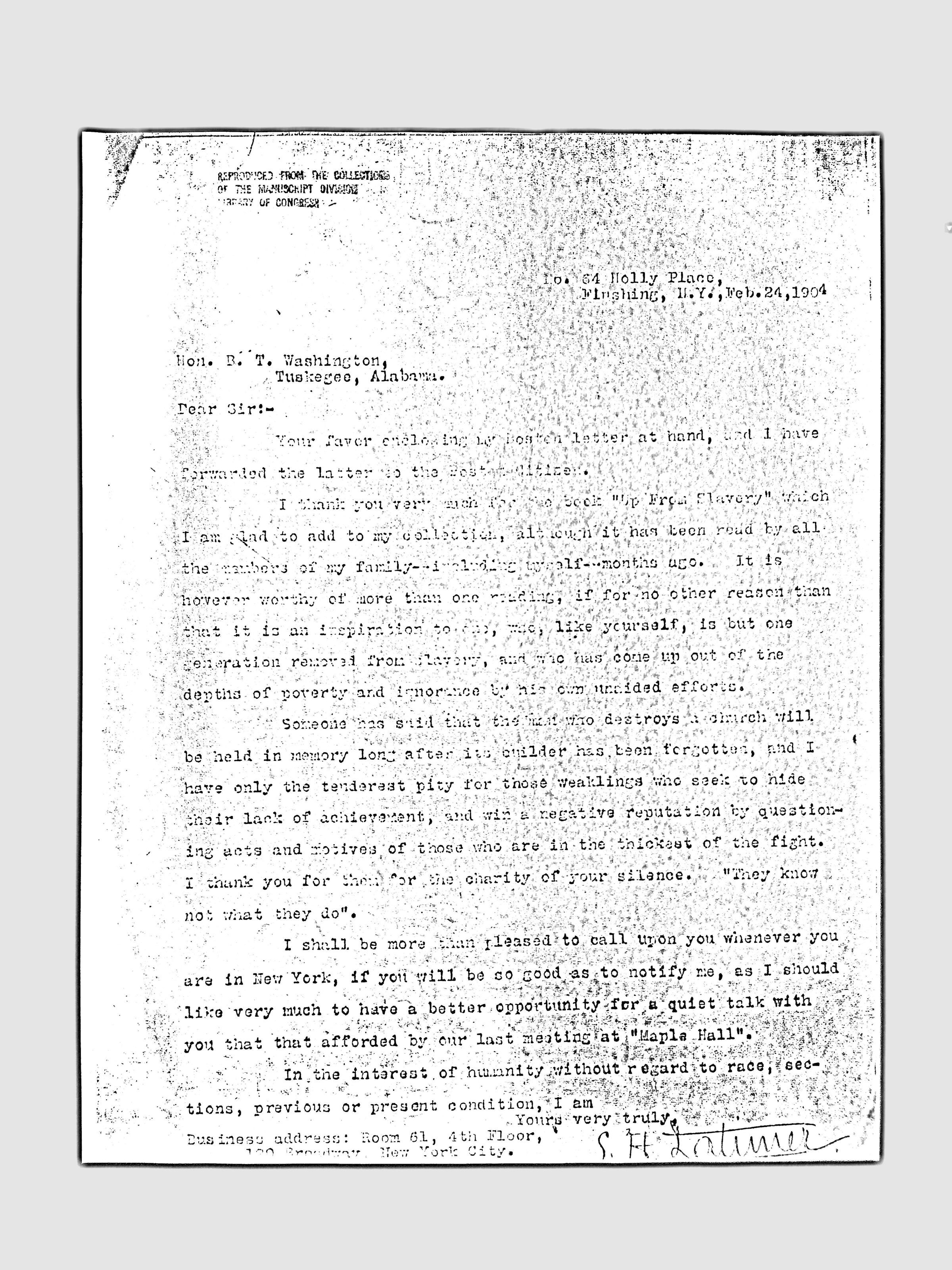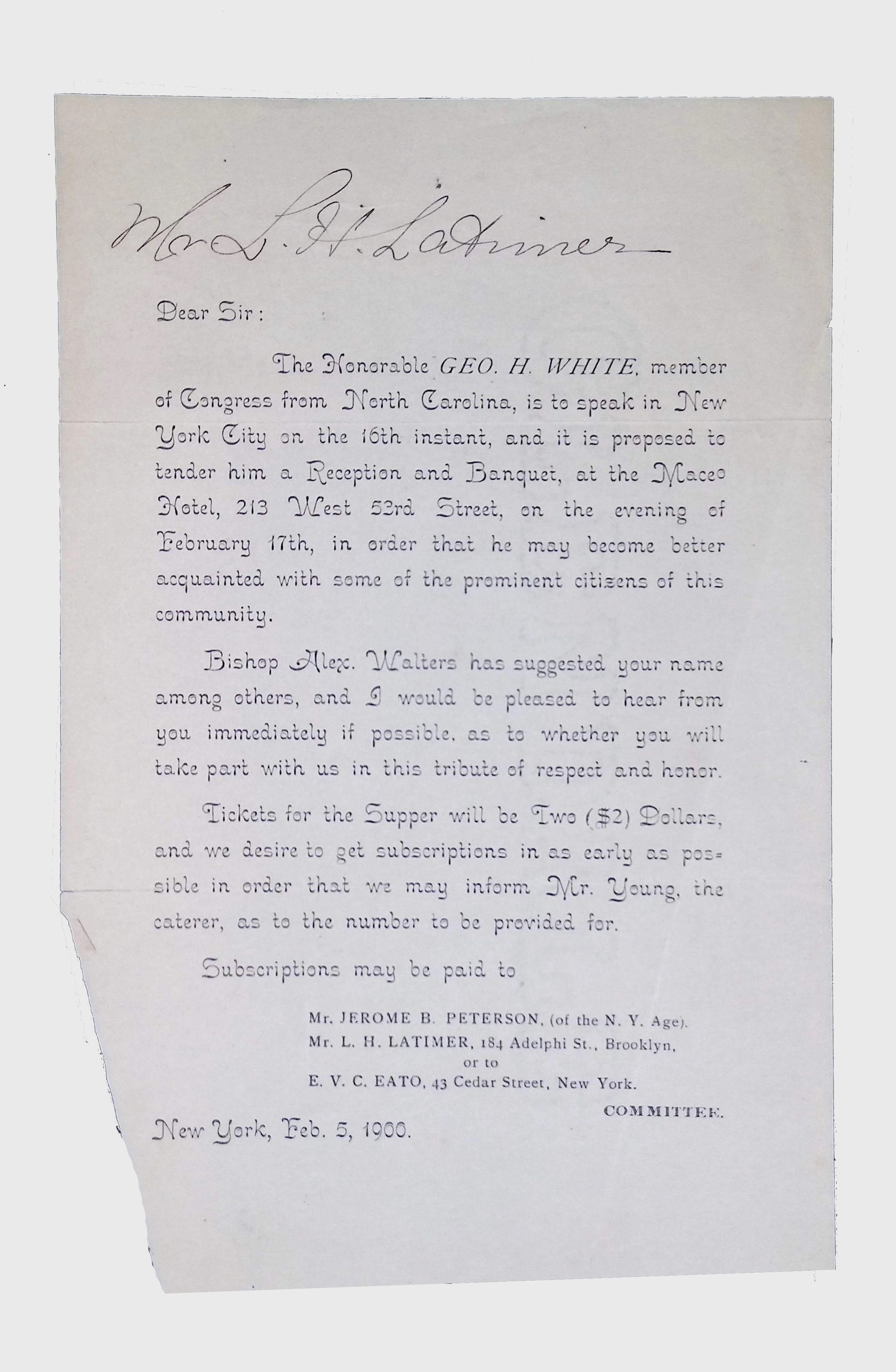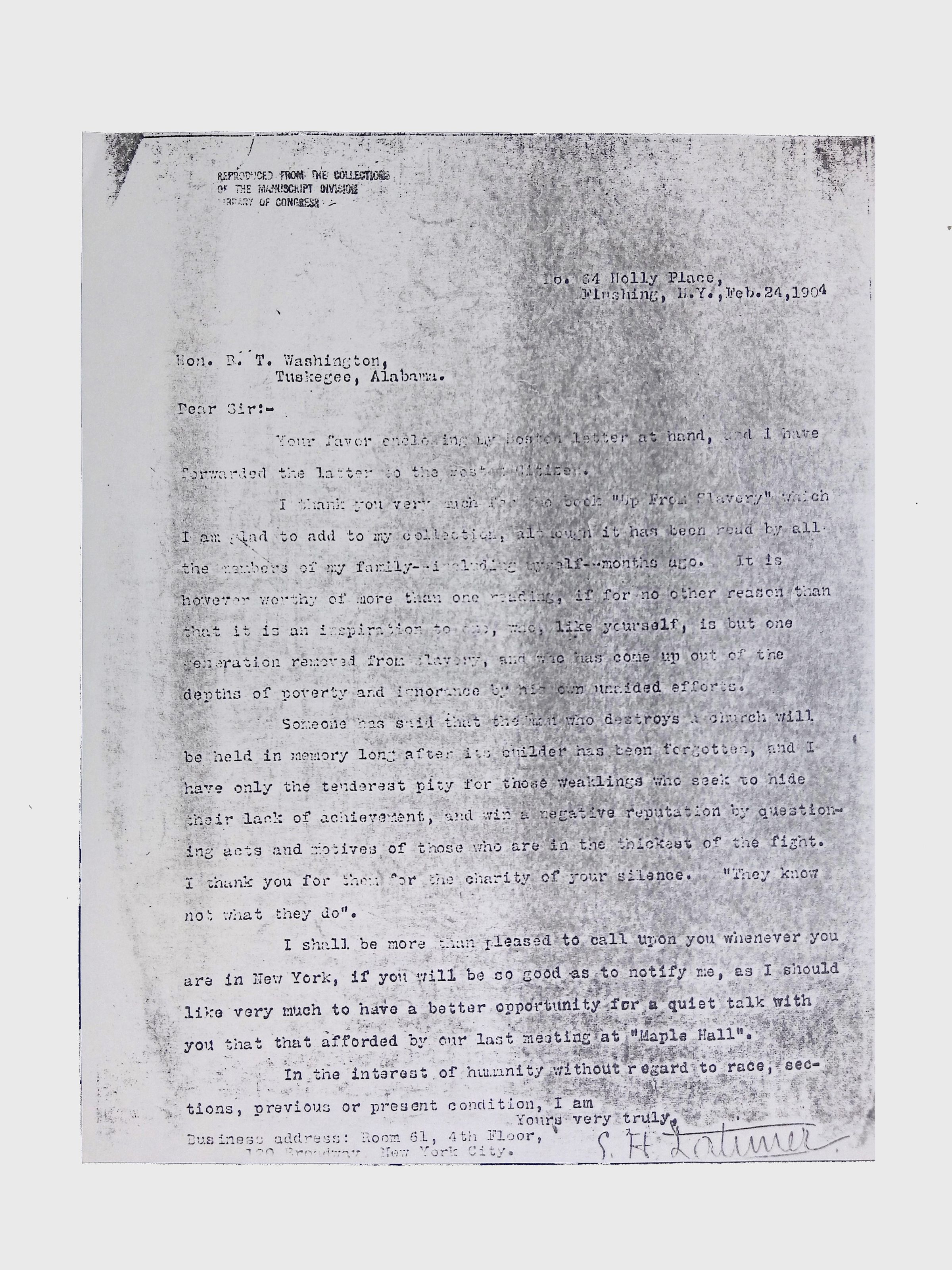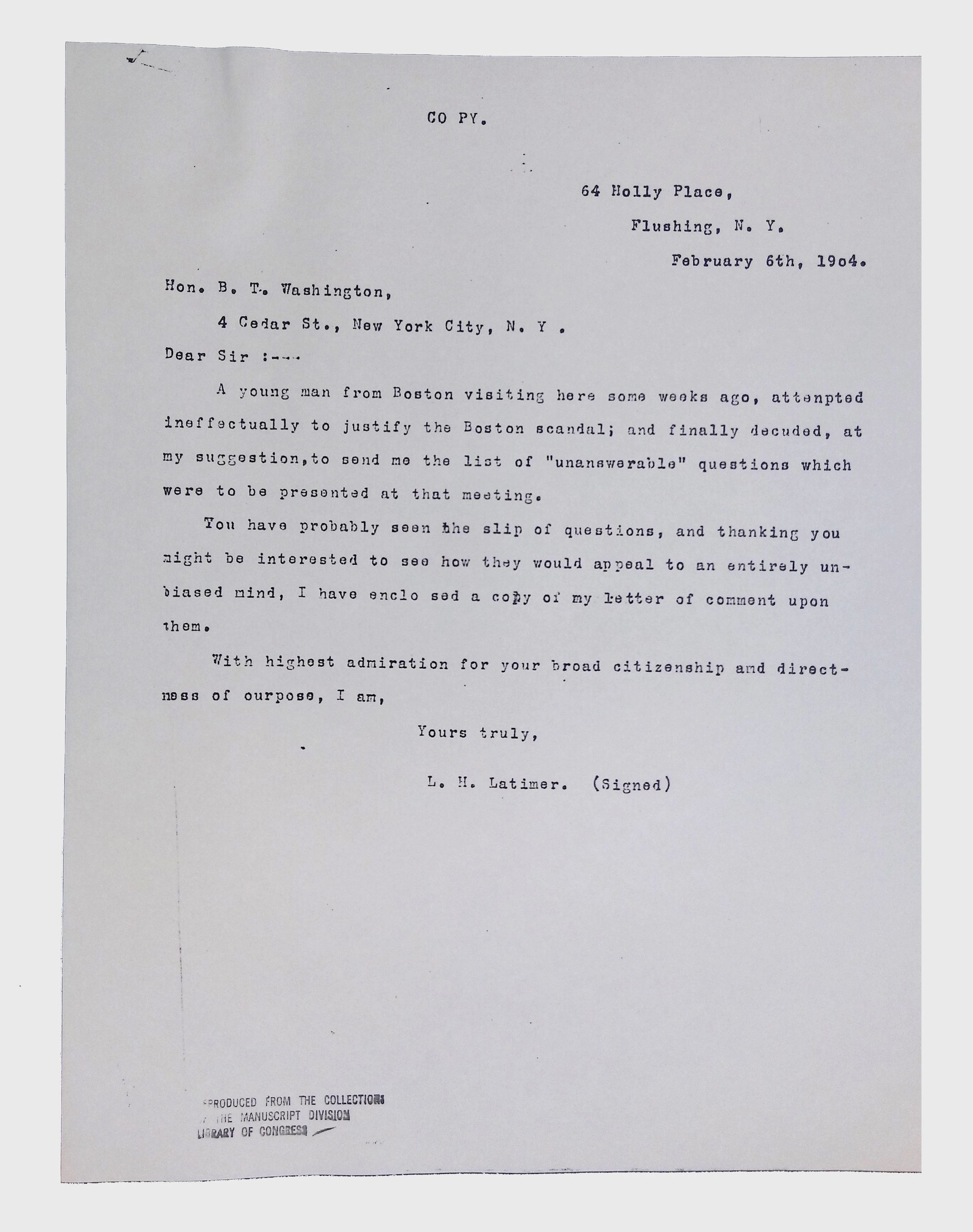 This folder contains miscellaneous correspondence and poetry between Lewis H. Latimer and several acquaintances and friends. Notably, it contains letters (and copies of letters) between Latimer and notable figures in early twentieth-century African American activism and public life, including Booker T. Washington, Emmett Scott, Rosamond Johnson, John Edward Bruce (“Bruce Grit”), George F. Grant, Samuel R. Scottron, and Richard T. Greener.Context