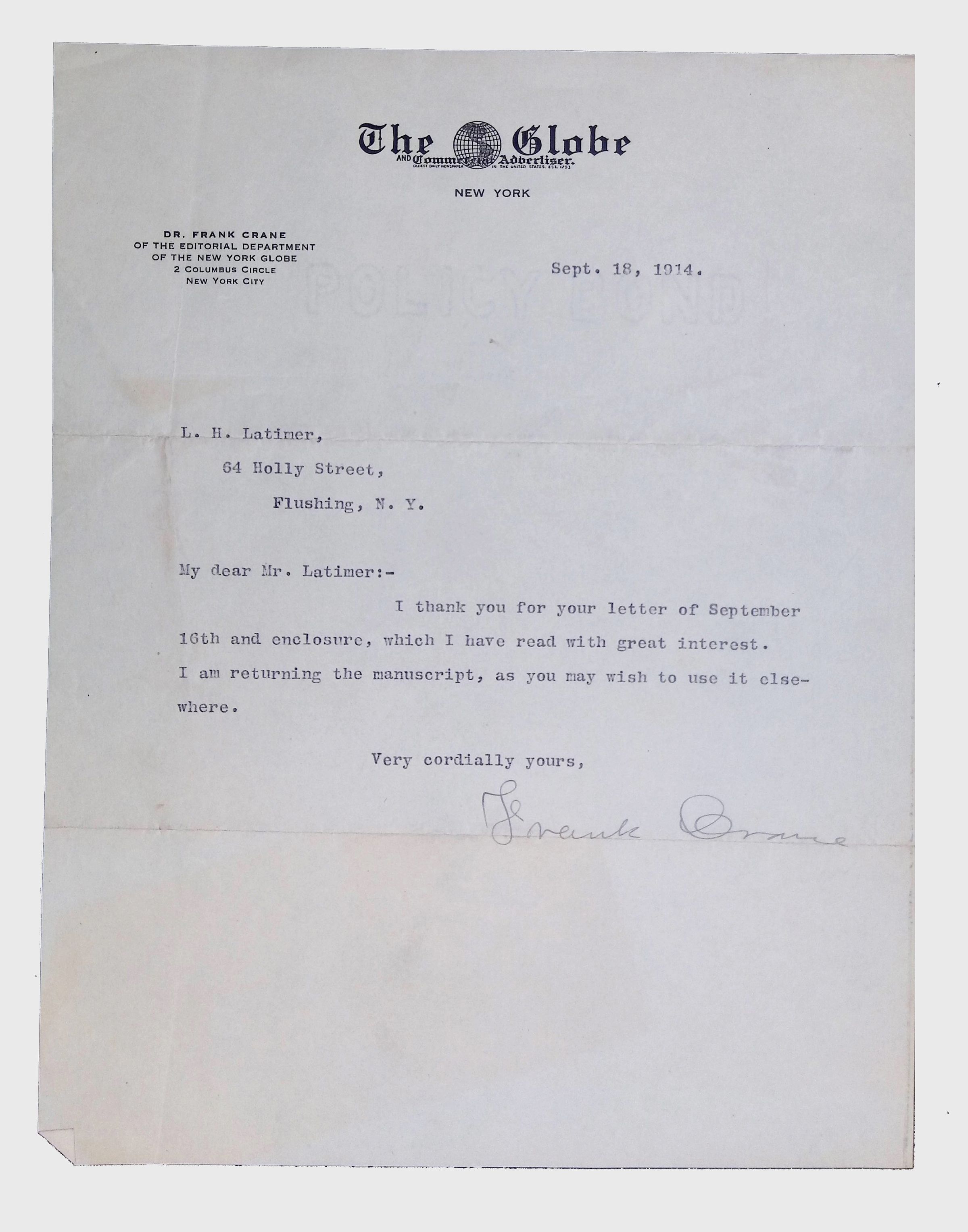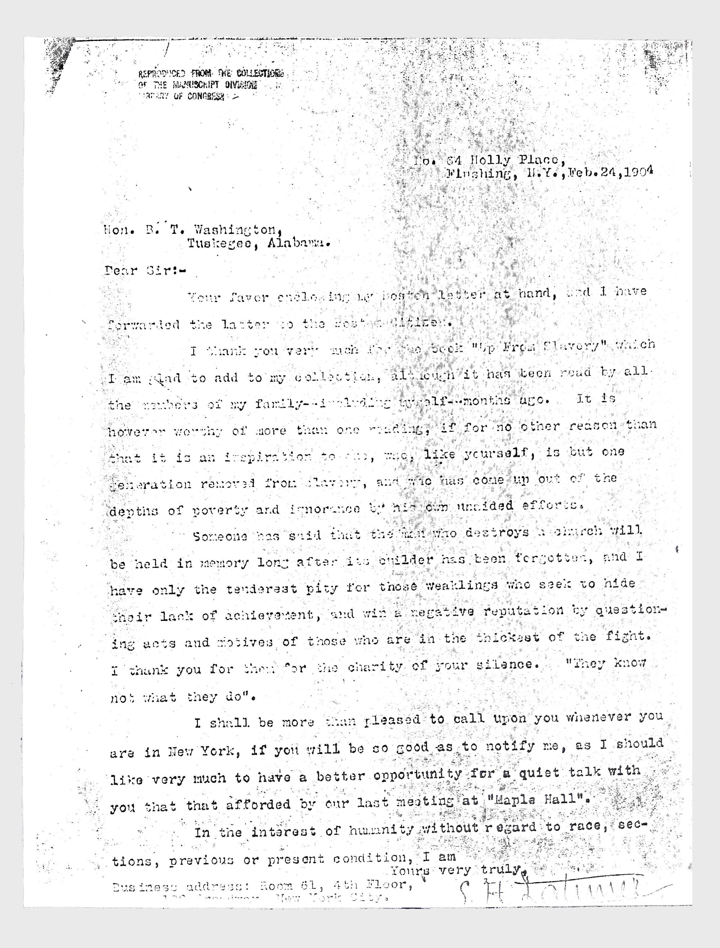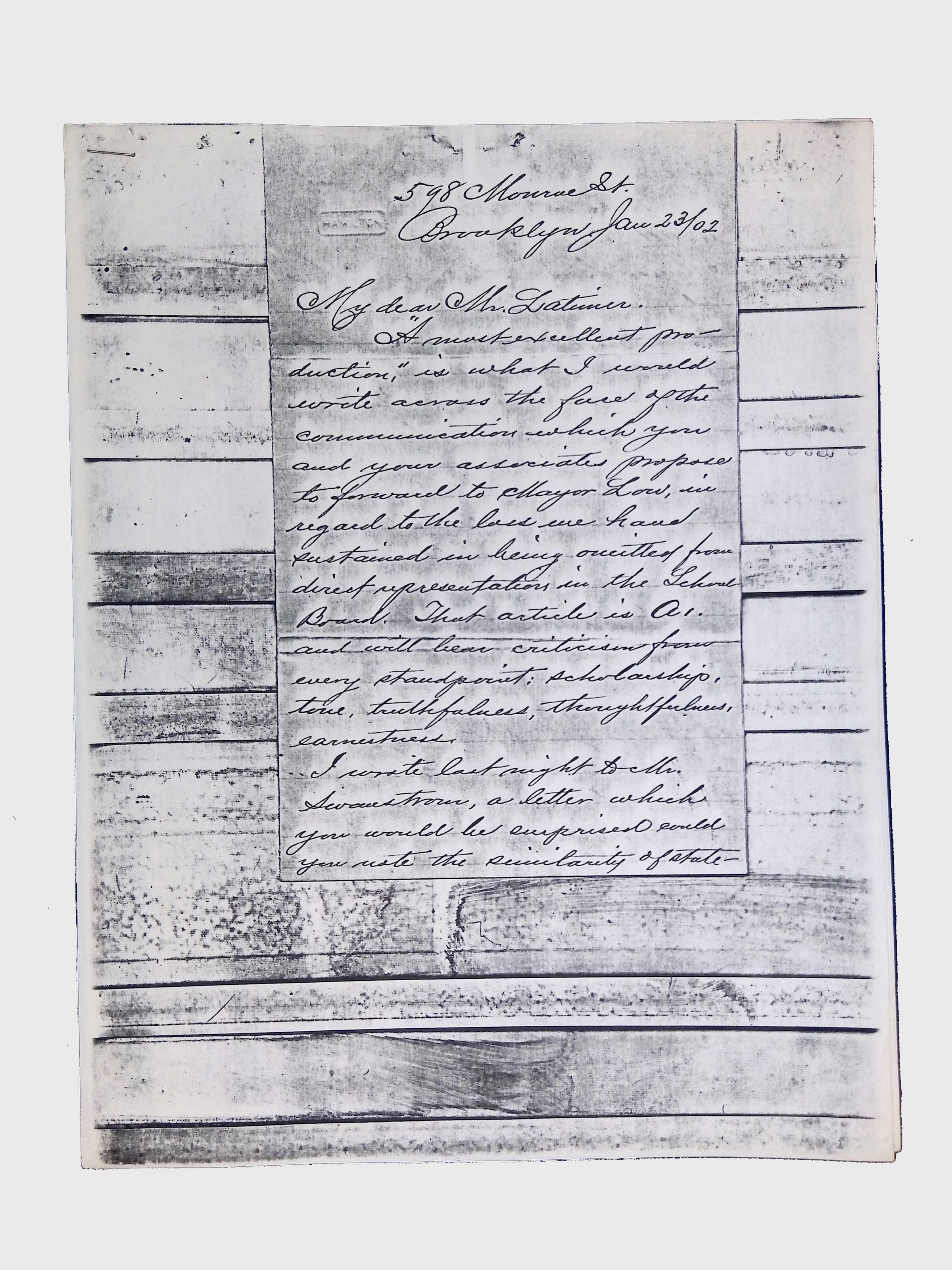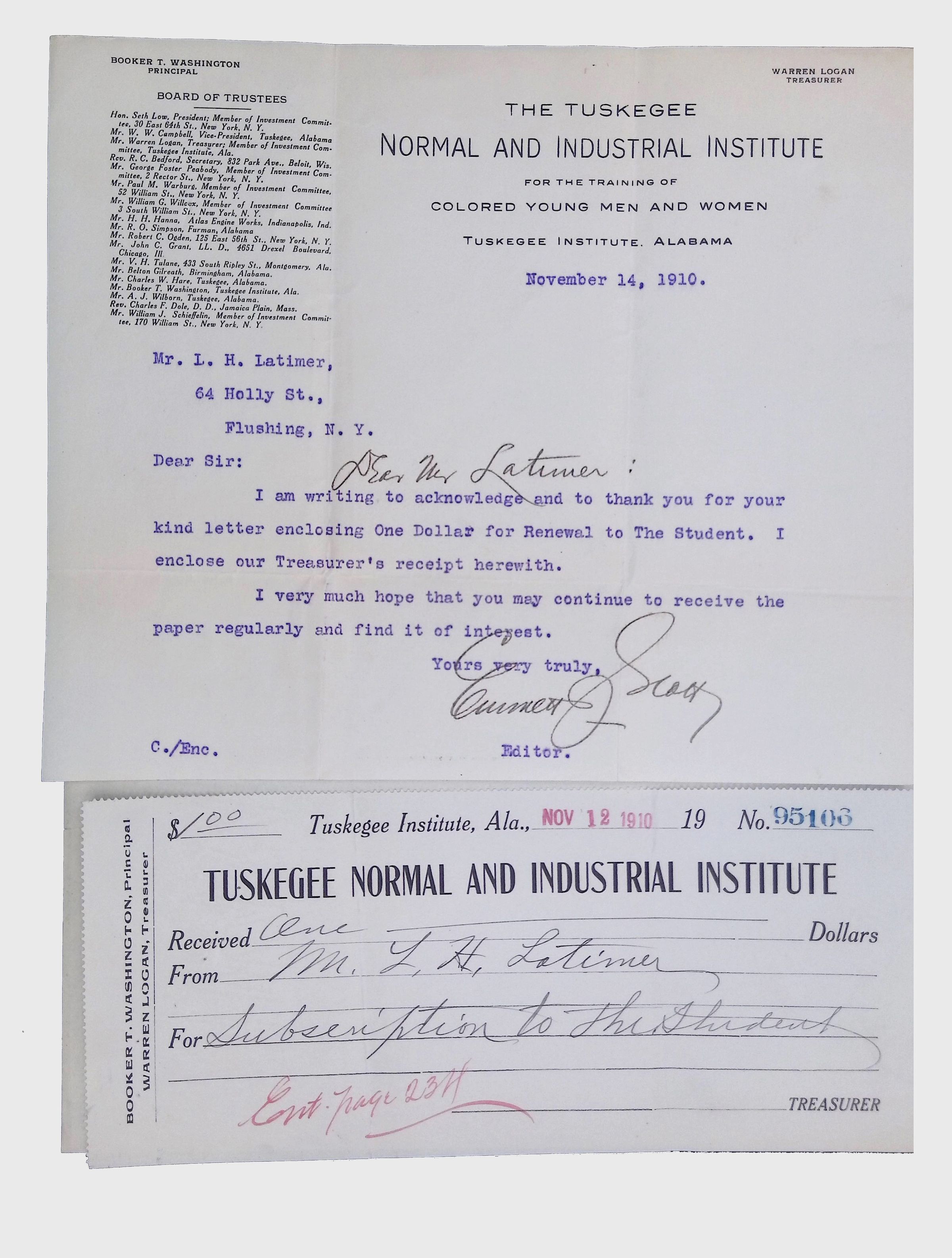 This folder contains miscellaneous correspondence and poetry between Lewis H. Latimer and several acquaintances and friends. Notably, it contains letters (and copies of letters) between Latimer and notable figures in early twentieth-century African American activism and public life, including Booker T. Washington, Emmett Scott, Rosamond Johnson, John Edward Bruce (“Bruce Grit”), George F. Grant, Samuel R. Scottron, and Richard T. Greener.Context