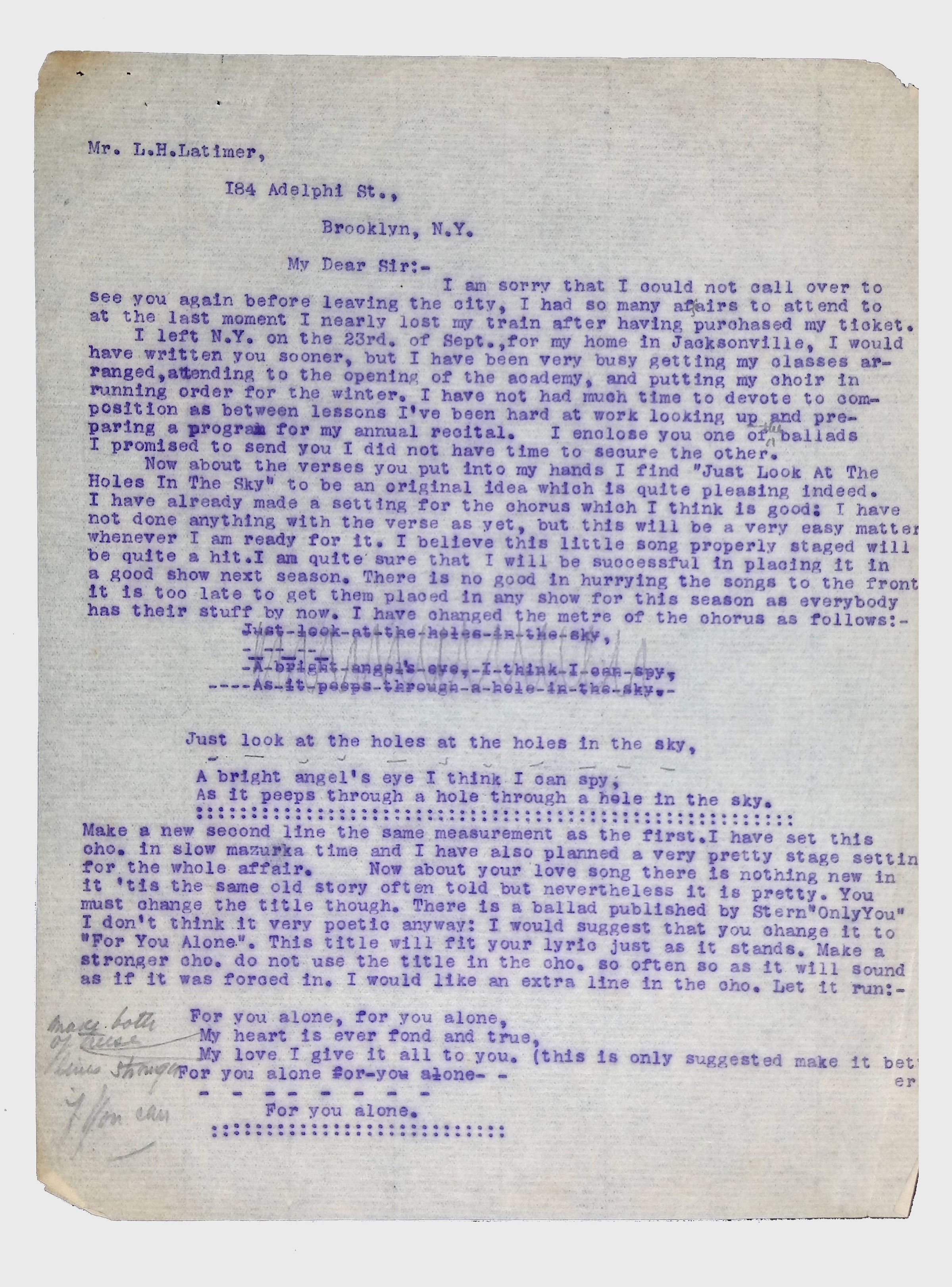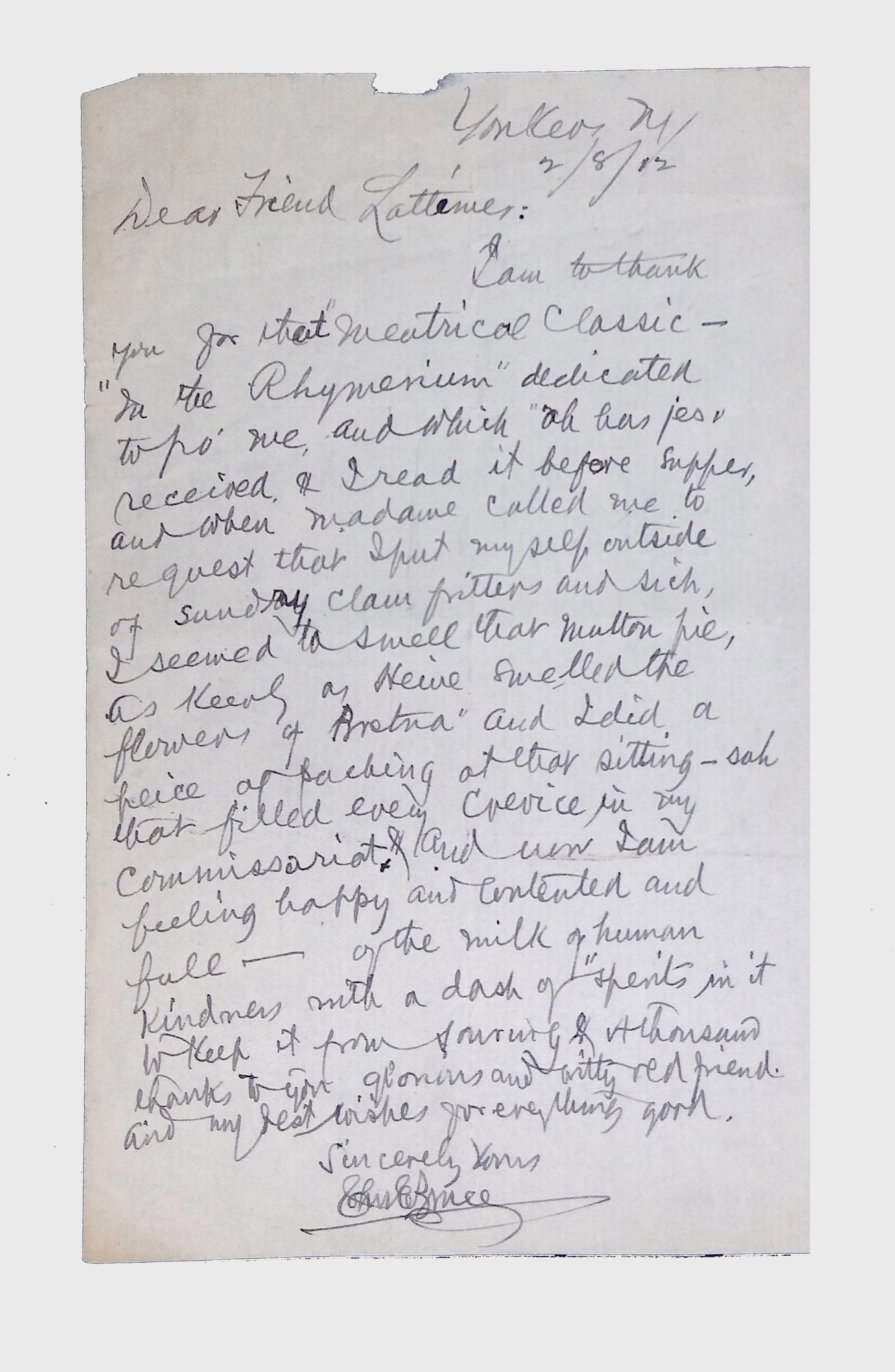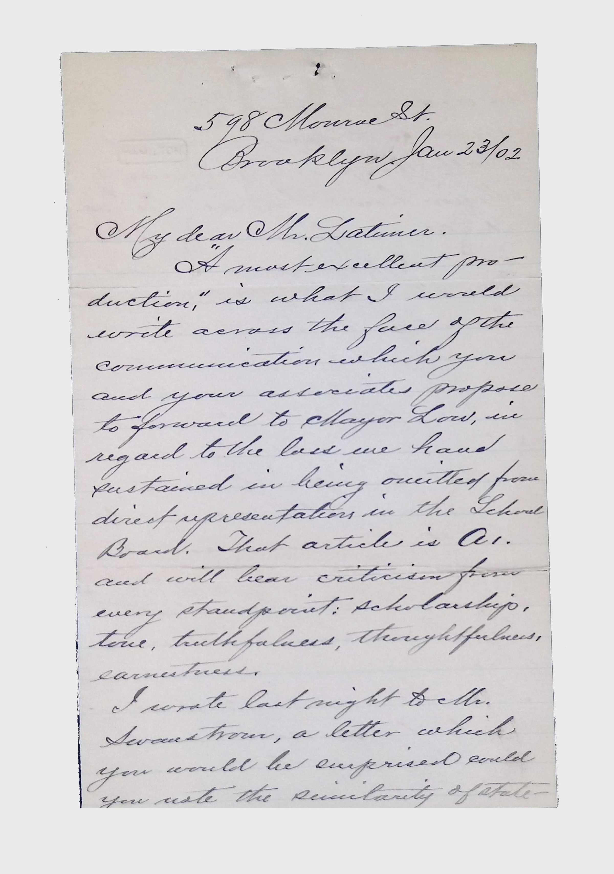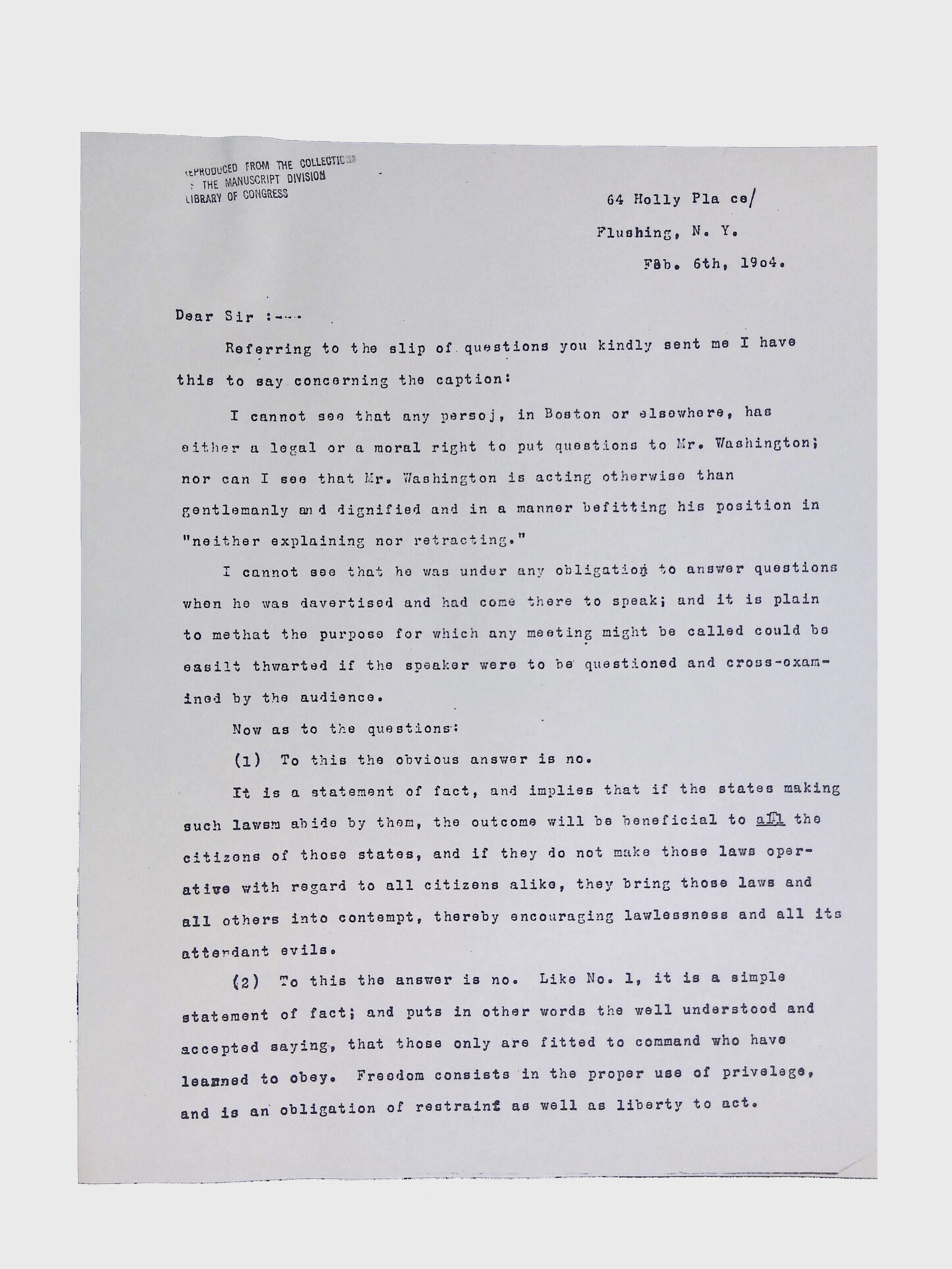 This folder contains miscellaneous correspondence and poetry between Lewis H. Latimer and several acquaintances and friends. Notably, it contains letters (and copies of letters) between Latimer and notable figures in early twentieth-century African American activism and public life, including Booker T. Washington, Emmett Scott, Rosamond Johnson, John Edward Bruce (“Bruce Grit”), George F. Grant, Samuel R. Scottron, and Richard T. Greener.Context