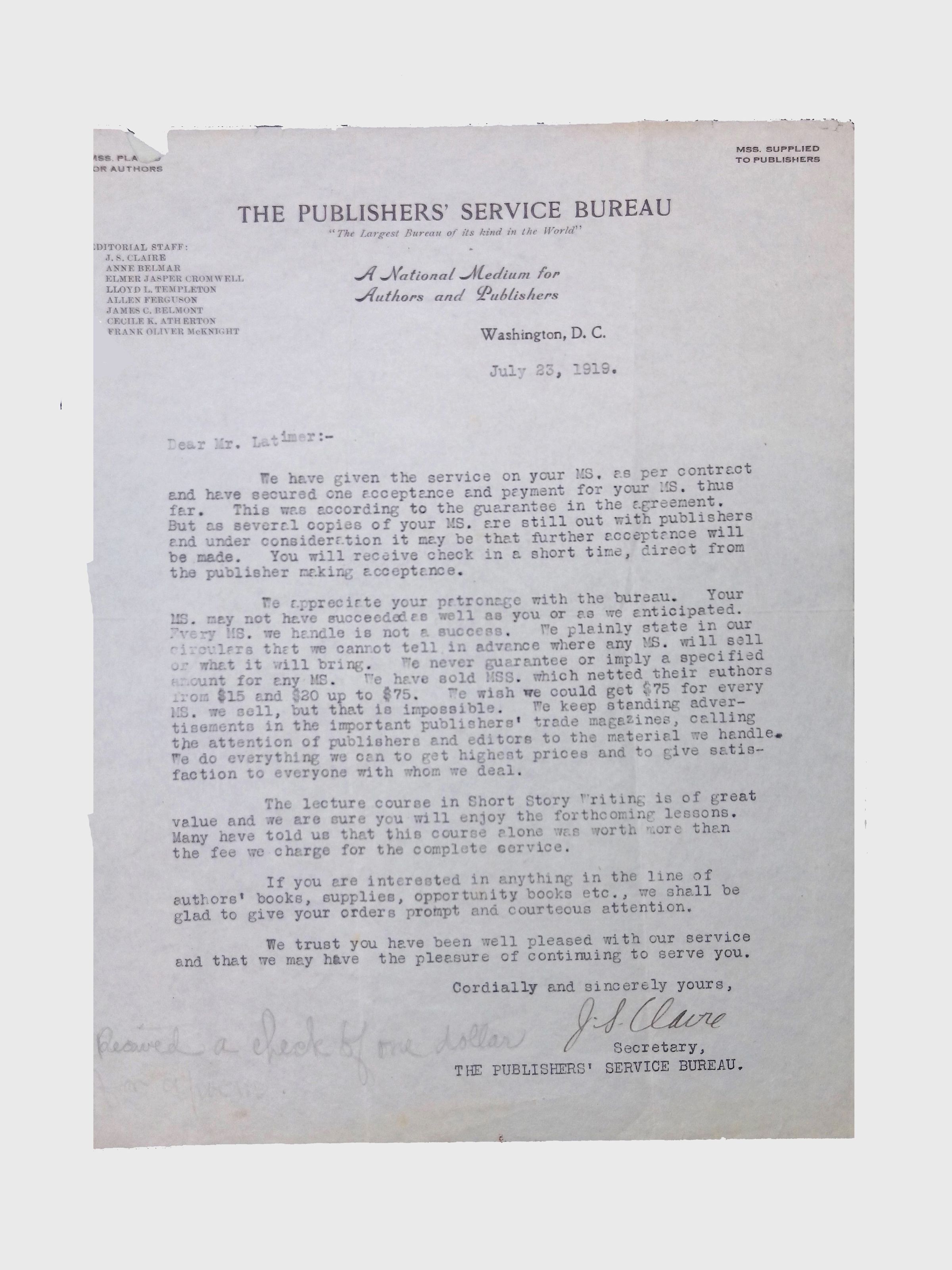 Dated July 23, 1919, this letter from The Publishers' Service Bureau in Washington, D.C., addresses Latimer regarding his manuscript submission.Collection