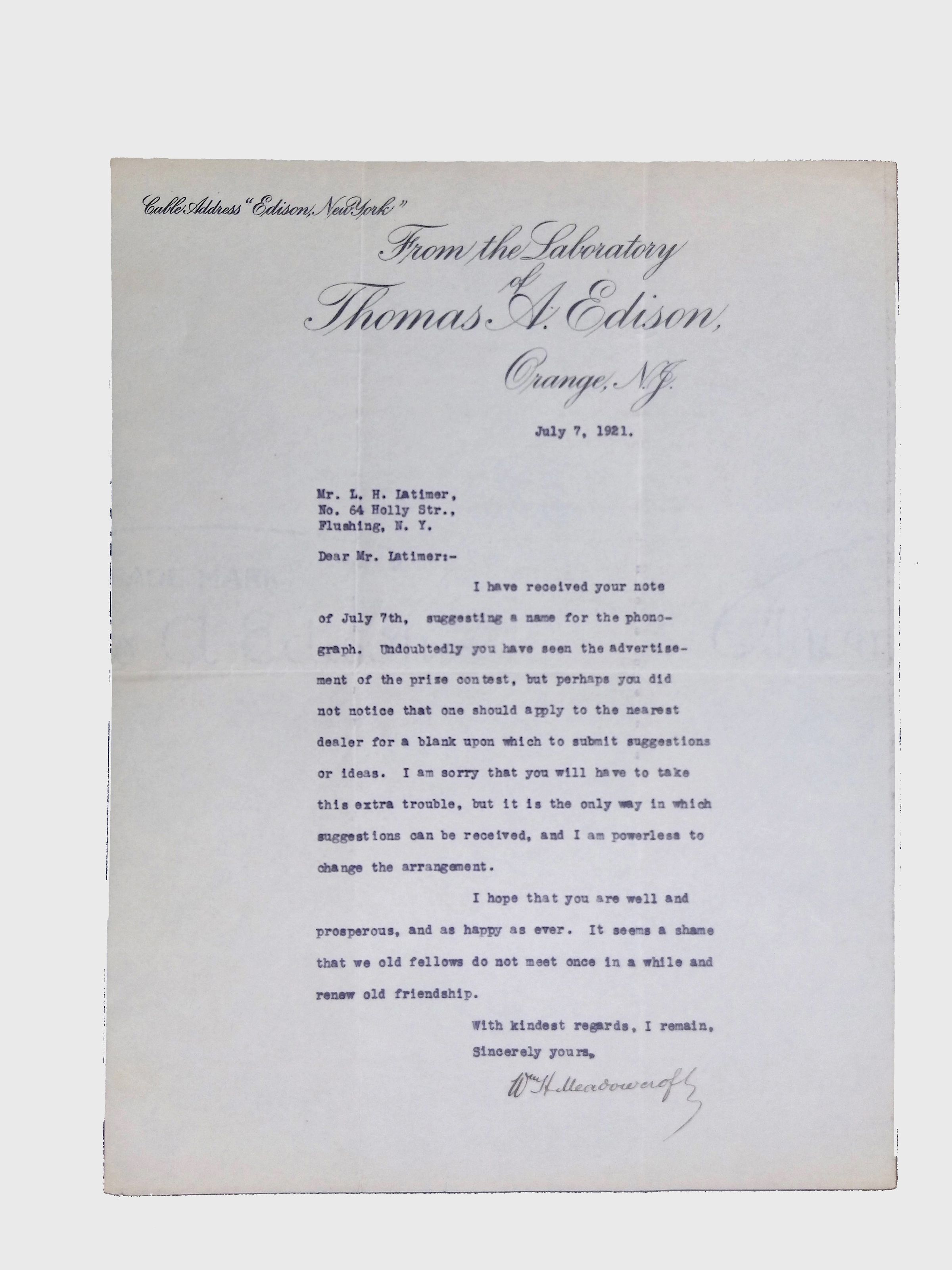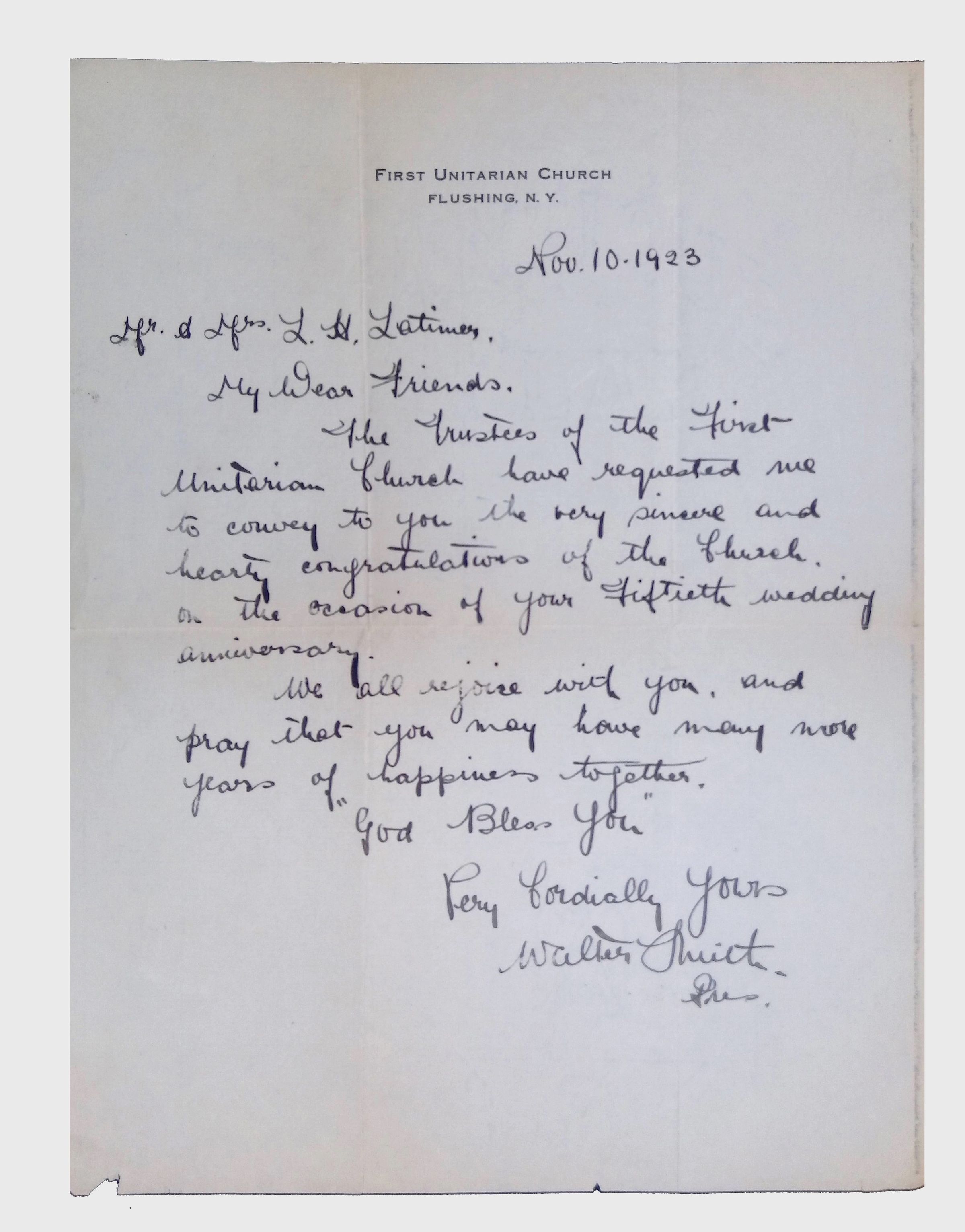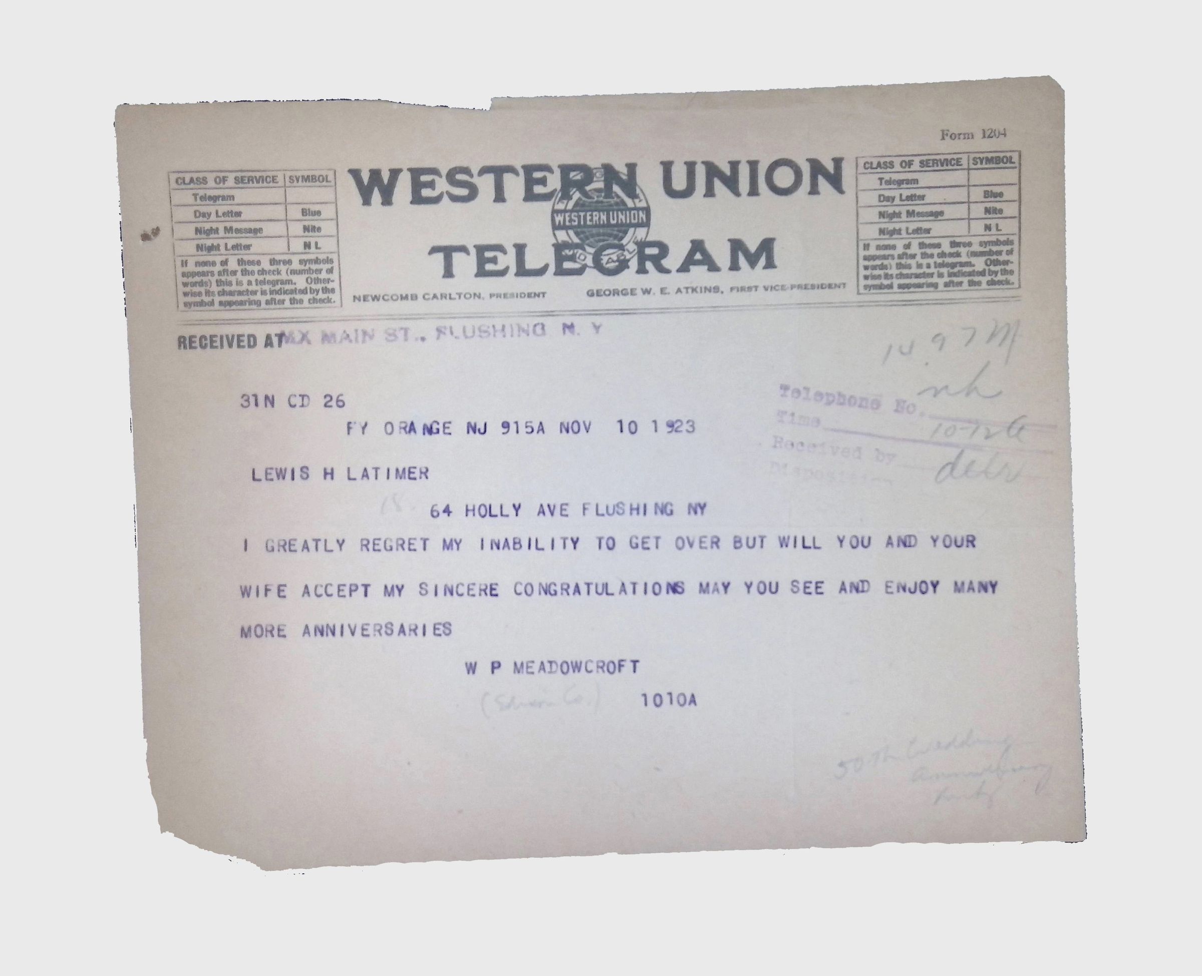 This folder contains a miscellaneous assortment of letters addressed to Lewis H. Latimer, including congratulations to Lewis and Mary Latimer on their Golden wedding anniversary (1923) and “regrets” from invited guests who could not attend their anniversary party, an extended family reminiscence by Lewis Latimer’s nephew Cornelius McKeel (also called “Neal”) at the time of the Latimers’ anniversary, a letter to Lewis Latimer’s daughter Jeannette Norman from W.E.B. DuBois informing her that a song she wrote has been awarded Second Prize in a contest held by The Crisis magazine (1927), and a letter from William H. Meadowcroft, Thomas Edison’s secretary, to Lewis Latimer (1921).Context