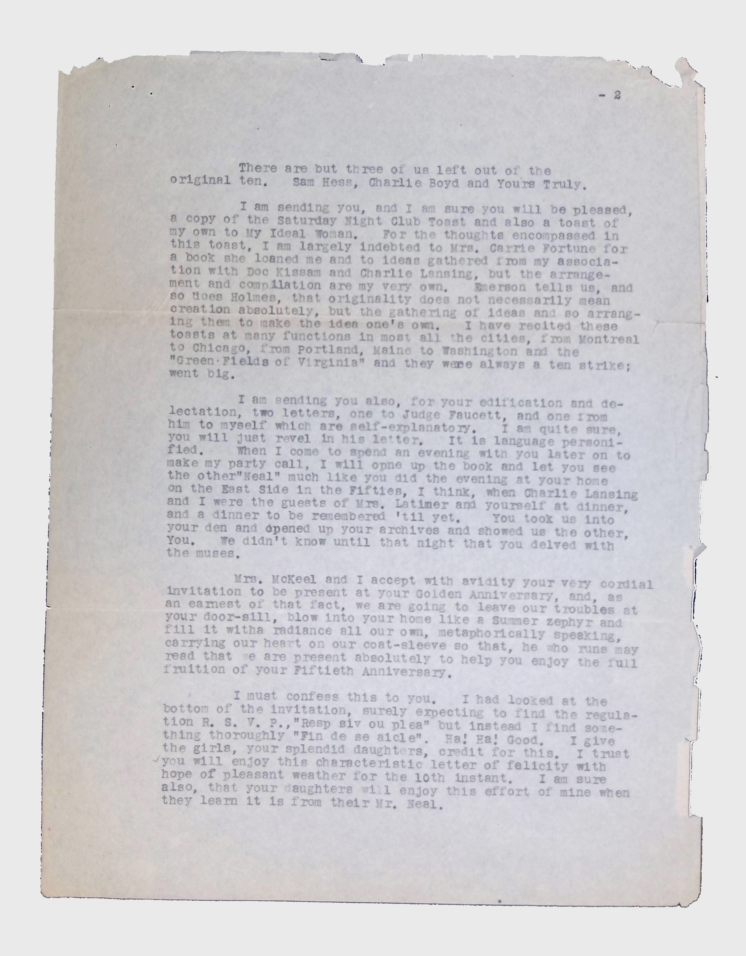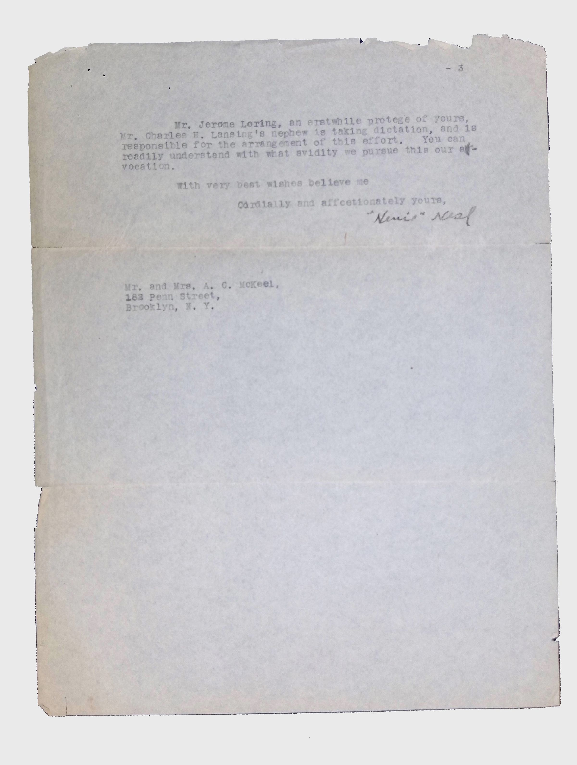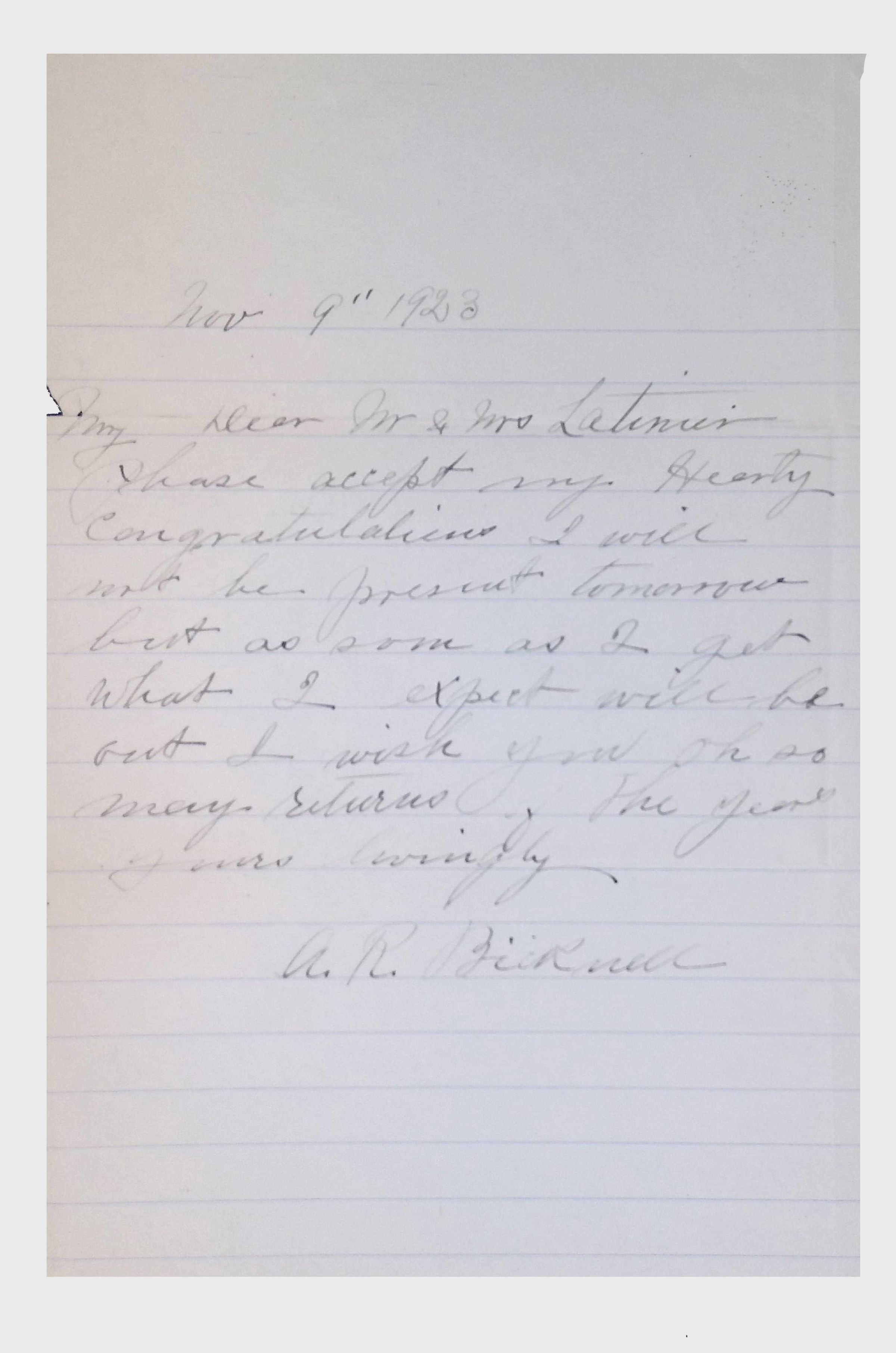 This folder contains a miscellaneous assortment of letters addressed to Lewis H. Latimer, including congratulations to Lewis and Mary Latimer on their Golden wedding anniversary (1923) and “regrets” from invited guests who could not attend their anniversary party, an extended family reminiscence by Lewis Latimer’s nephew Cornelius McKeel (also called “Neal”) at the time of the Latimers’ anniversary, a letter to Lewis Latimer’s daughter Jeannette Norman from W.E.B. DuBois informing her that a song she wrote has been awarded Second Prize in a contest held by The Crisis magazine (1927), and a letter from William H. Meadowcroft, Thomas Edison’s secretary, to Lewis Latimer (1921).Context