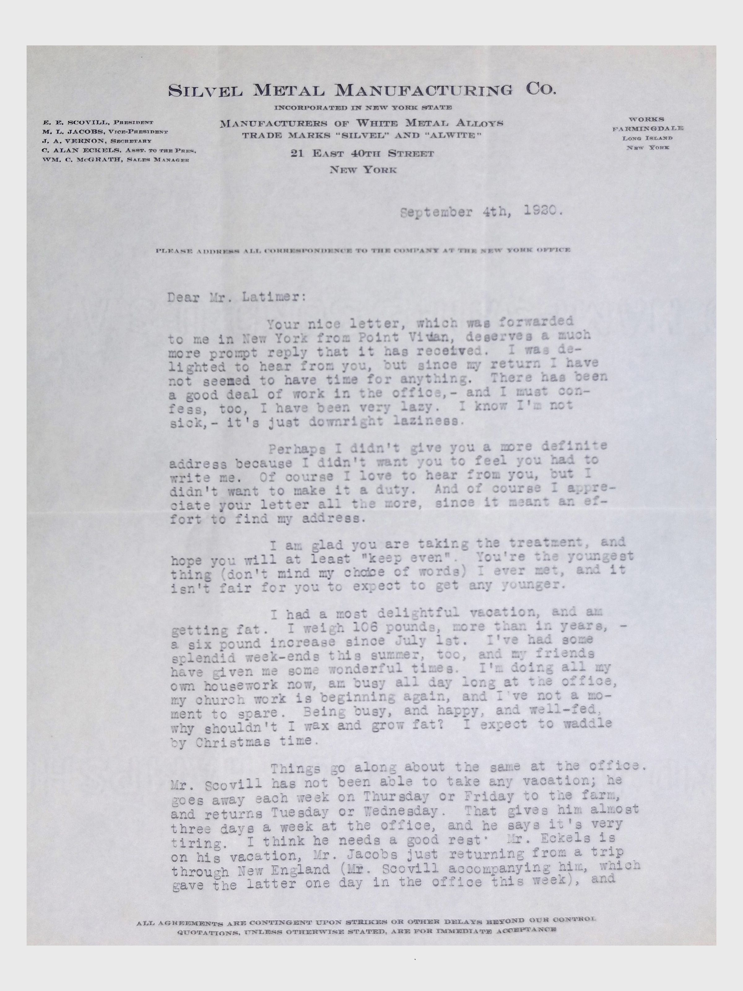 This folder contains a miscellaneous assortment of letters addressed to Lewis H. Latimer, including congratulations to Lewis and Mary Latimer on their Golden wedding anniversary (1923) and “regrets” from invited guests who could not attend their anniversary party, an extended family reminiscence by Lewis Latimer’s nephew Cornelius McKeel (also called “Neal”) at the time of the Latimers’ anniversary, a letter to Lewis Latimer’s daughter Jeannette Norman from W.E.B. DuBois informing her that a song she wrote has been awarded Second Prize in a contest held by The Crisis magazine (1927), and a letter from William H. Meadowcroft, Thomas Edison’s secretary, to Lewis Latimer (1921).Location