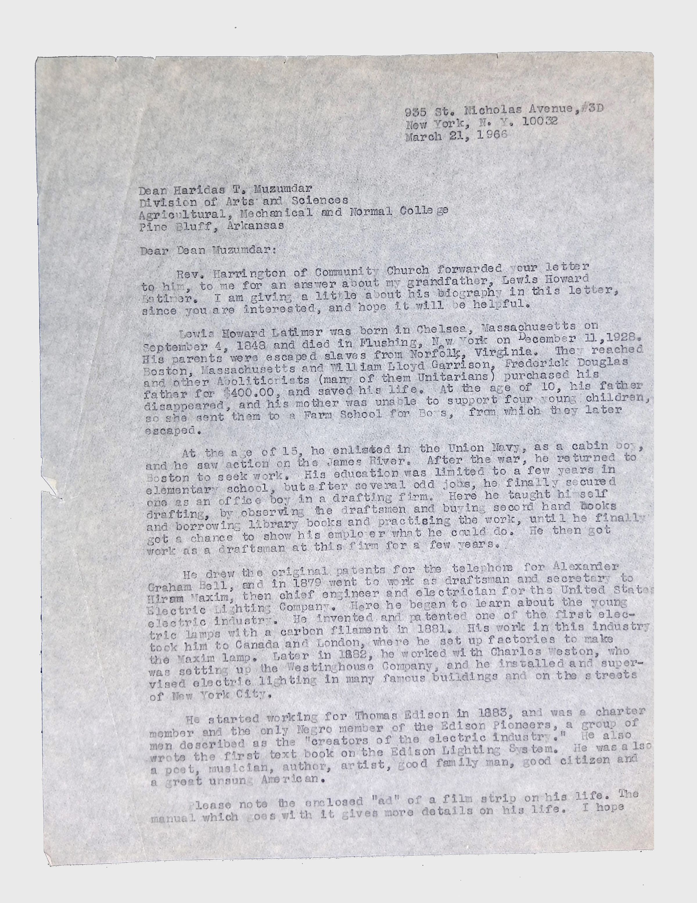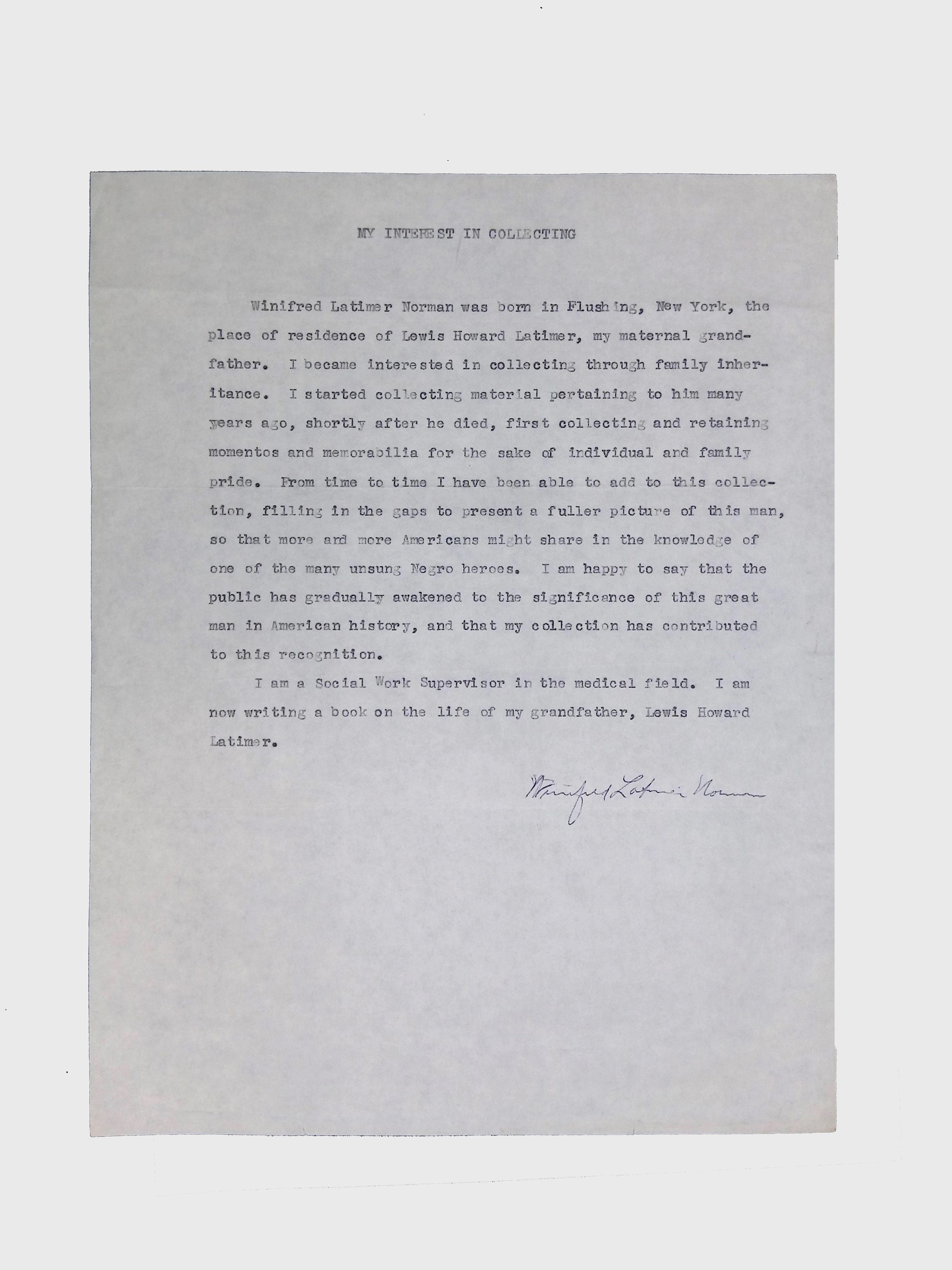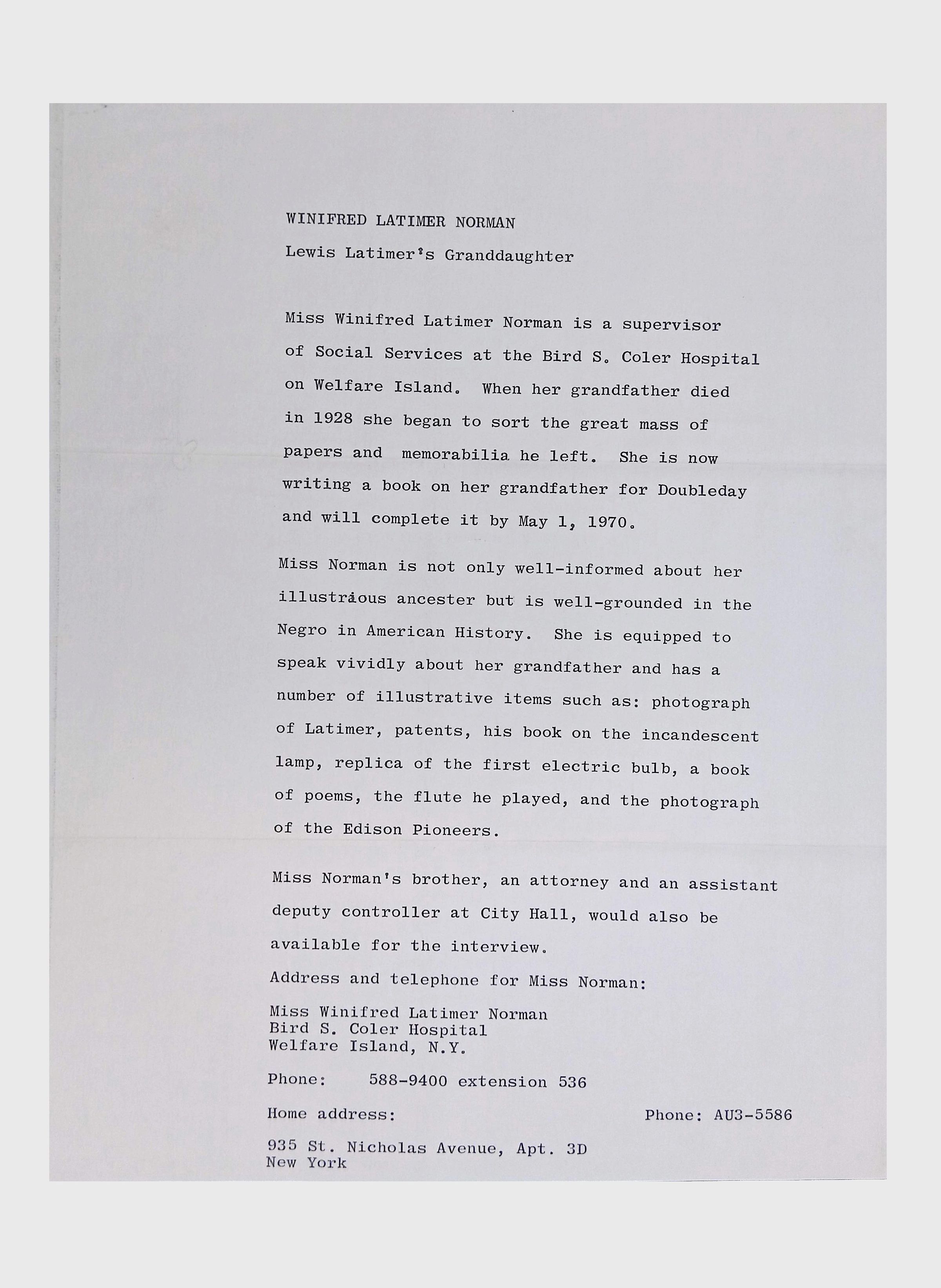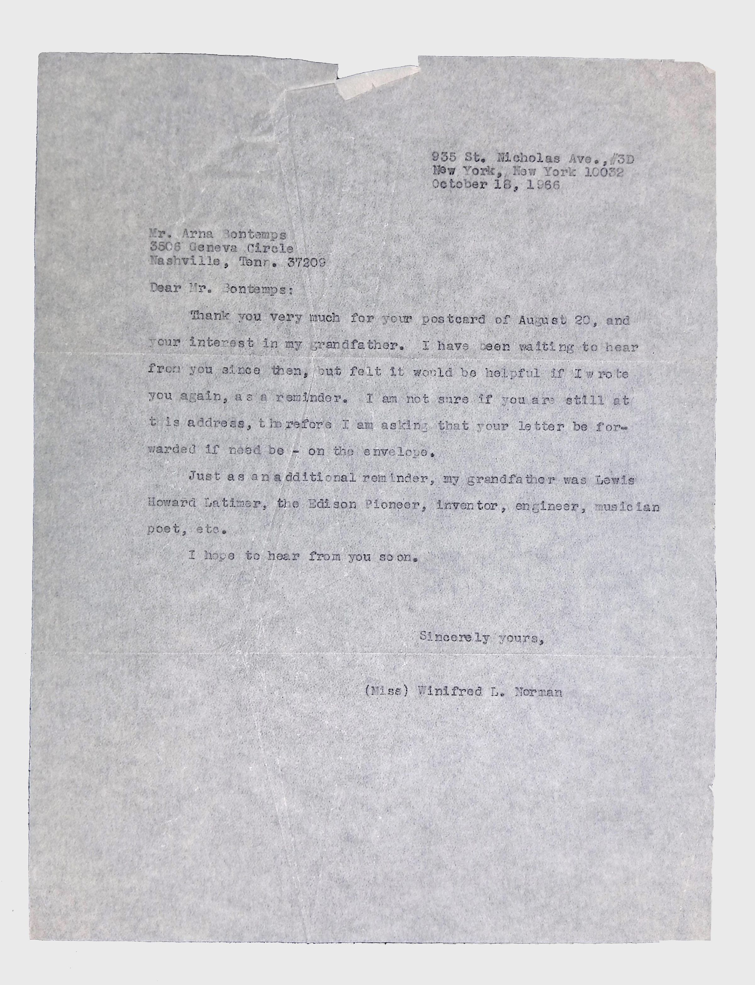 This folder contains correspondence, most or all of it belonging to Lewis Latimer’s granddaughter Winifred Norman, who worked tirelessly to recognize and honor Latimer’s achievements. Notable correspondents include the Harlem writer Arna Bontemps and Senator Robert F. Kennedy. Other letters document the creation of a sculptural bust of Lewis Latimer and other historical Black figures, and the recollections of George A. Latimer, Lewis Latimer’s nephew (although this should be used with caution since the writer erroneously states that his own father, Lewis’s brother George Latimer, Jr., was born in London).Context