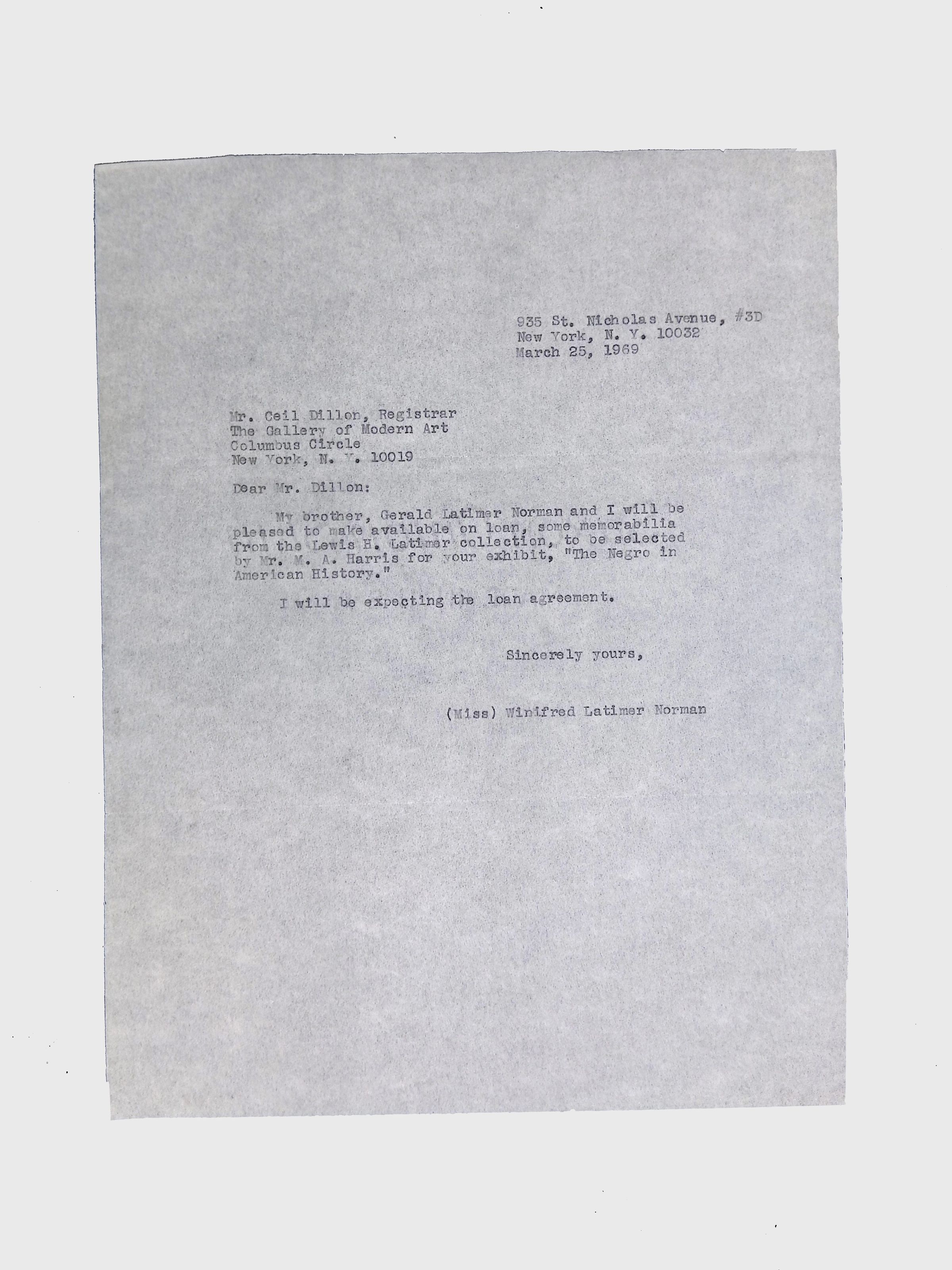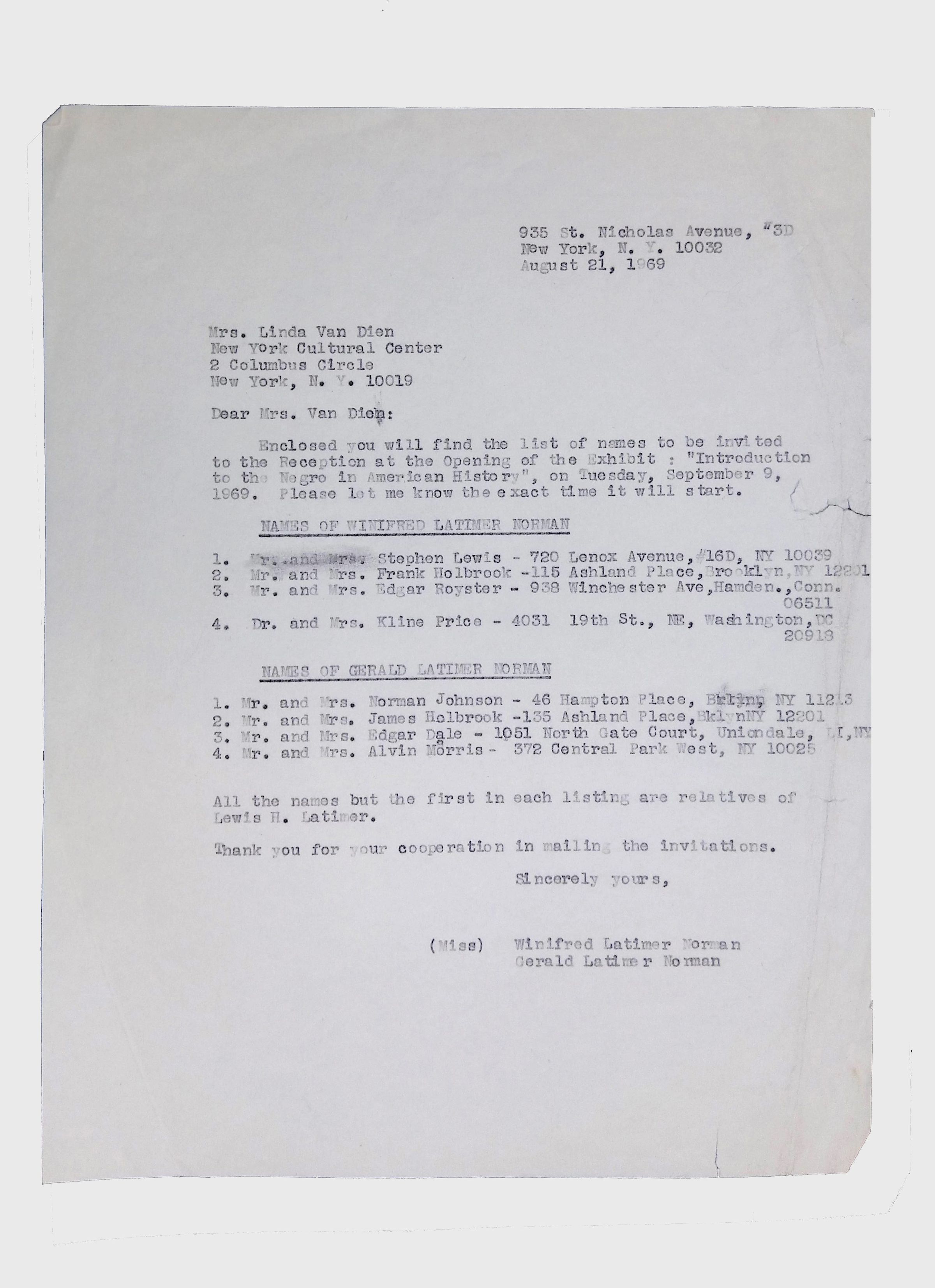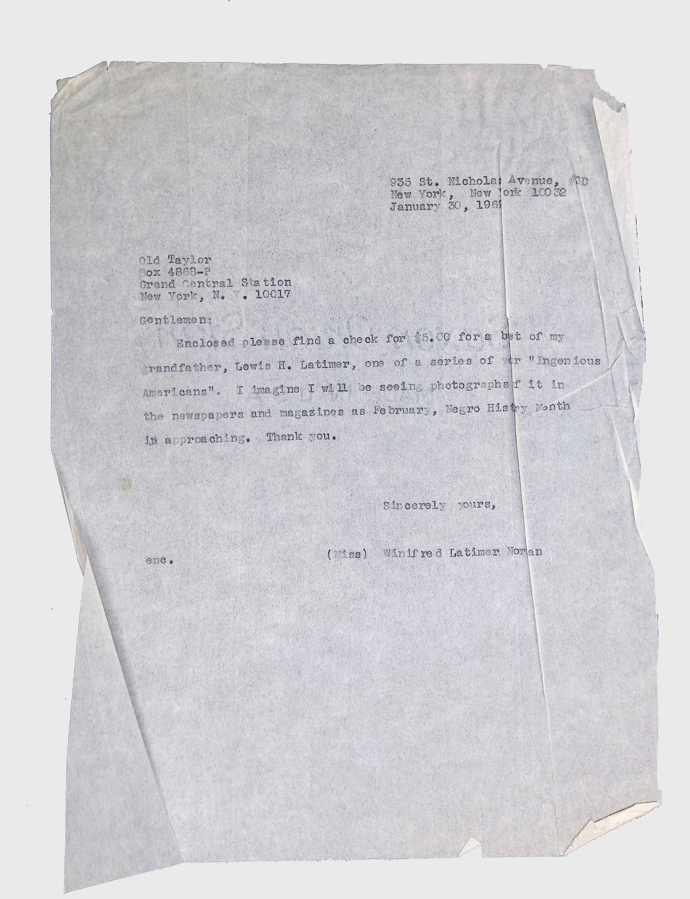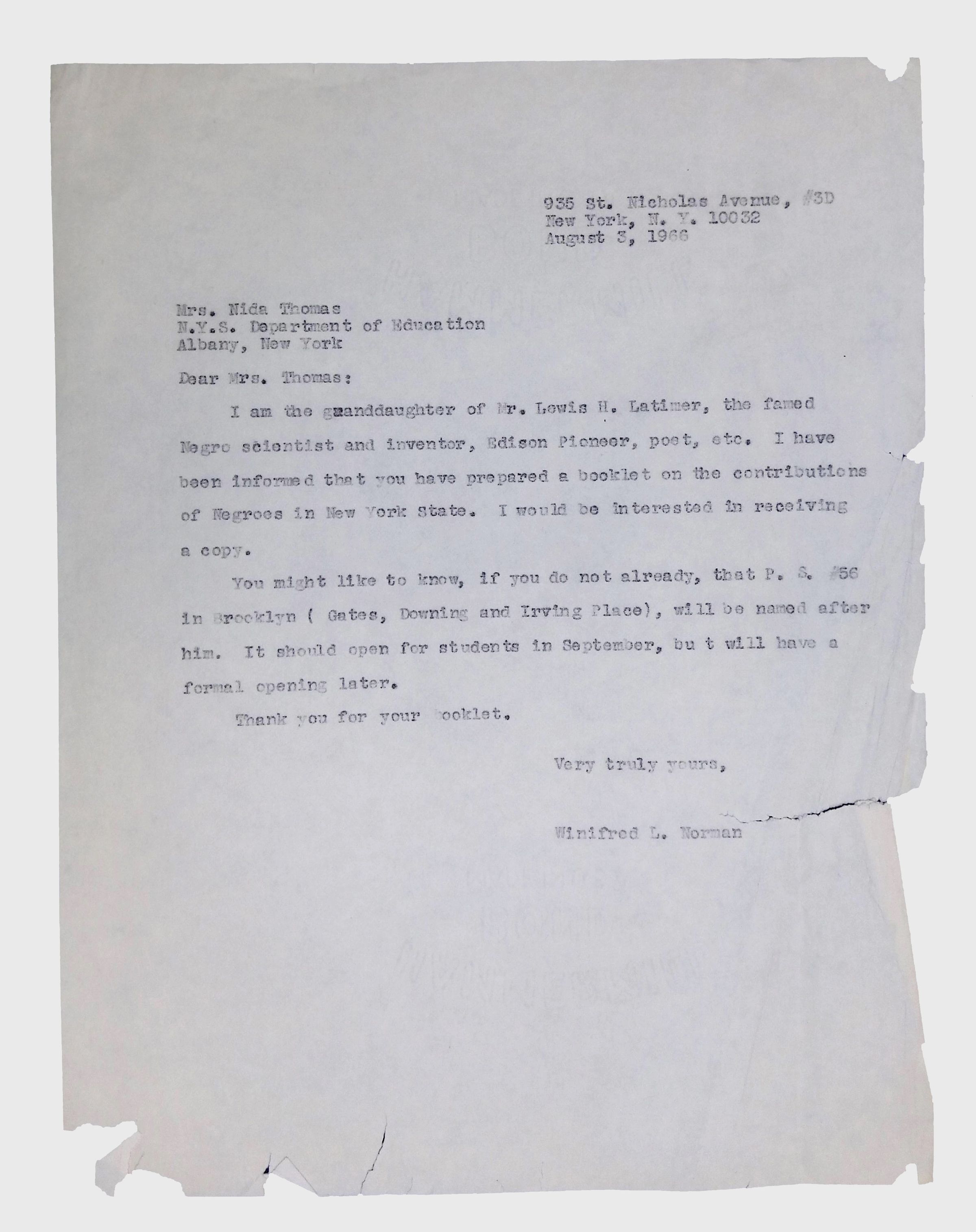 This folder contains correspondence, most or all of it belonging to Lewis Latimer’s granddaughter Winifred Norman, who worked tirelessly to recognize and honor Latimer’s achievements. Notable correspondents include the Harlem writer Arna Bontemps and Senator Robert F. Kennedy. Other letters document the creation of a sculptural bust of Lewis Latimer and other historical Black figures, and the recollections of George A. Latimer, Lewis Latimer’s nephew (although this should be used with caution since the writer erroneously states that his own father, Lewis’s brother George Latimer, Jr., was born in London).Context
