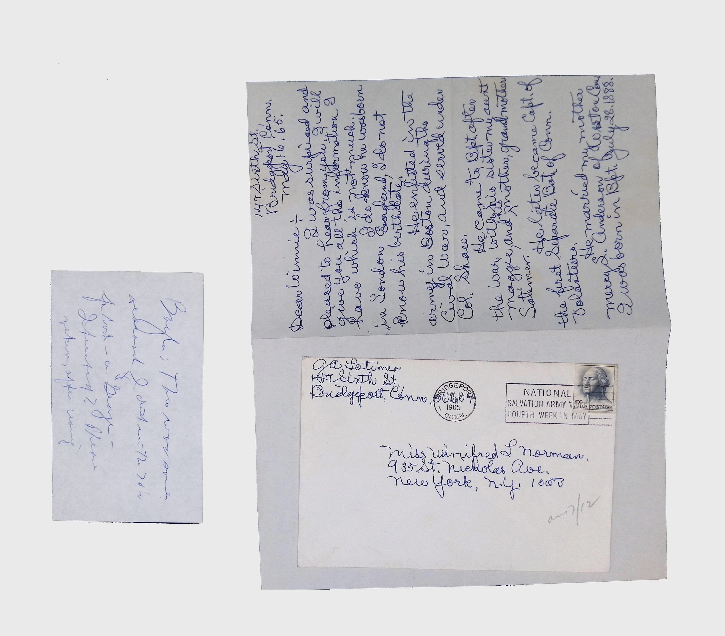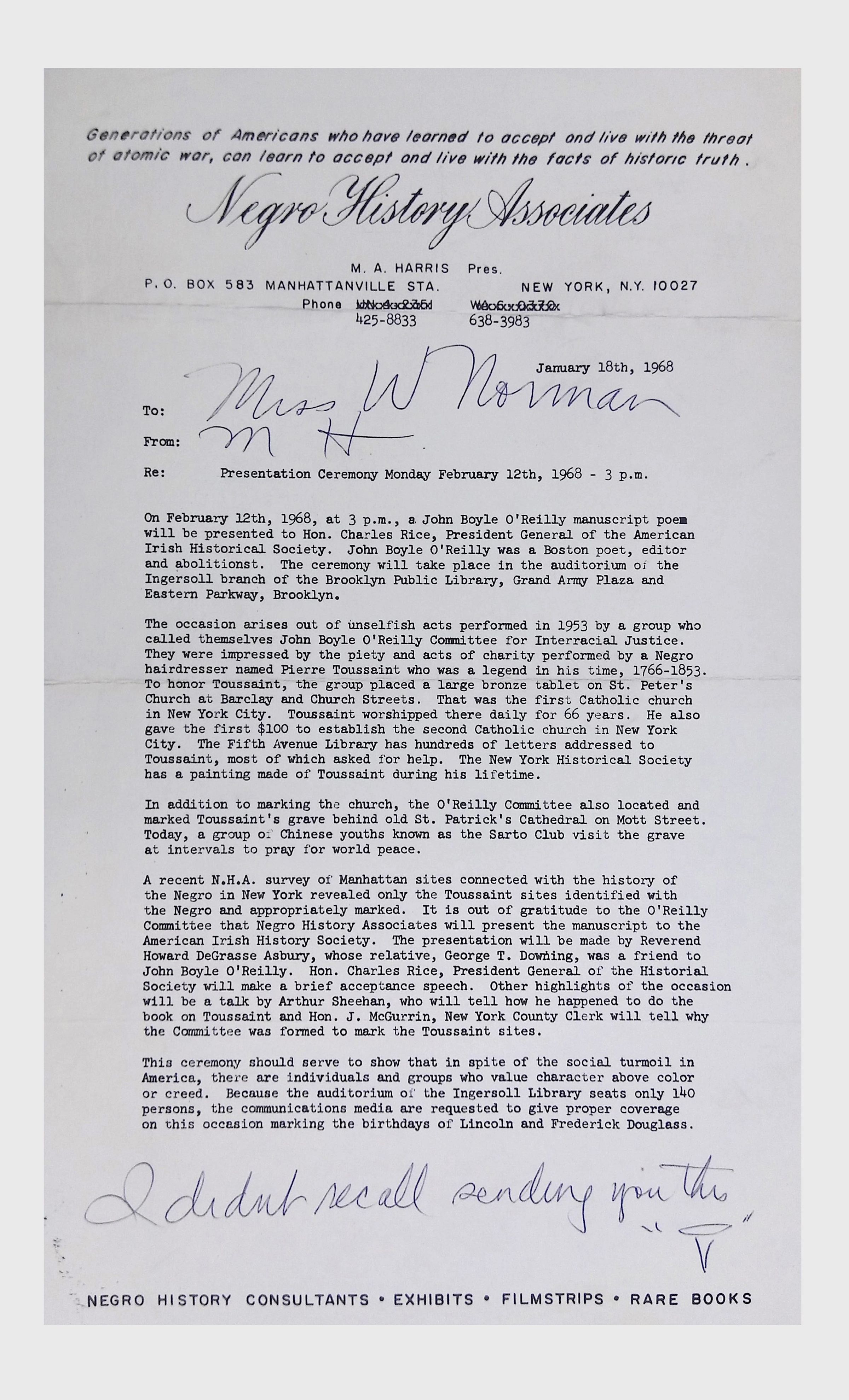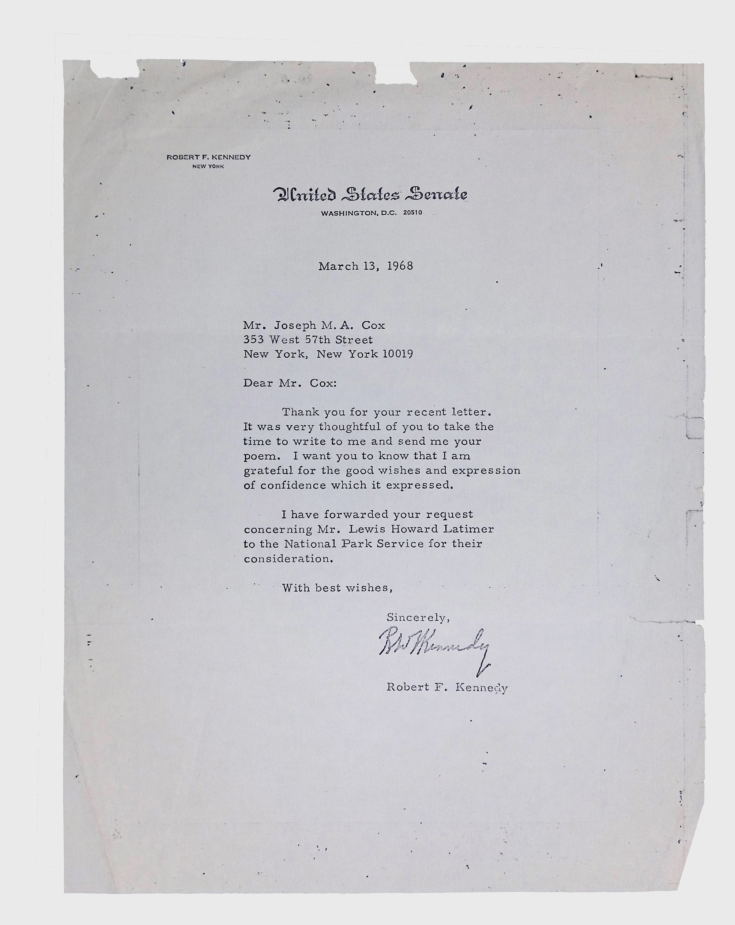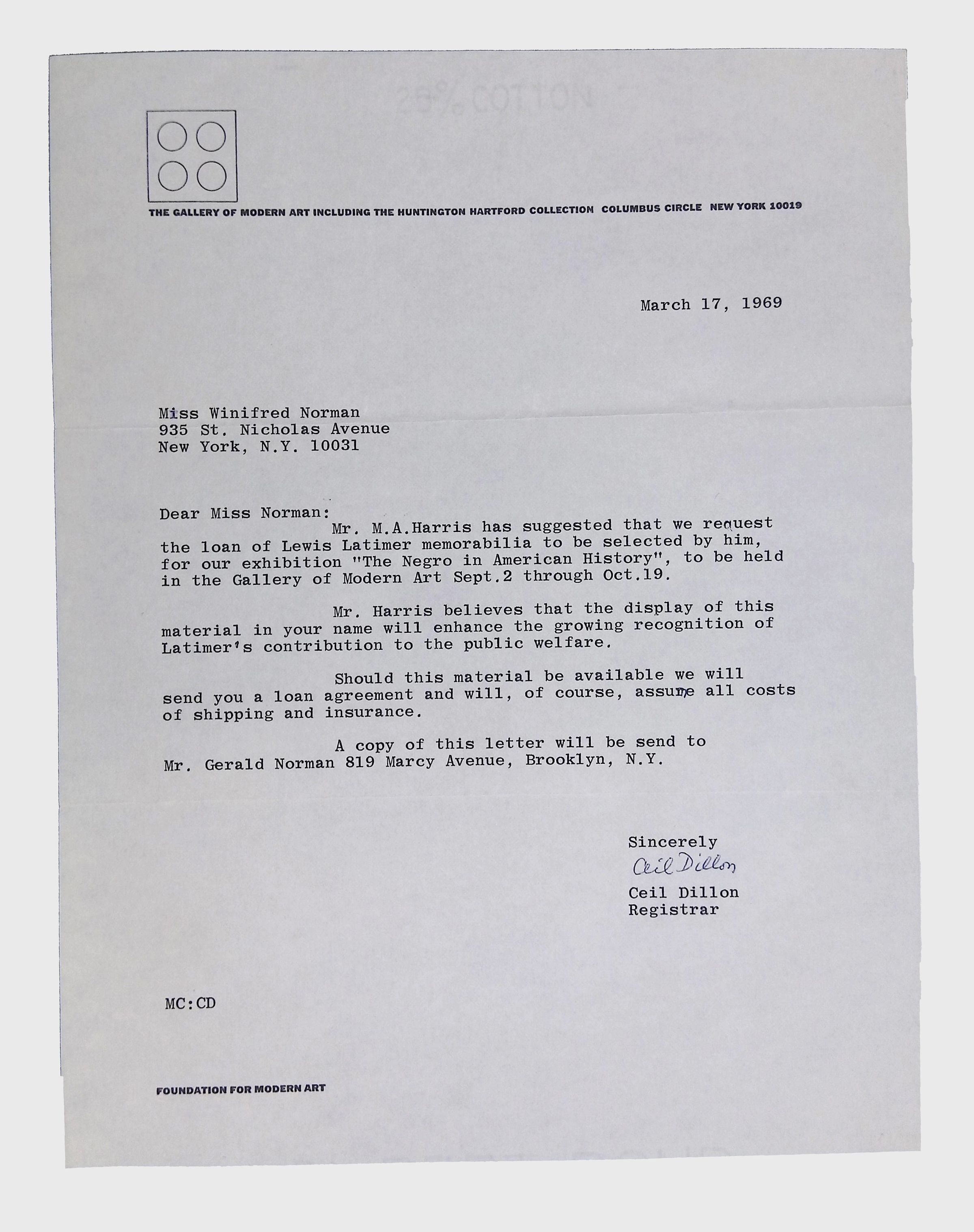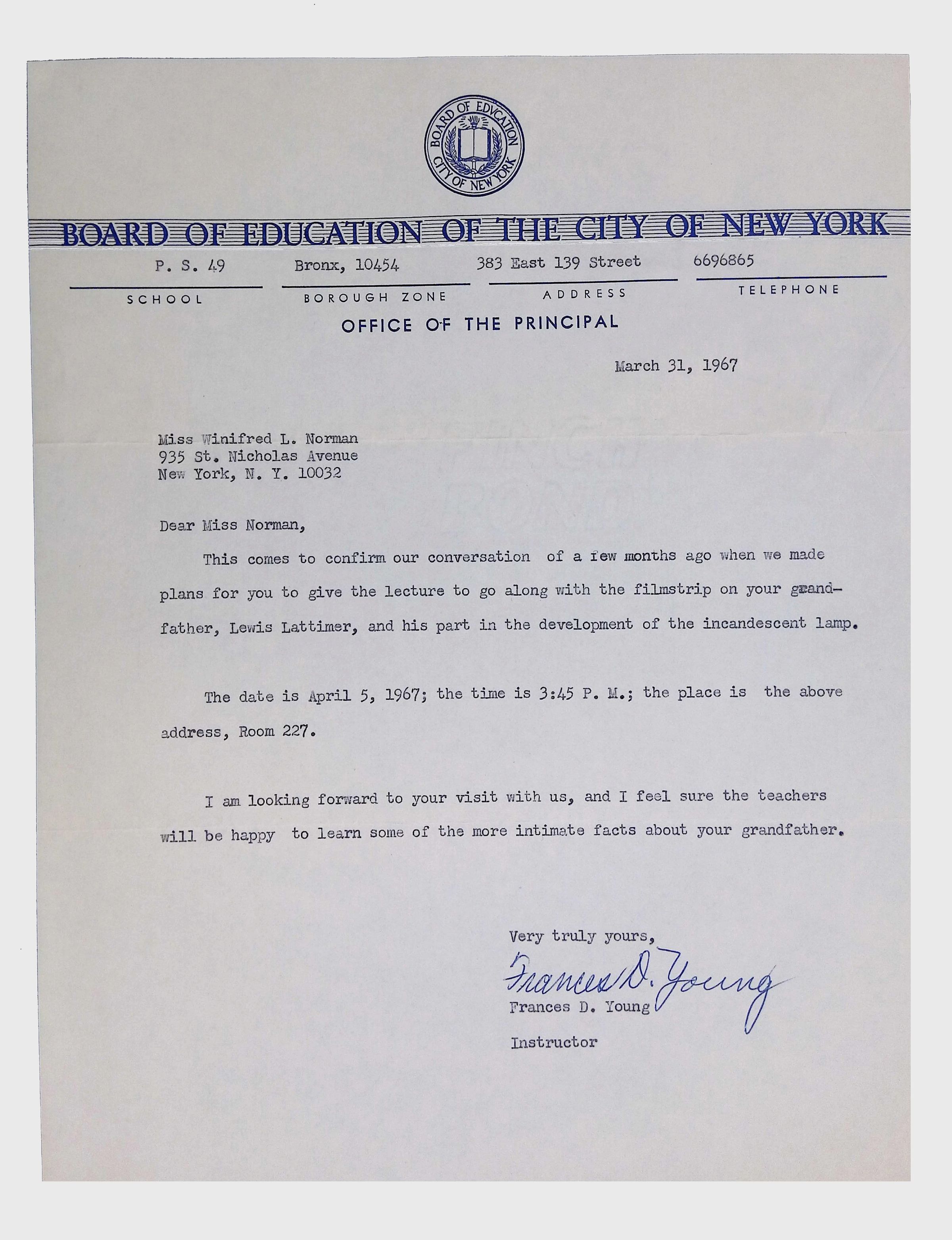 This folder contains correspondence, most or all of it belonging to Lewis Latimer’s granddaughter Winifred Norman, who worked tirelessly to recognize and honor Latimer’s achievements. Notable correspondents include the Harlem writer Arna Bontemps and Senator Robert F. Kennedy. Other letters document the creation of a sculptural bust of Lewis Latimer and other historical Black figures, and the recollections of George A. Latimer, Lewis Latimer’s nephew (although this should be used with caution since the writer erroneously states that his own father, Lewis’s brother George Latimer, Jr., was born in London).Context